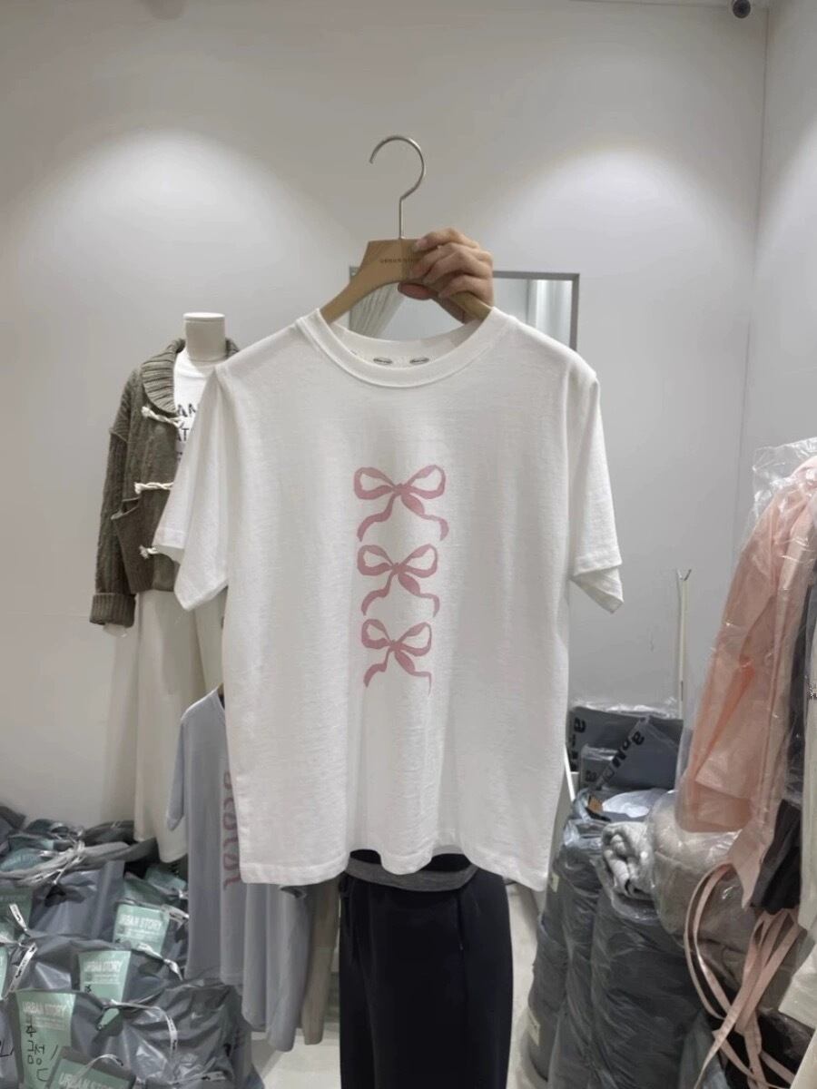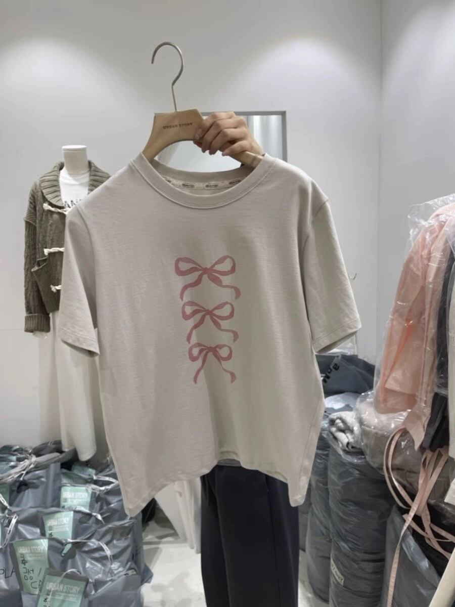Tシャツ カジュアル スウェット トップス グレー ベージュ ブラウス リボン ピンク