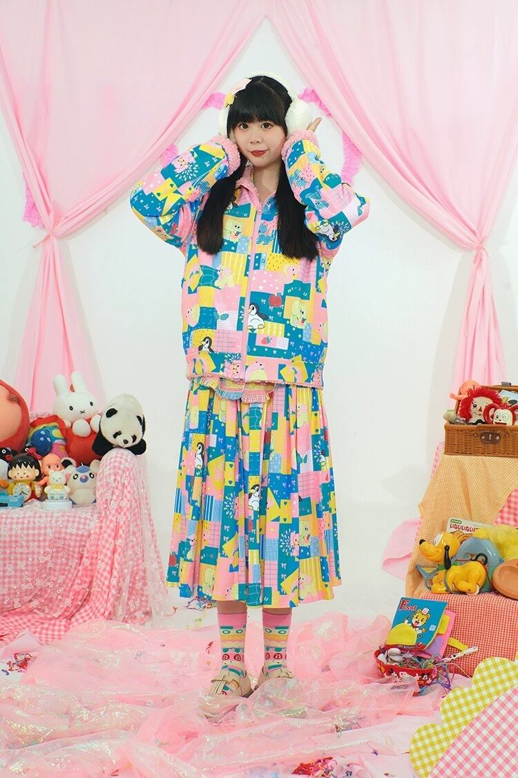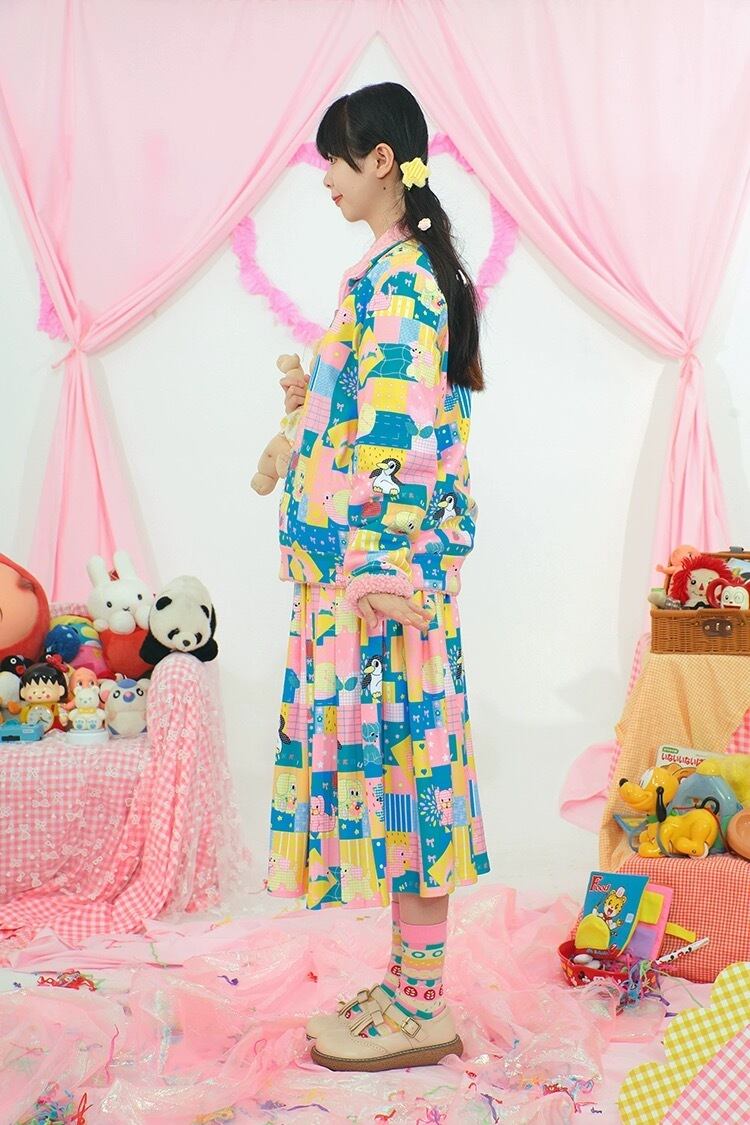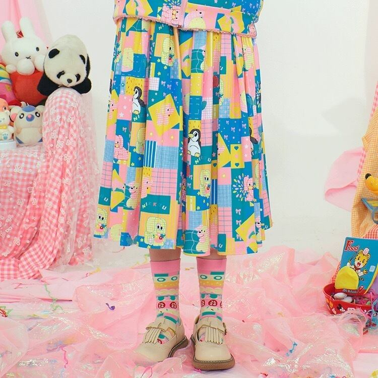 プリーツスカート カラフル パッチワーク 可愛い チェック 原宿 古着 黄色 可愛い ガーリー パッチワーク レトロ 水色 ゆったり