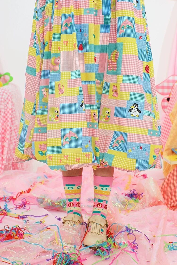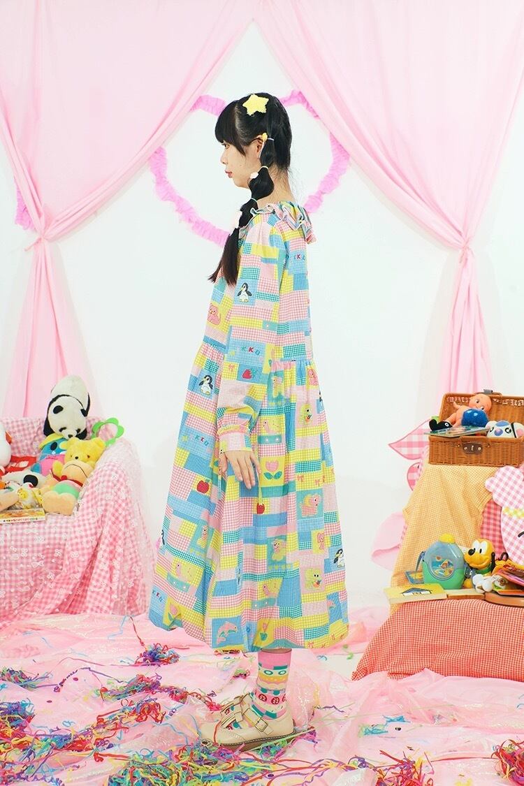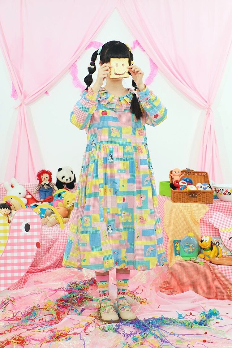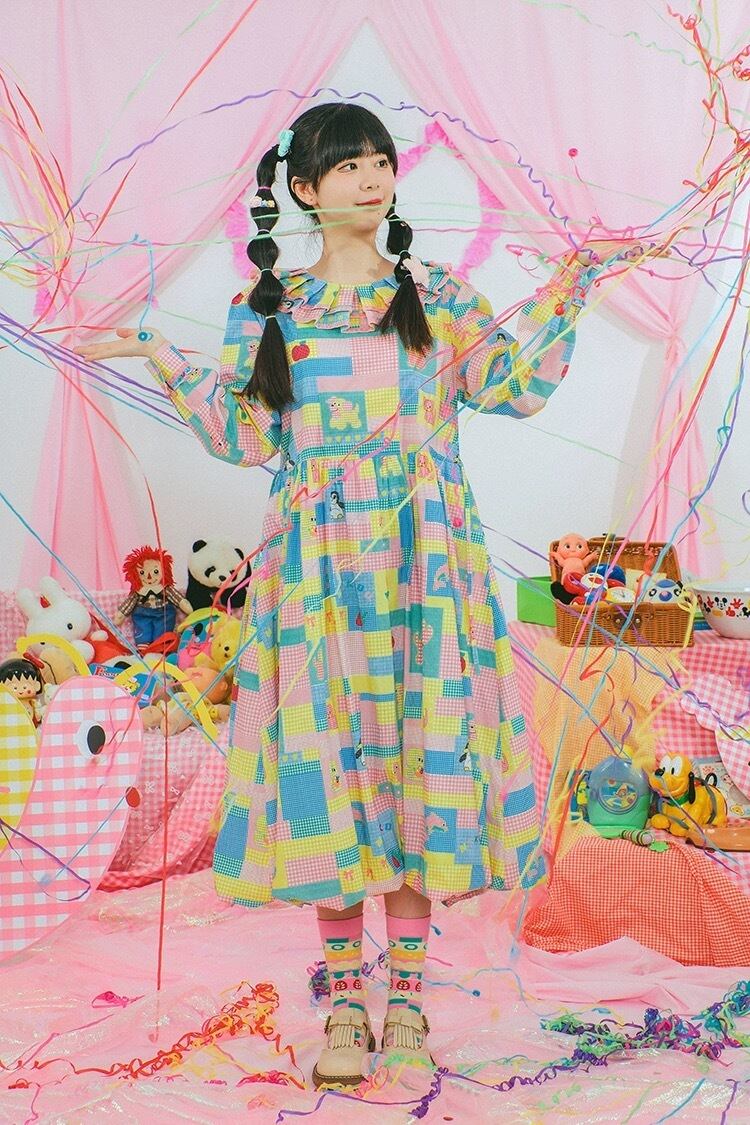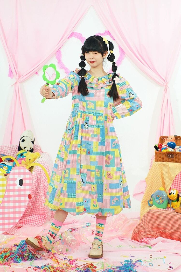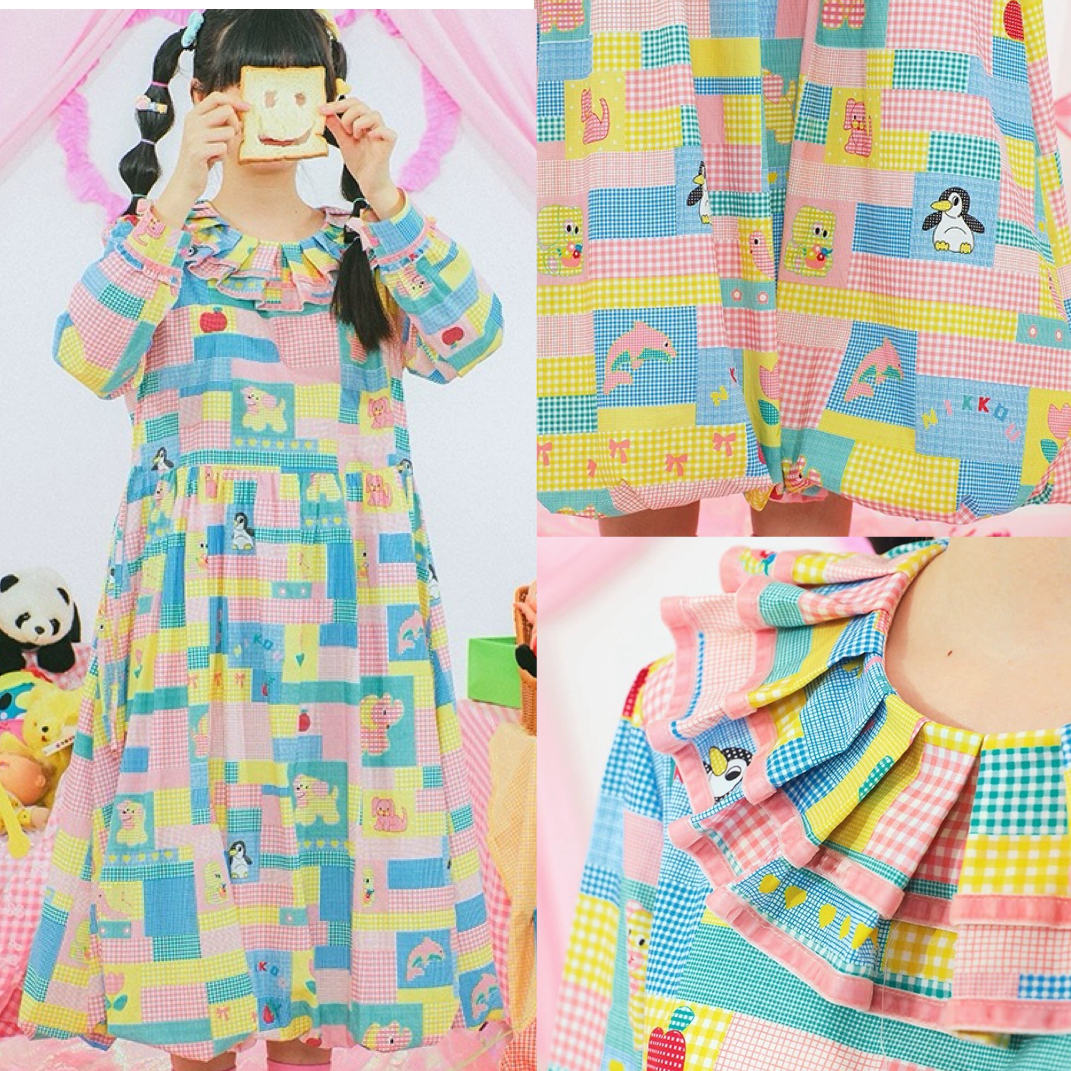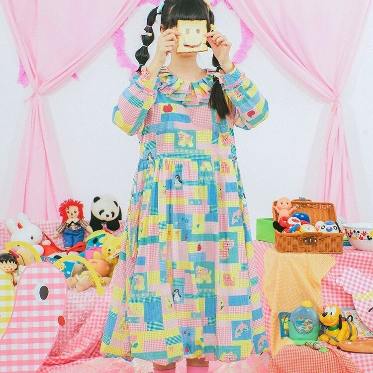 ワンピース ブラウス ピンク 黄色 カラフル パッチワーク 可愛い チェック 原宿 古着 黄色 可愛い ガーリー パッチワーク レトロ 水色 ゆったり