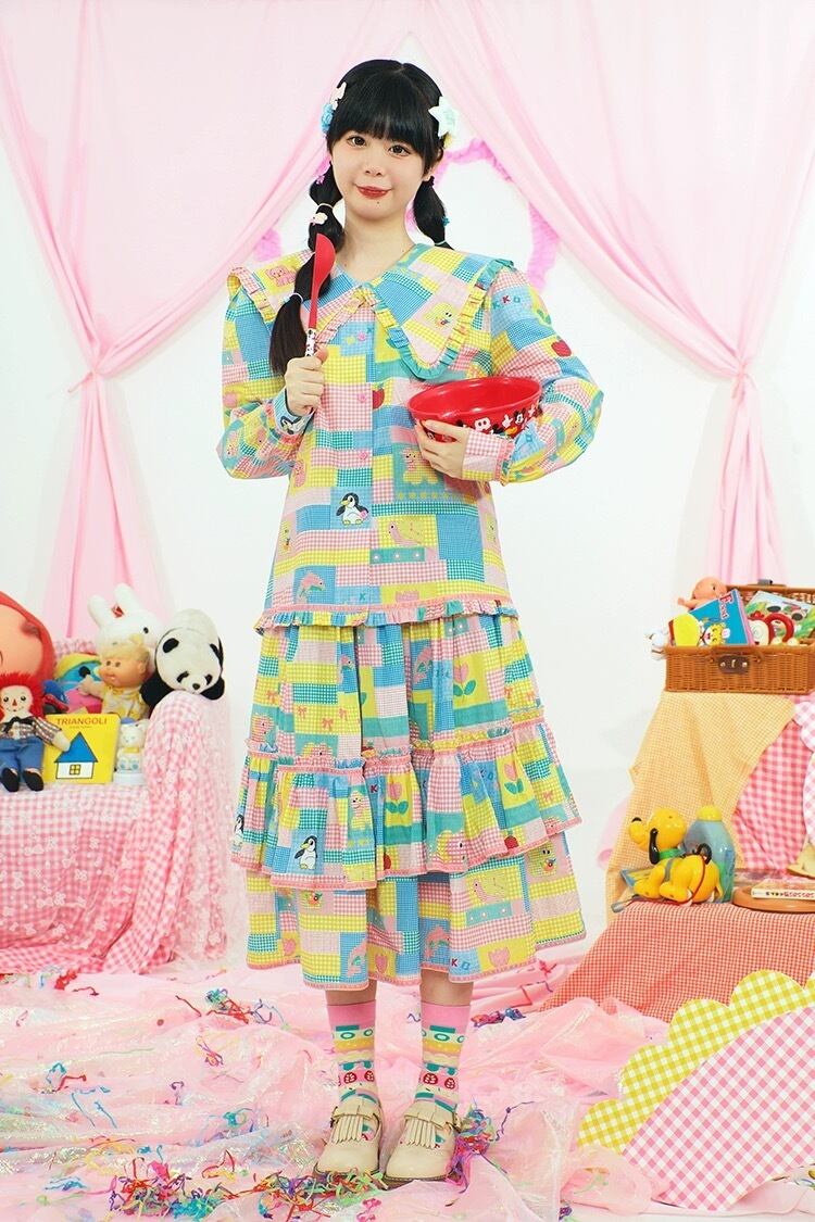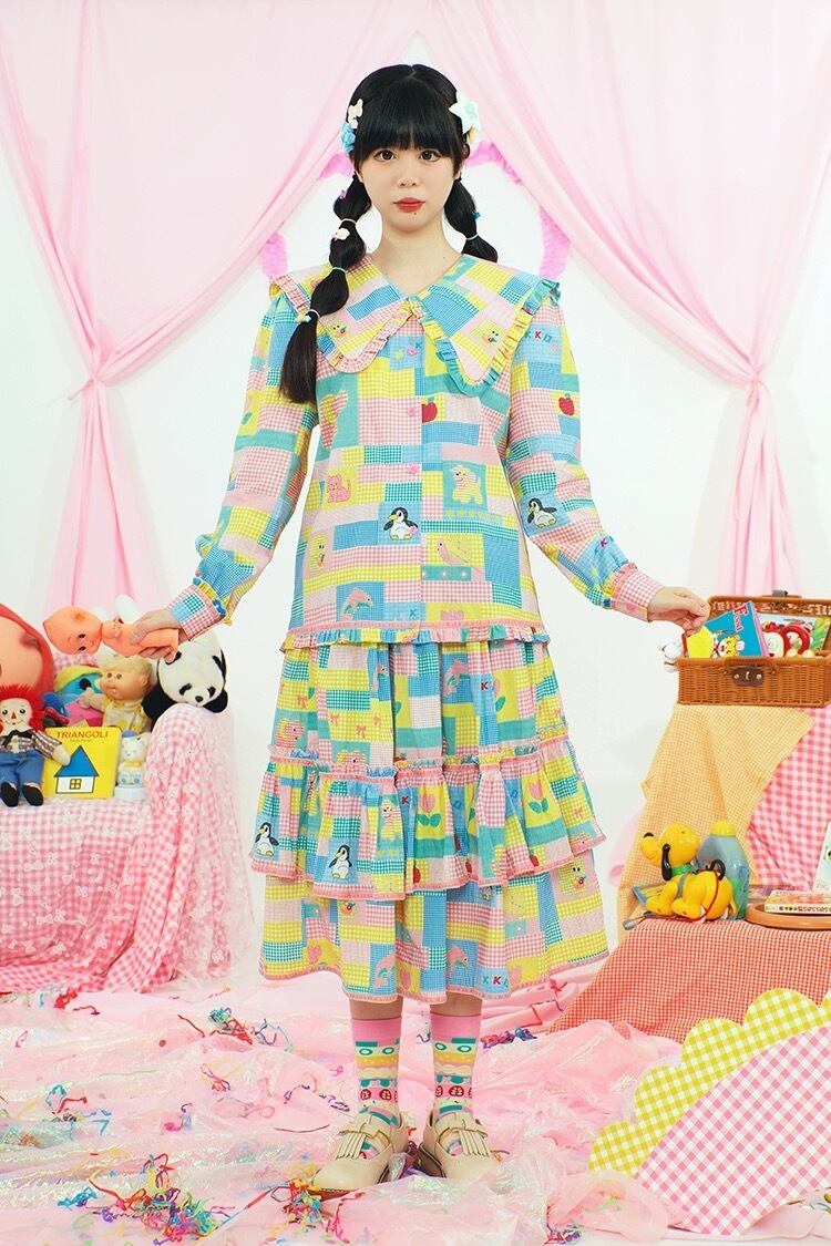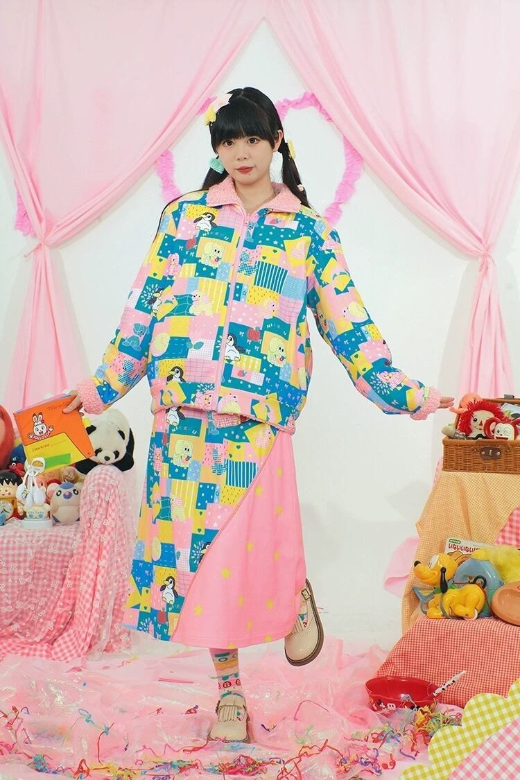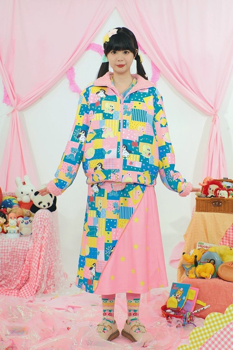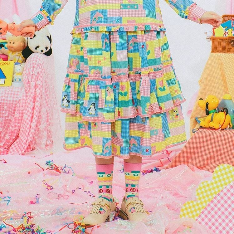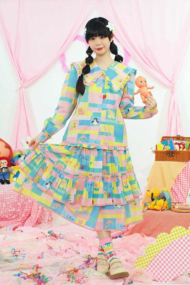 スカート ピンク 黄色 ボトムス カラフル パッチワーク 可愛い チェック 原宿 古着 黄色 可愛い ガーリー パッチワーク レトロ 水色 ゆったり