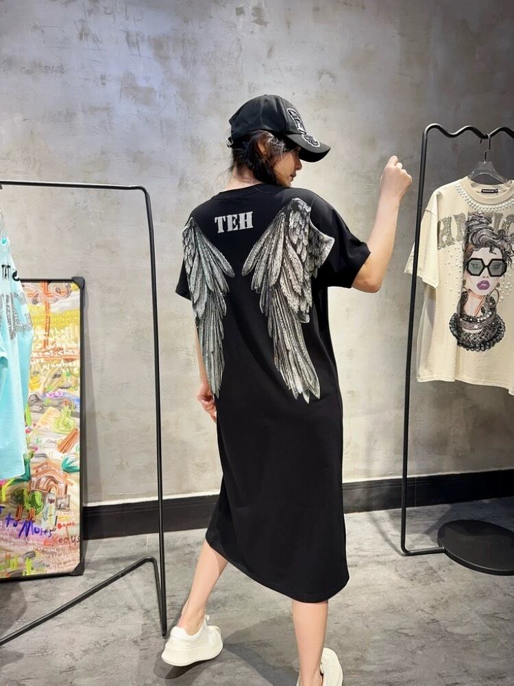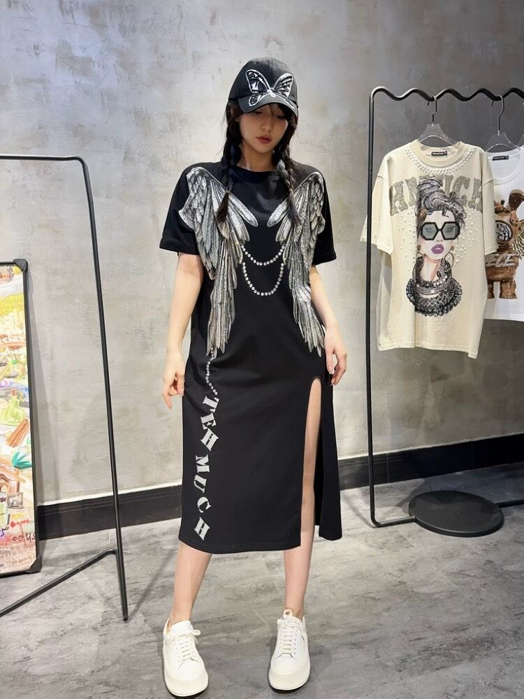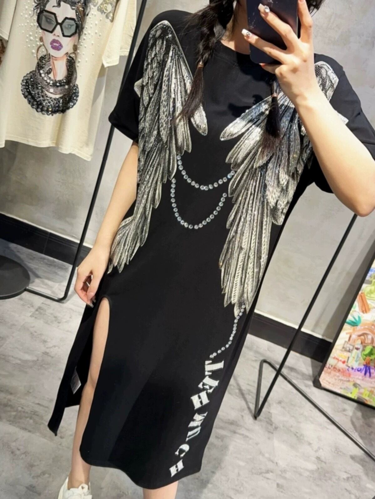 黒 ワンピース スリット ストリート 羽根 XLまで ゆったり カジュアル ワンピース トップス ベージュ ラインストーン サングラス カジュアル デコレーション ストリート ブラック