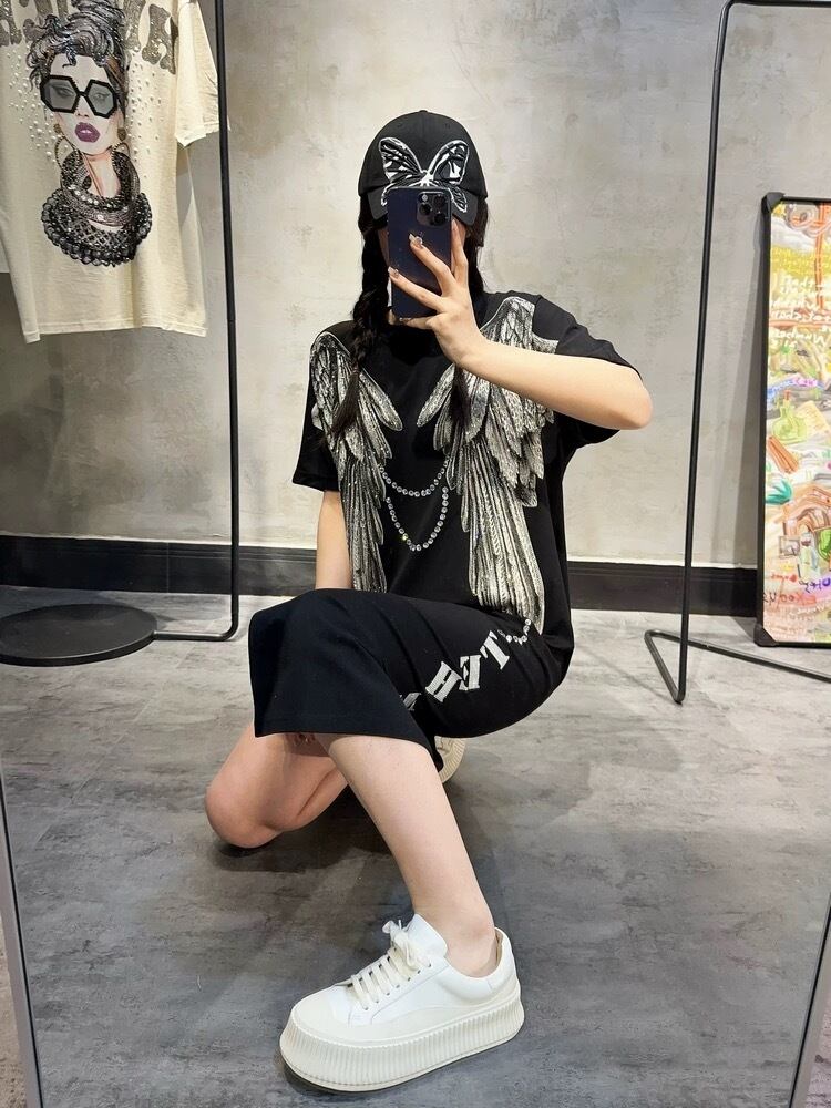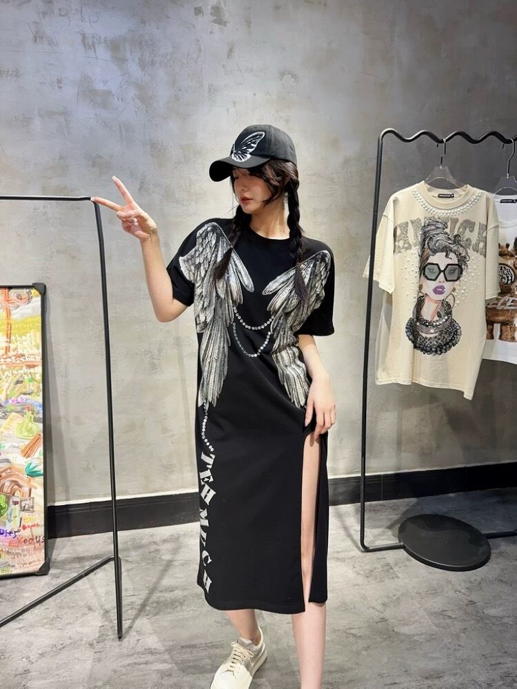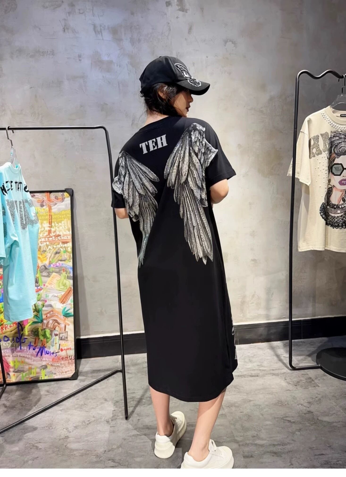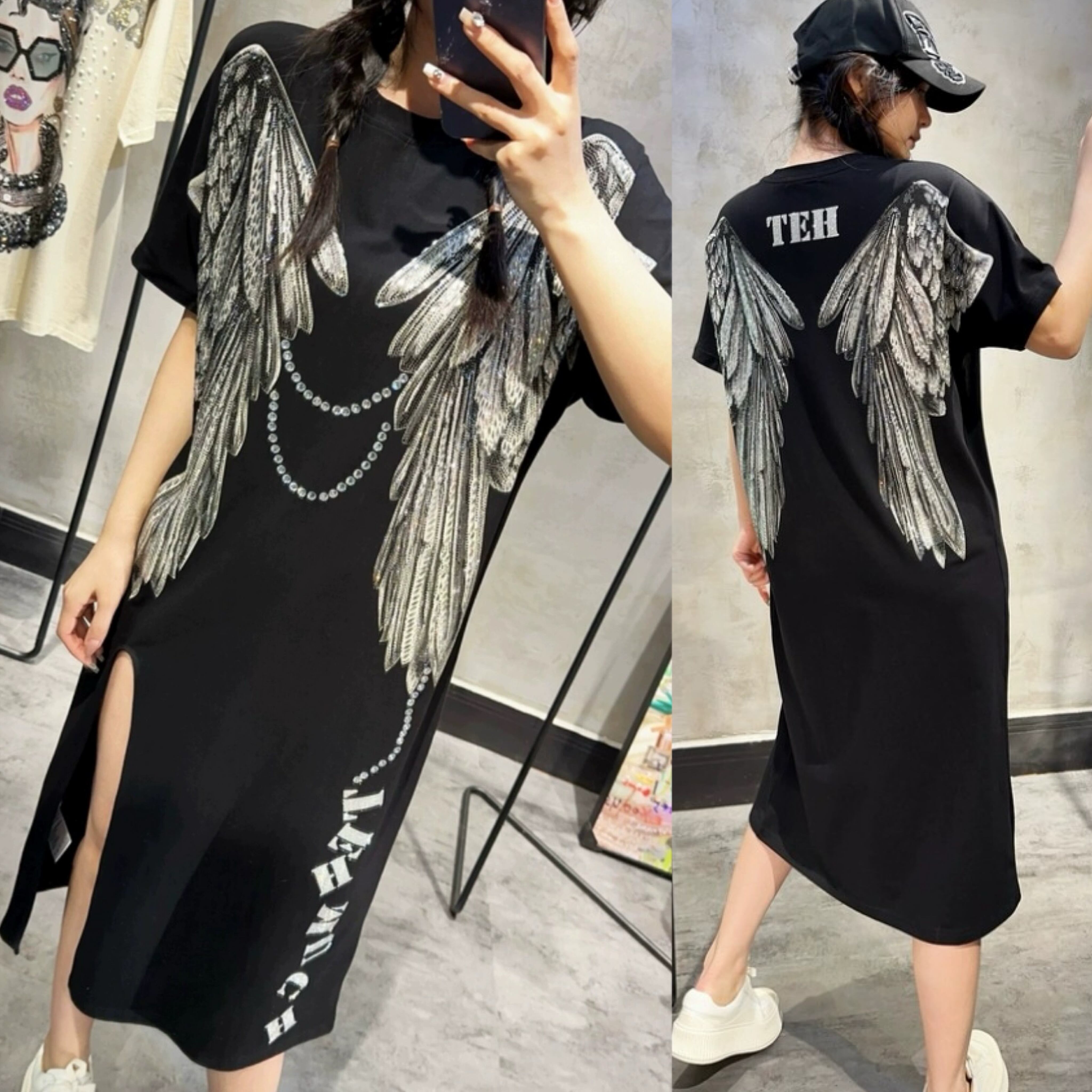 黒 ワンピース スリット ストリート 羽根 XLまで ゆったり カジュアル ワンピース トップス ベージュ ラインストーン サングラス カジュアル デコレーション ストリート ブラック