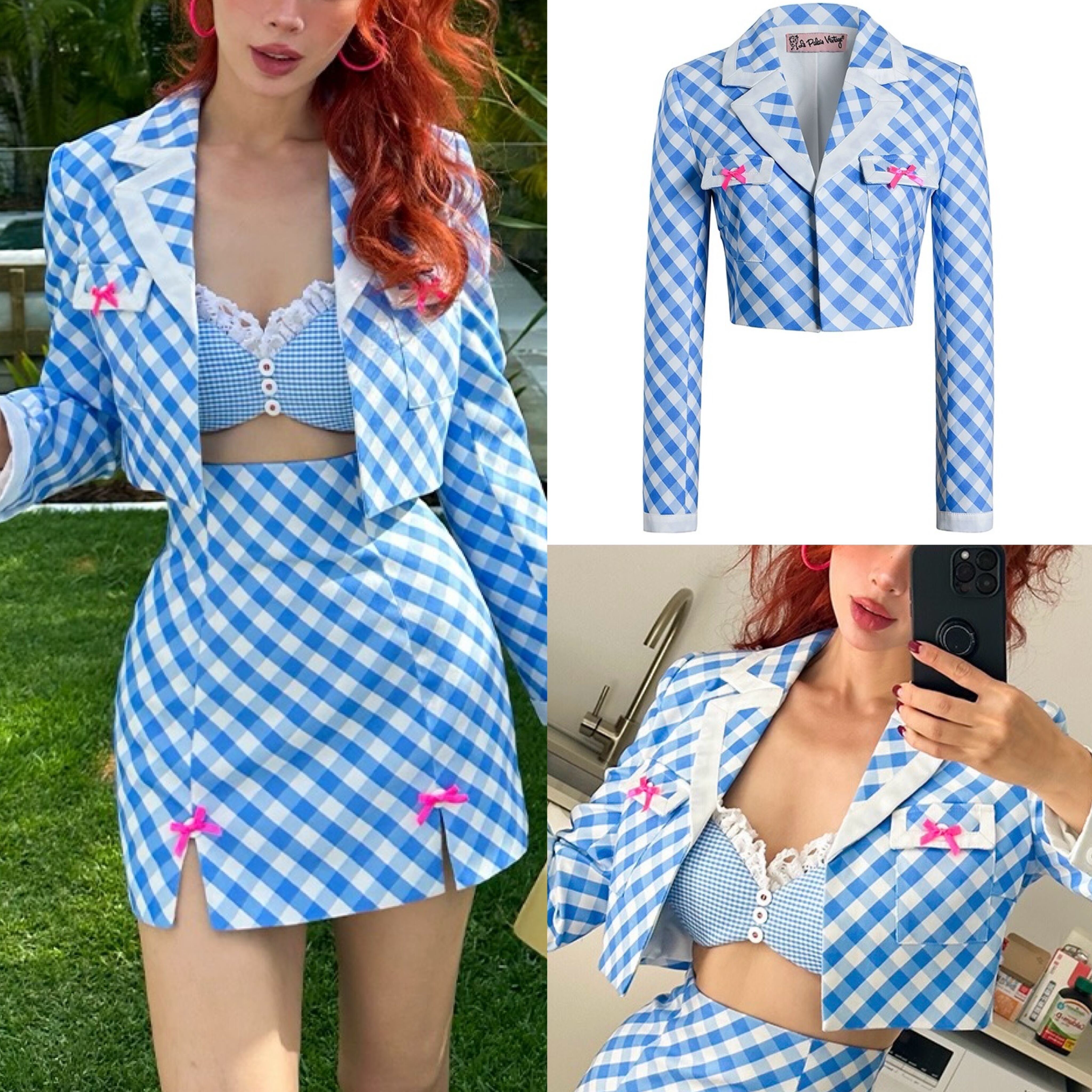 【ジャケット】水色 チェック トップ アウター ジャケット ピンク リボン