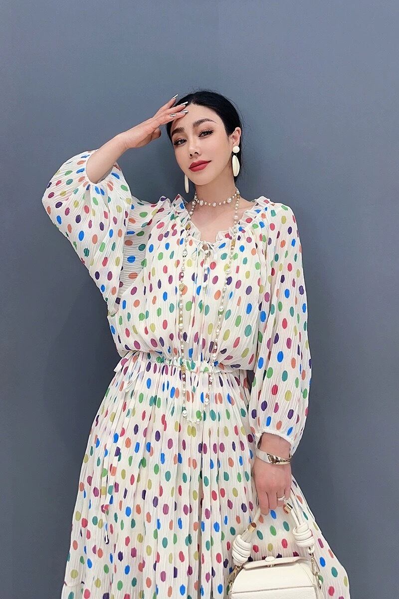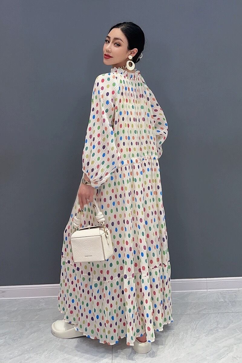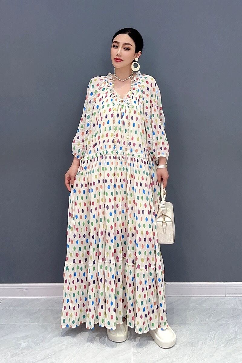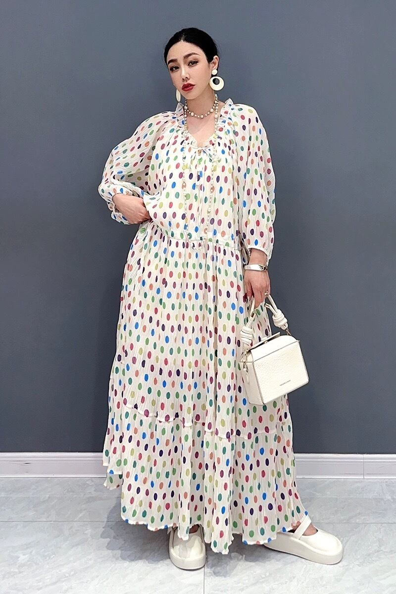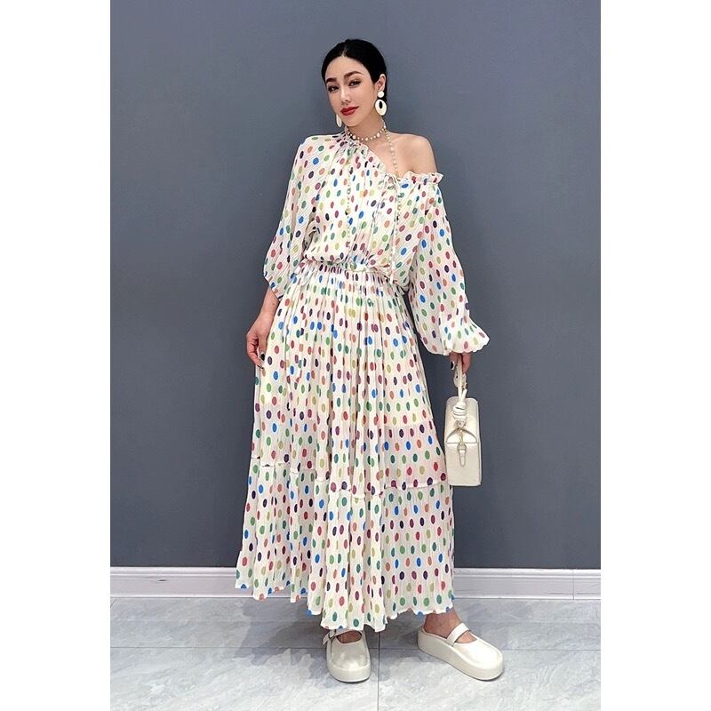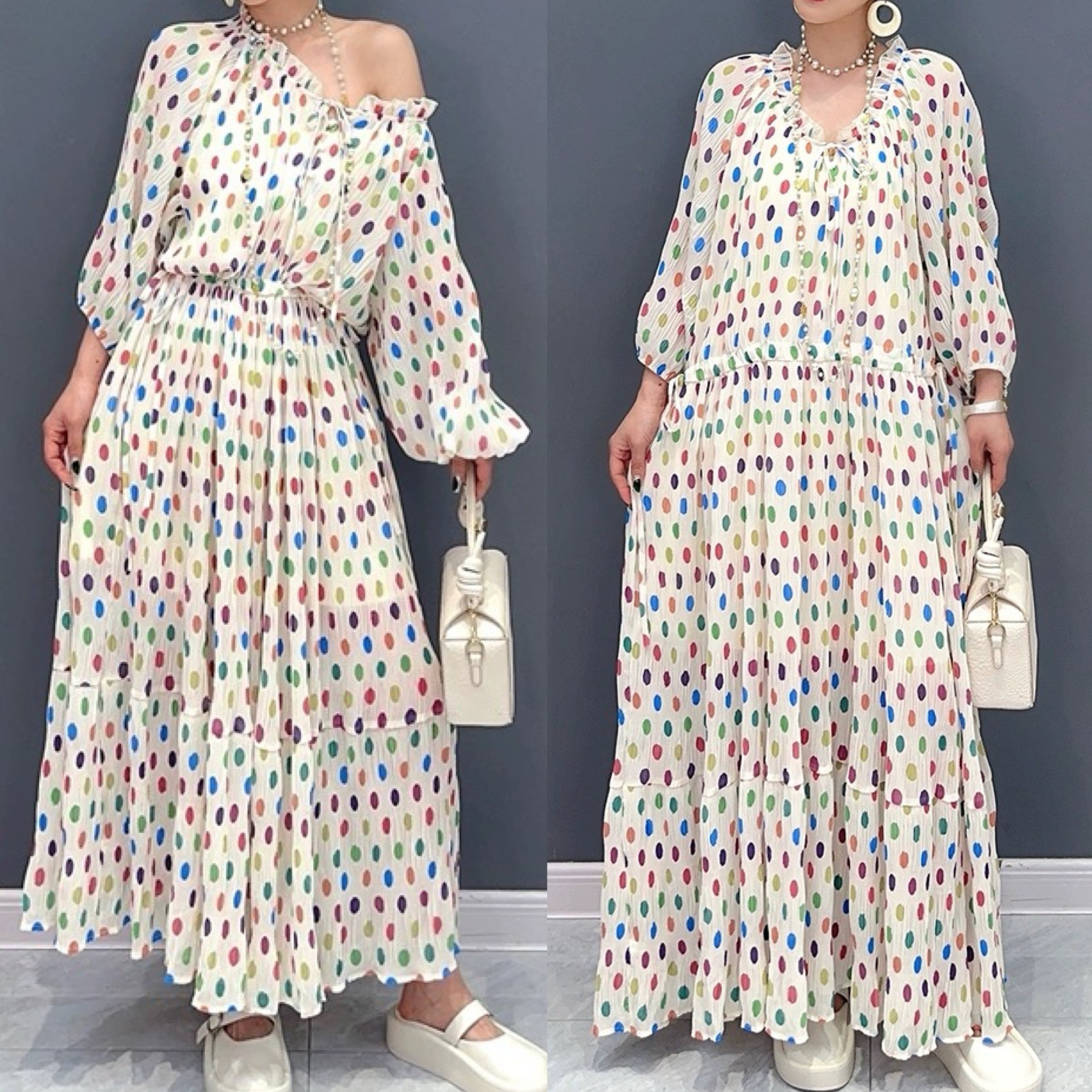 水玉 ドット ワンピース カラフル 白 花柄 フラワー エレガント マキシ ワンピース ドレス オレンジ オフショルダー XL