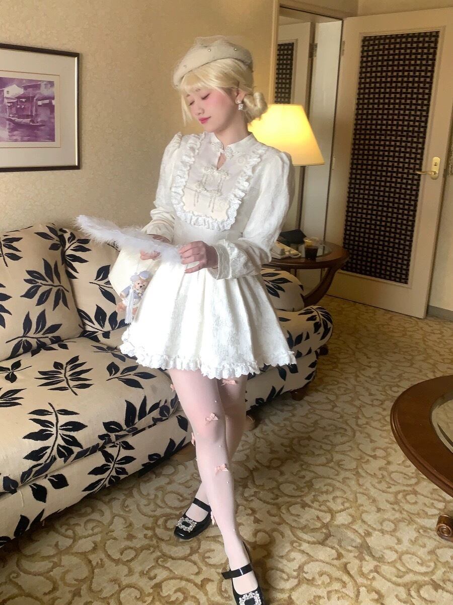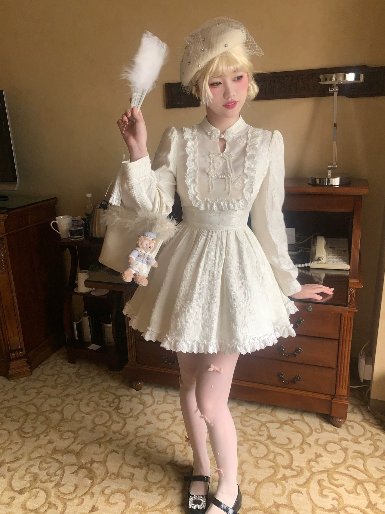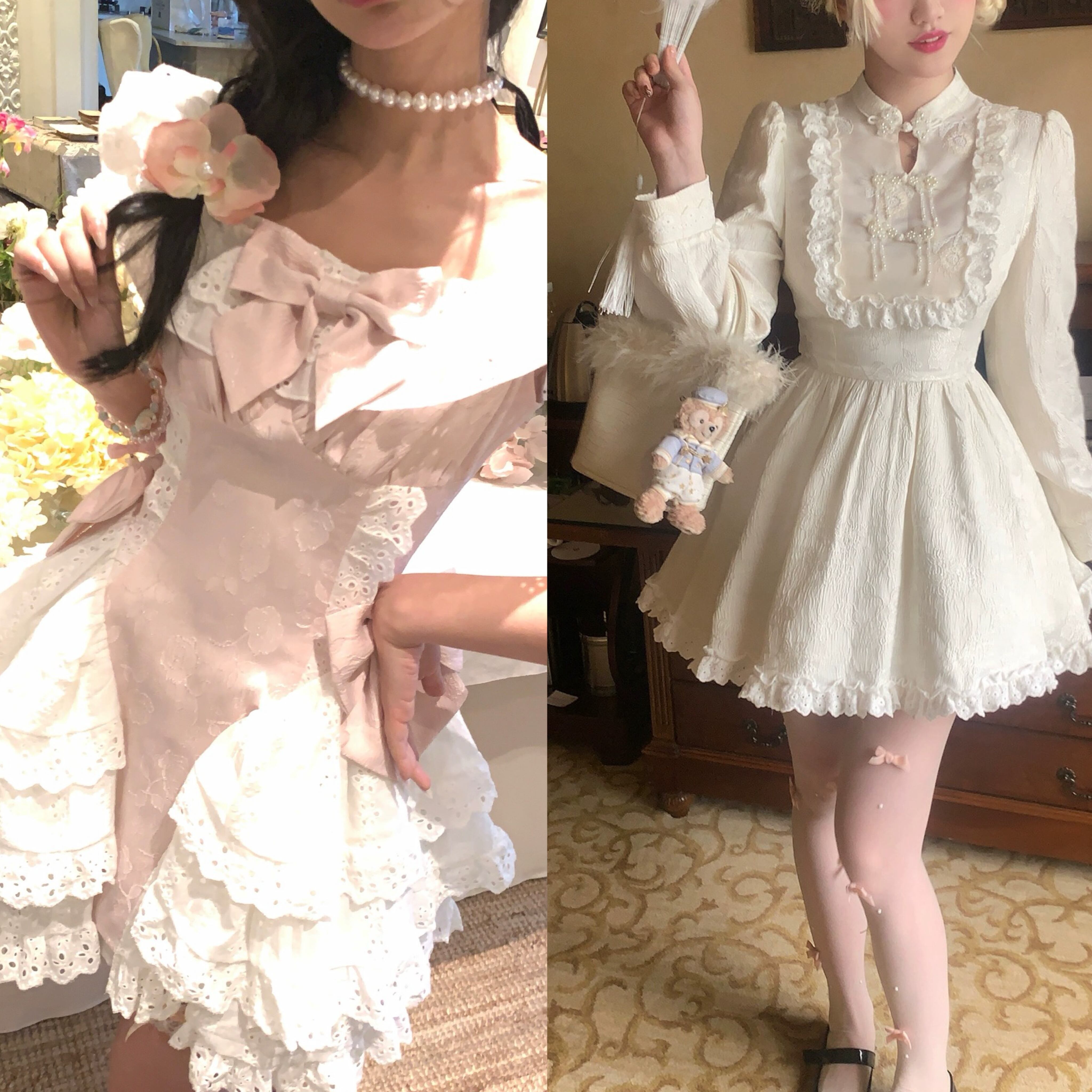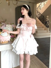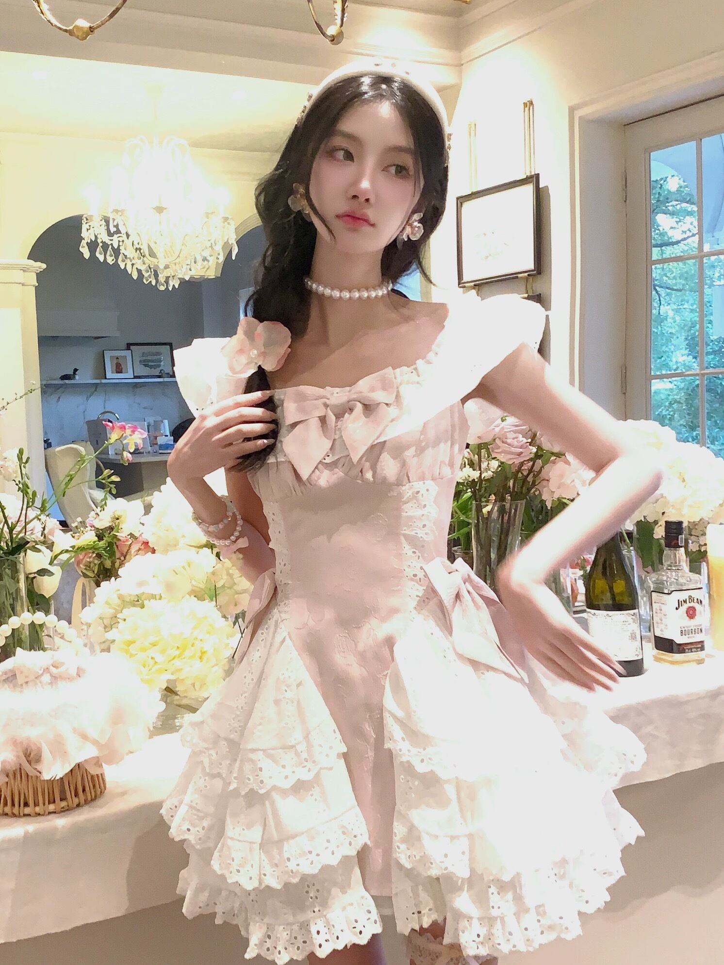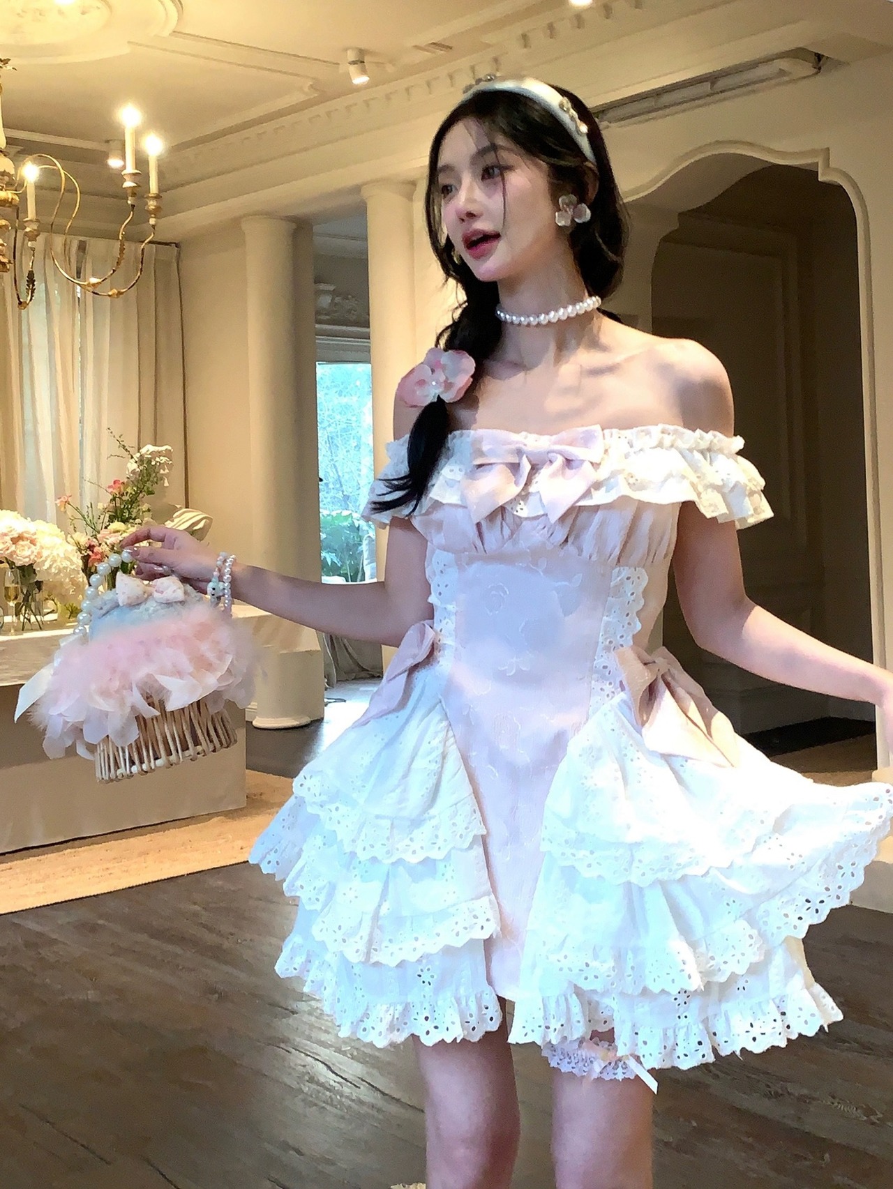 白 ピンク リボン ガーリー 可愛い 姫 プリンセス ワンピース ロリータ 衣装 オフショルダー 可愛い 原宿 秋葉原 ドレス