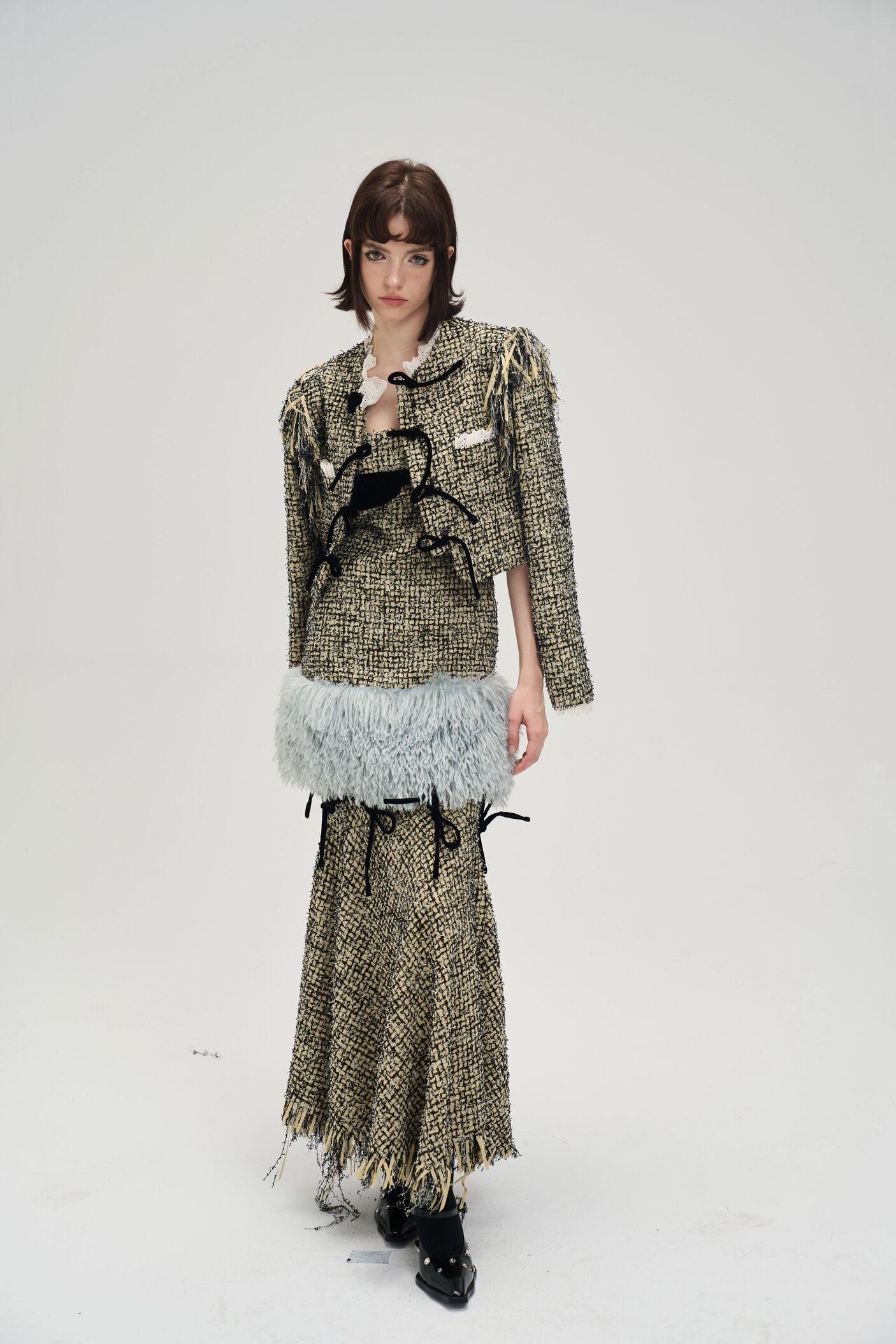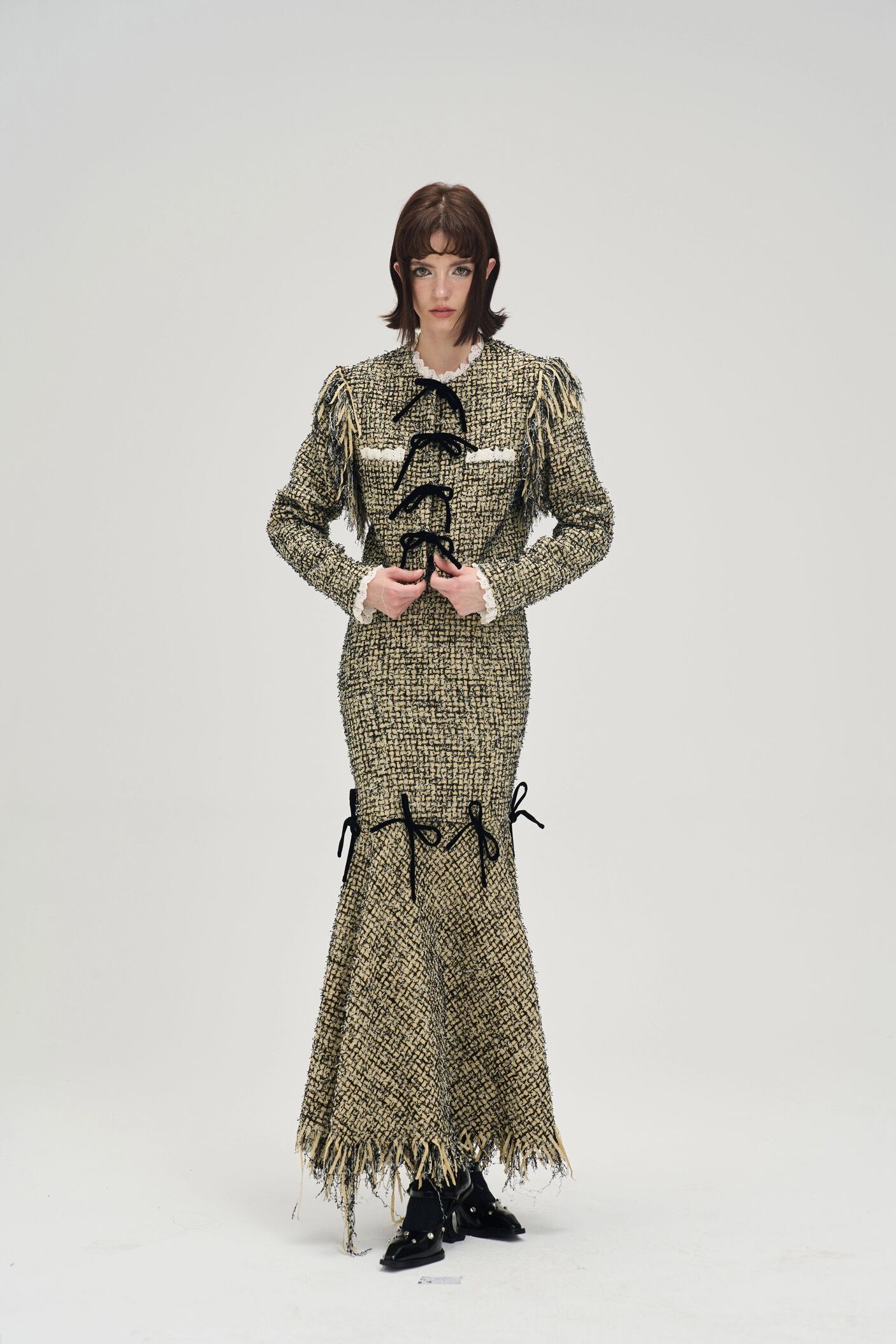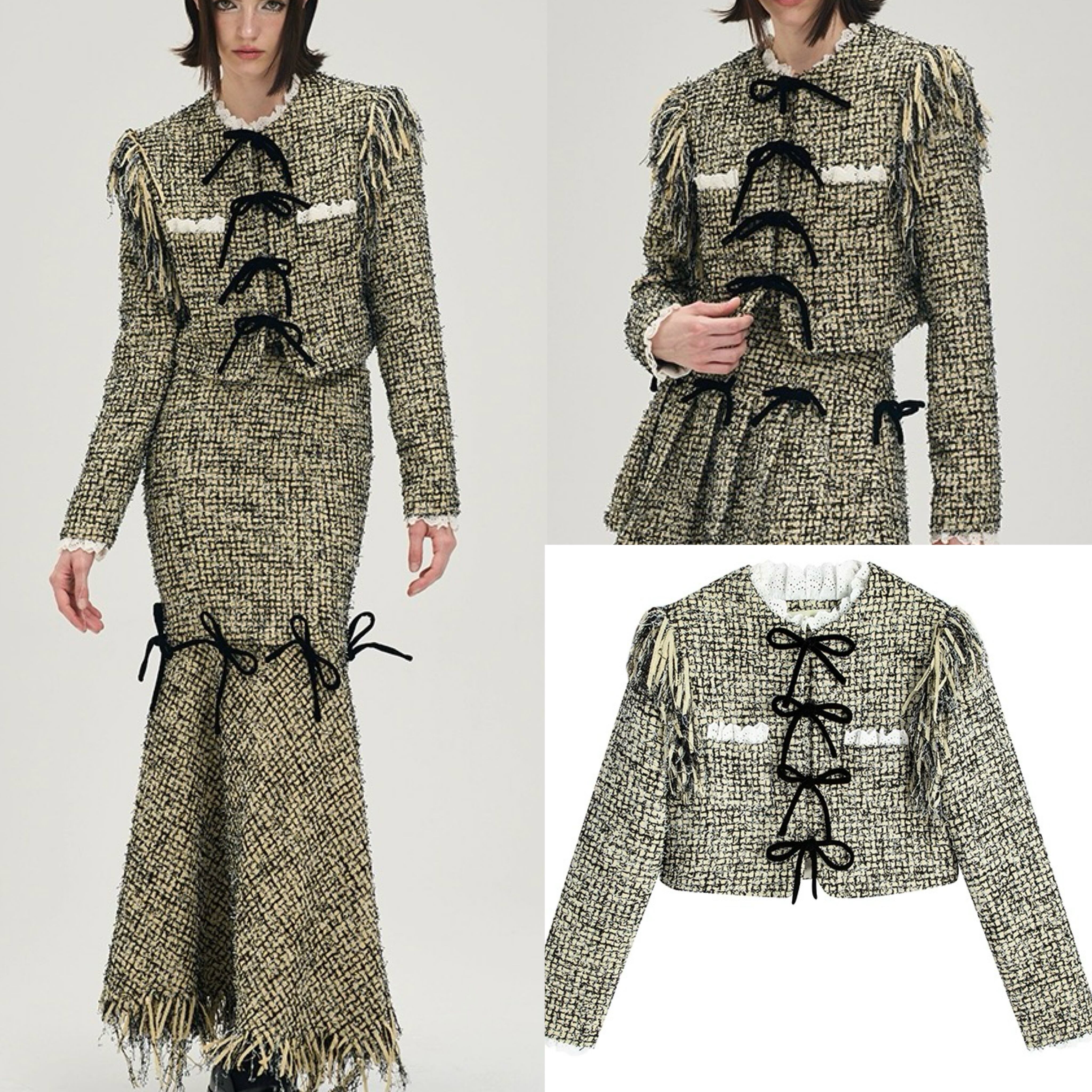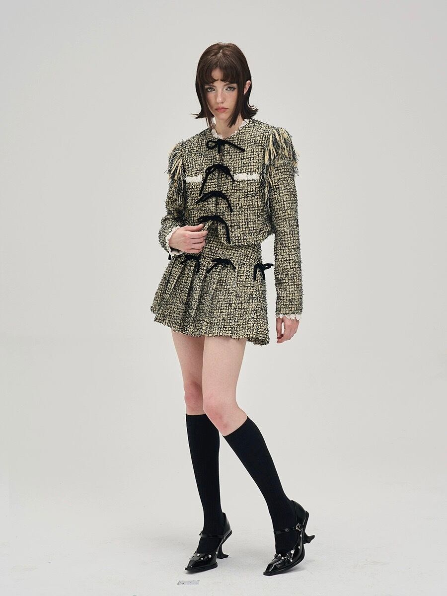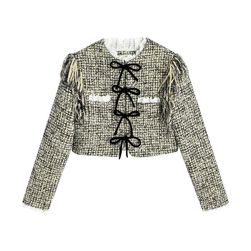 【ジャケット】緑 アウター カーディガン リボン エレガント チェック