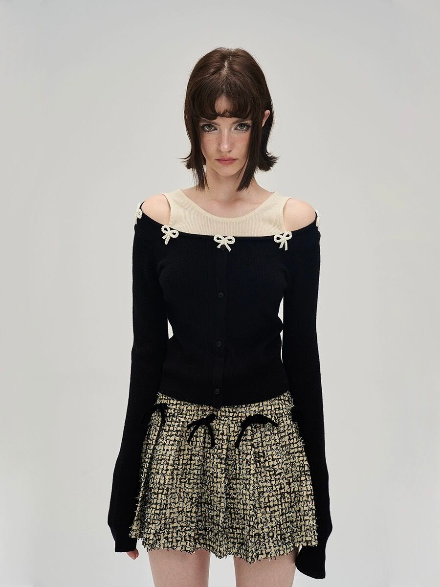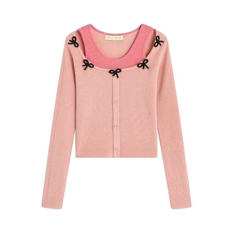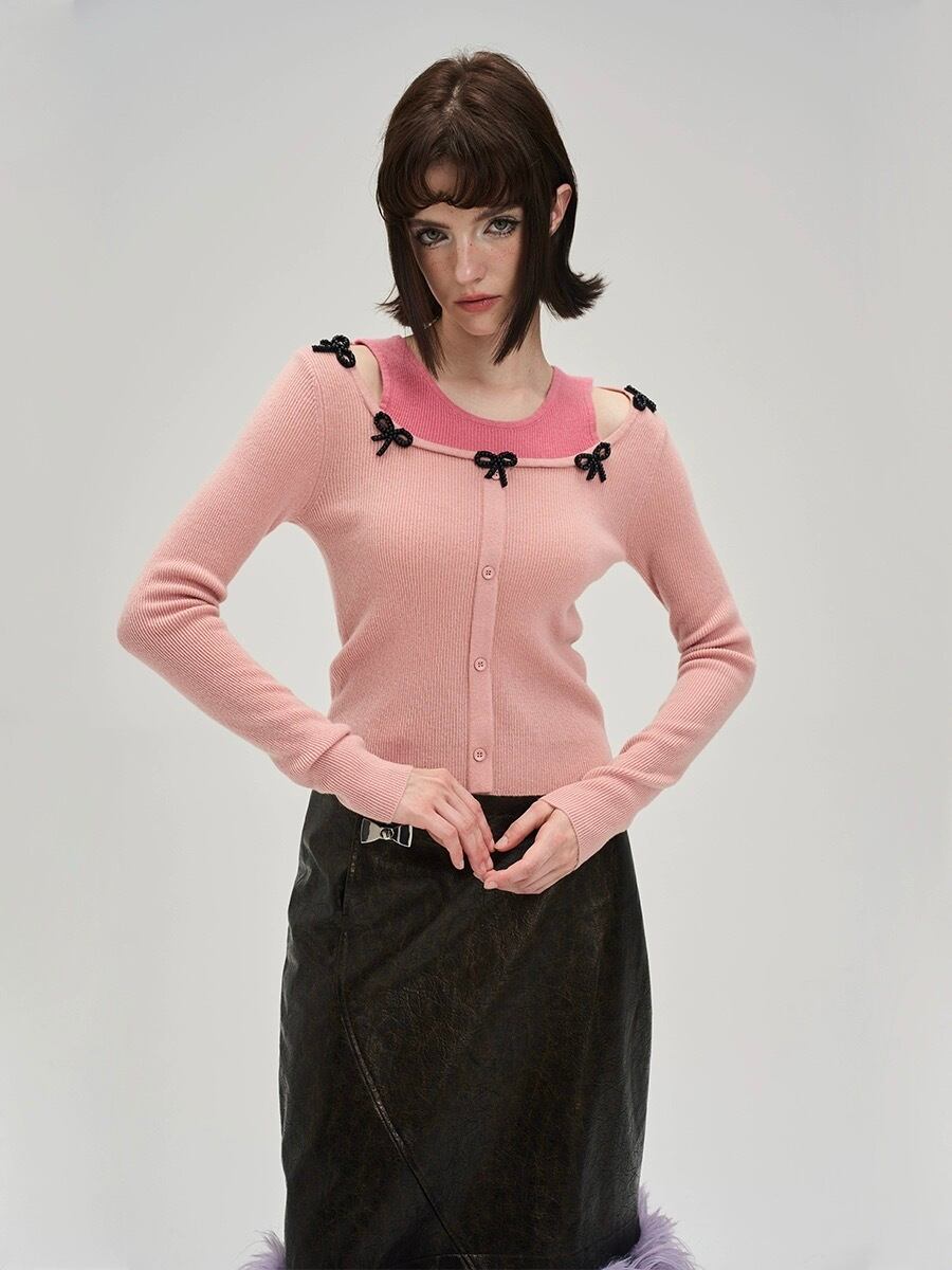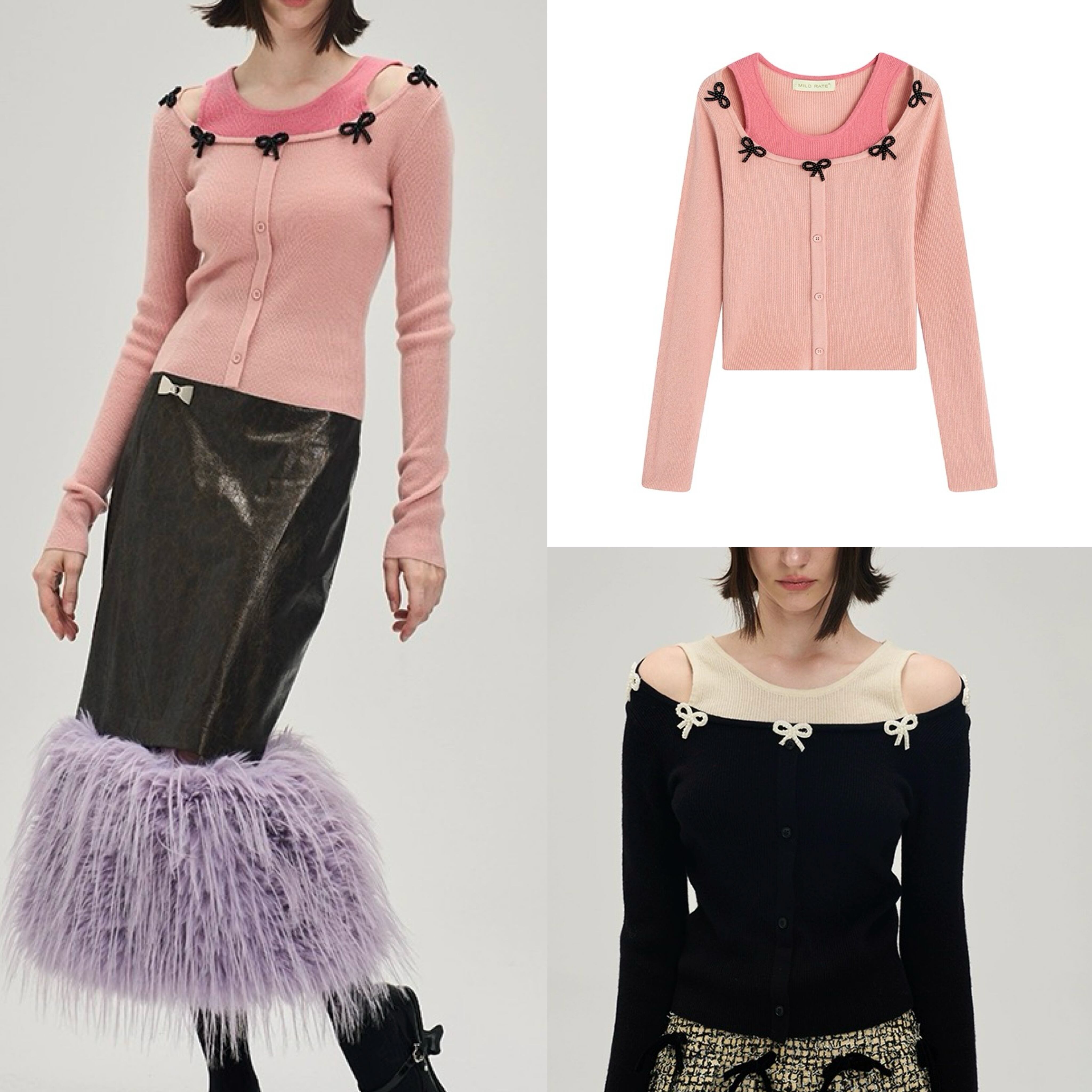 カーディガン ガーリー ピンク 黒 リボン ニット トップ