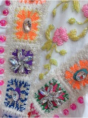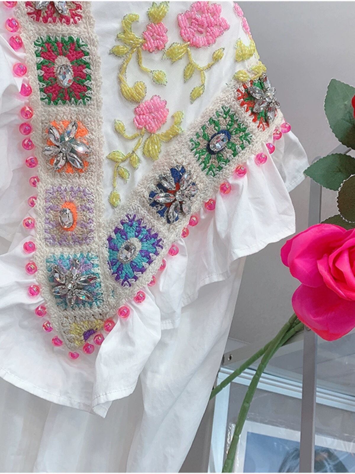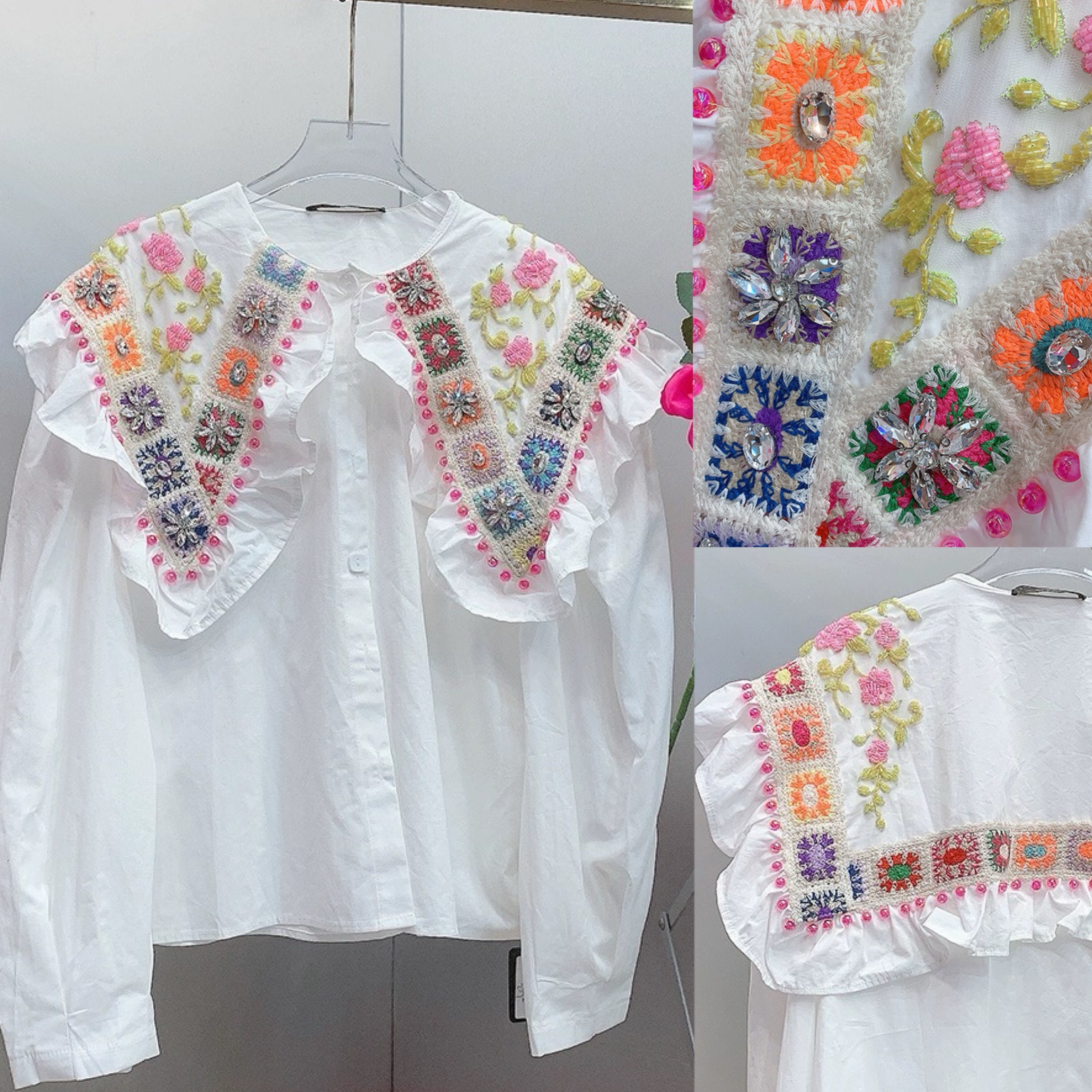 花柄 カラフル ビーズ ブラウス 白 デカい 襟 トップス