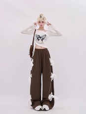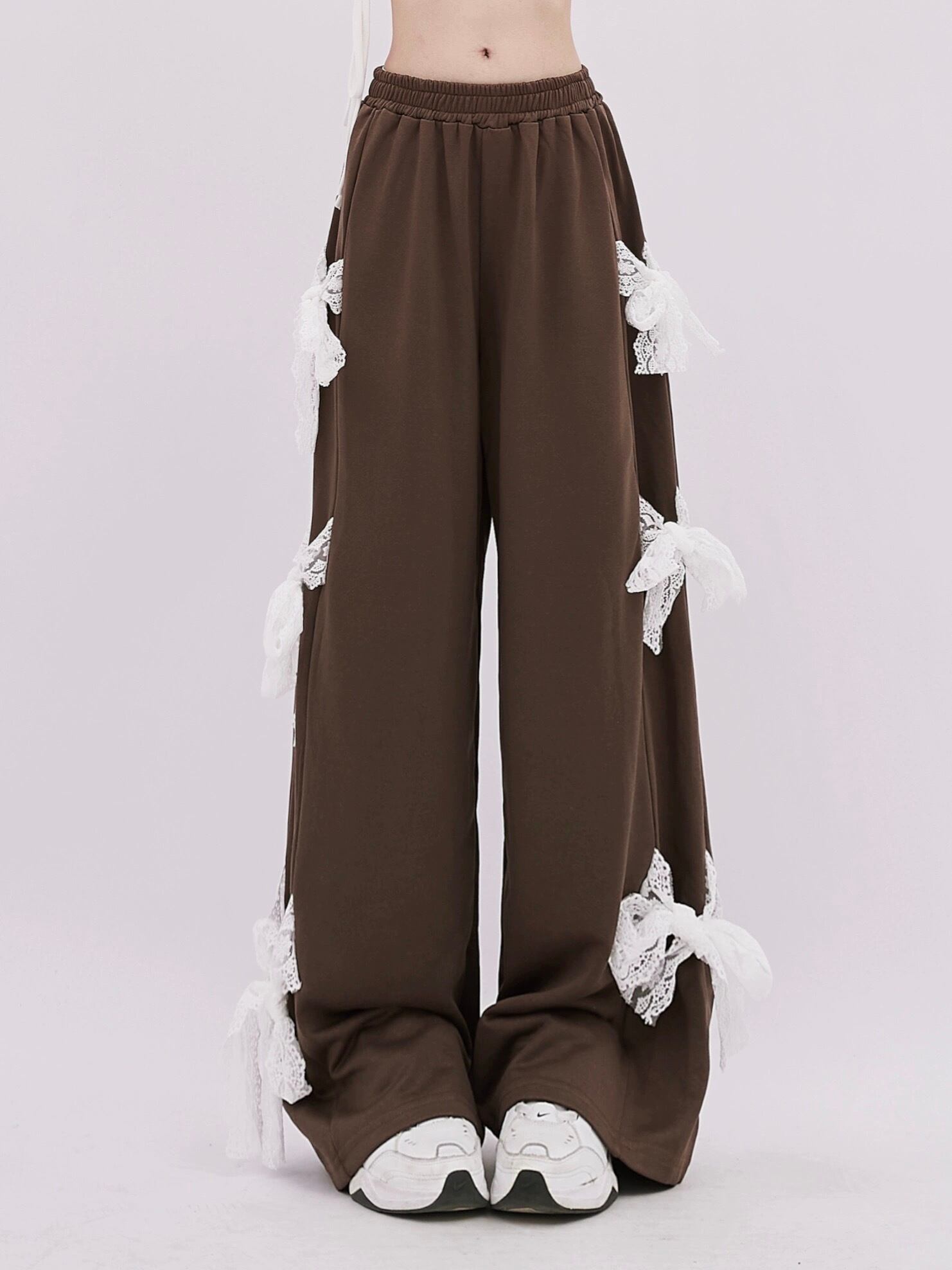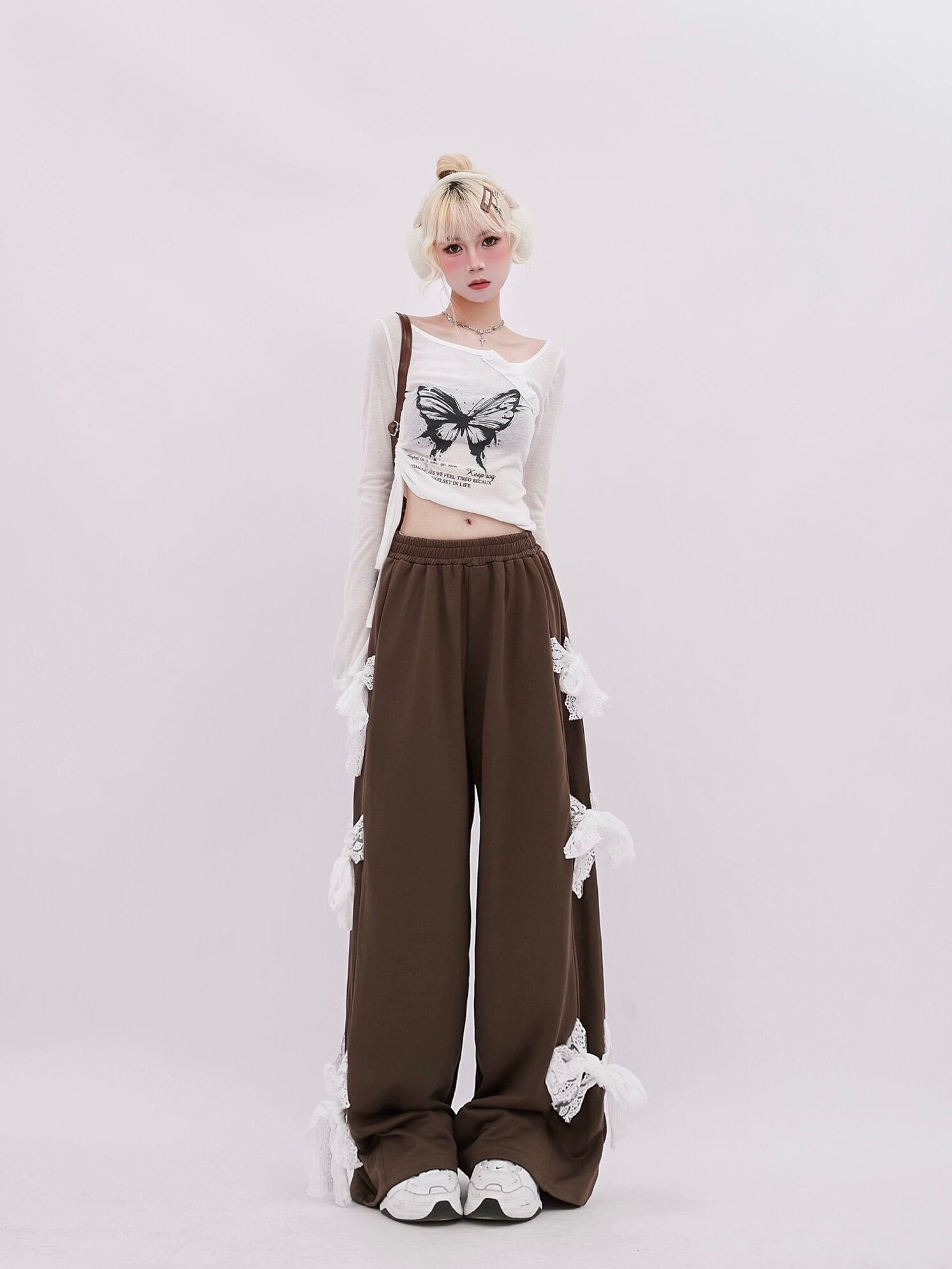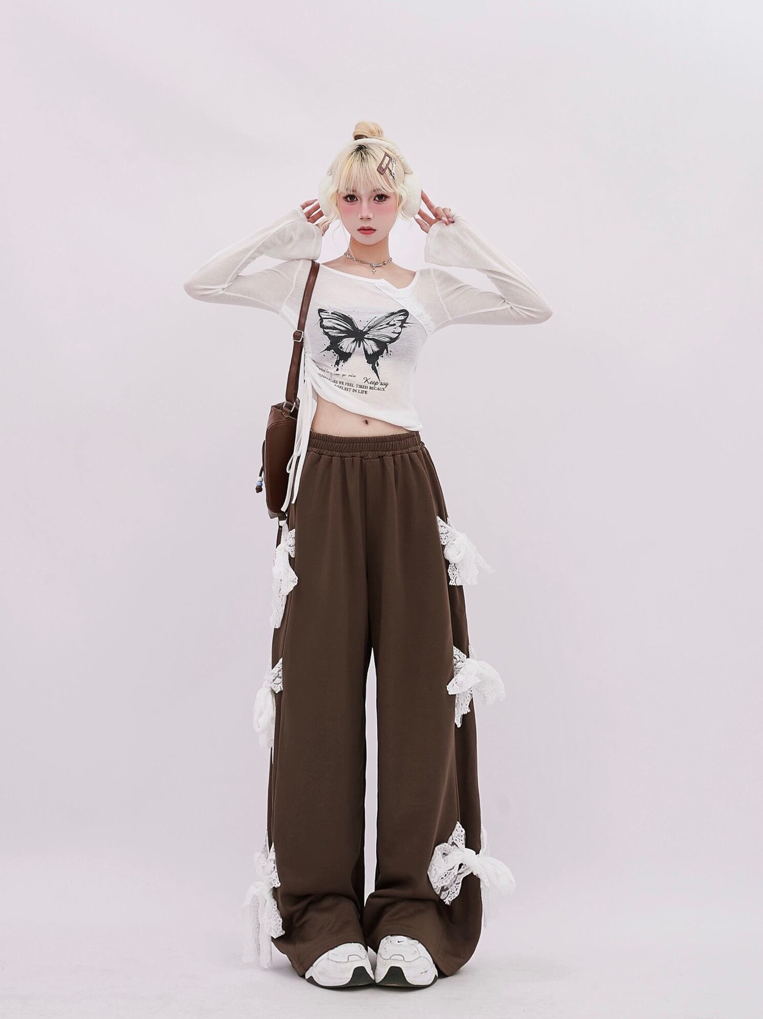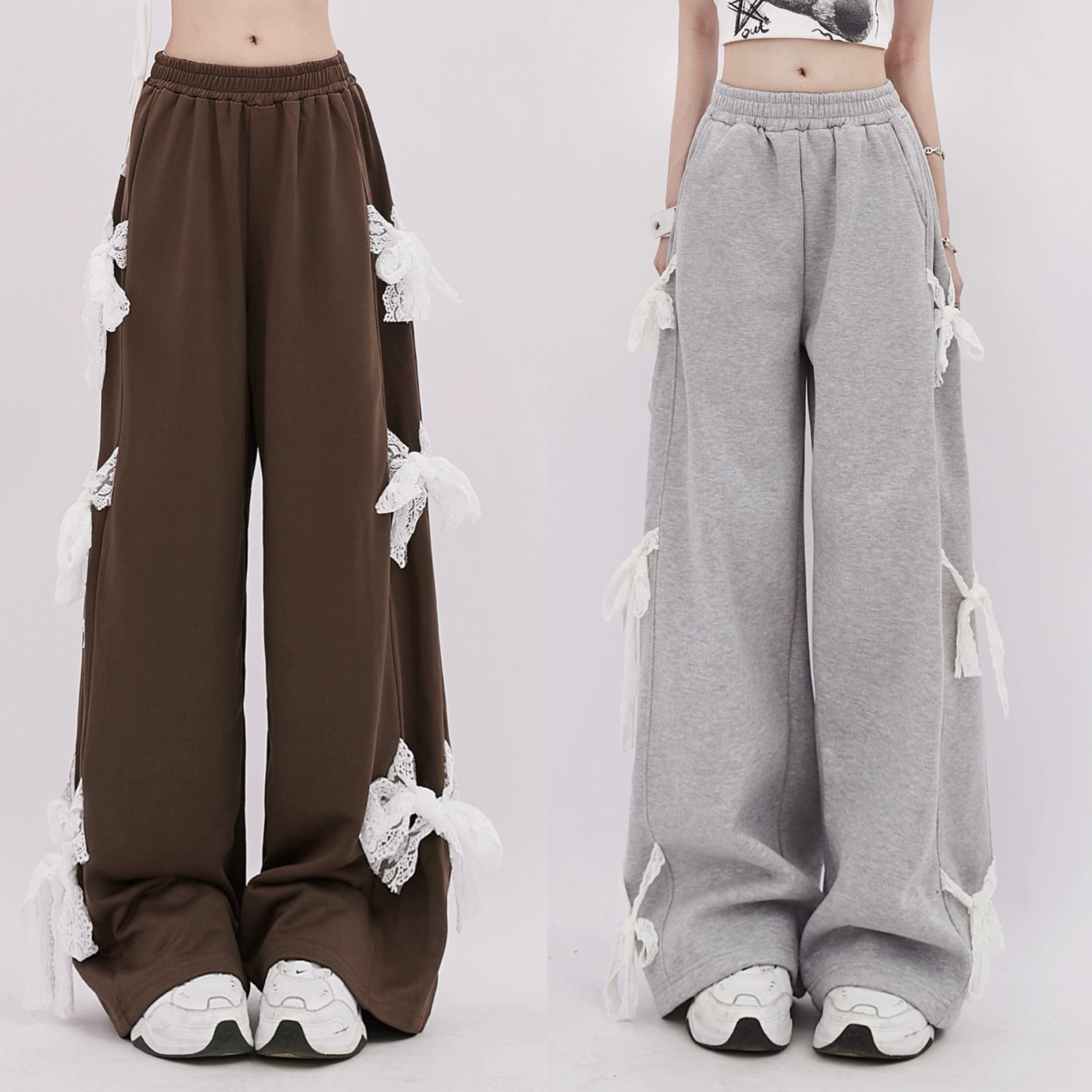 グレー 茶色 リボン デニム パンツ ピンク バタフライ スウェット ズボン カジュアル ピンク 可愛い 原宿 ダンス ジム 運動 ダメージ XL 渋谷