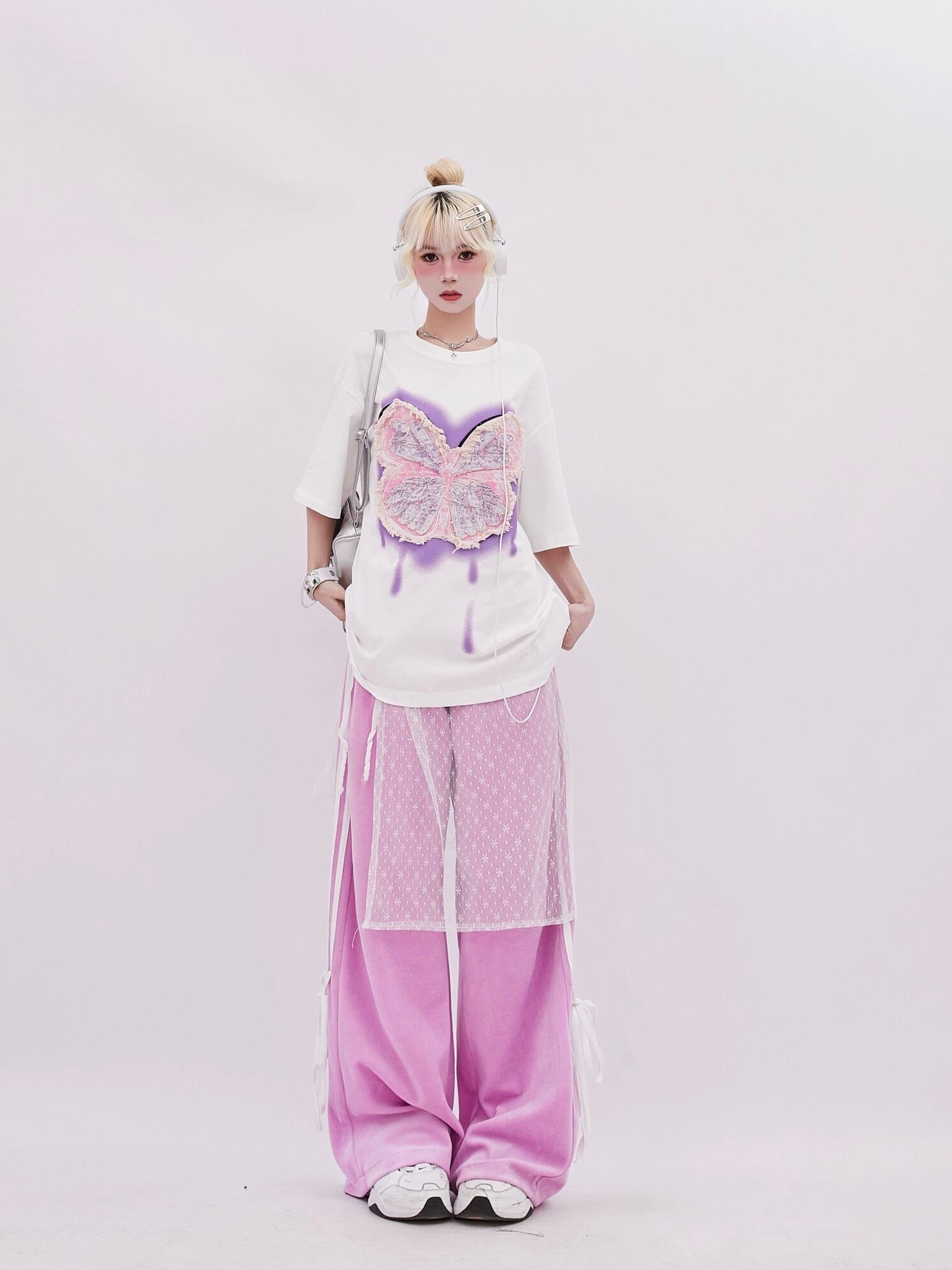 ピンク ネイビー デニム パンツ ピンク バタフライ スウェット ズボン カジュアル ピンク 可愛い 原宿 ダンス ジム 運動 ダメージ XL 渋谷