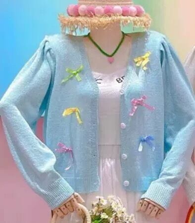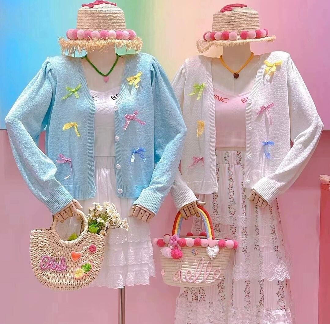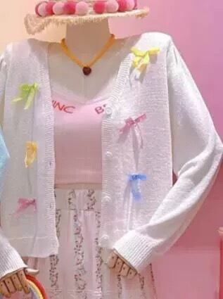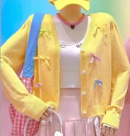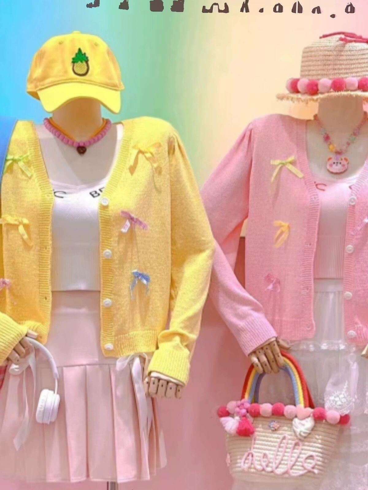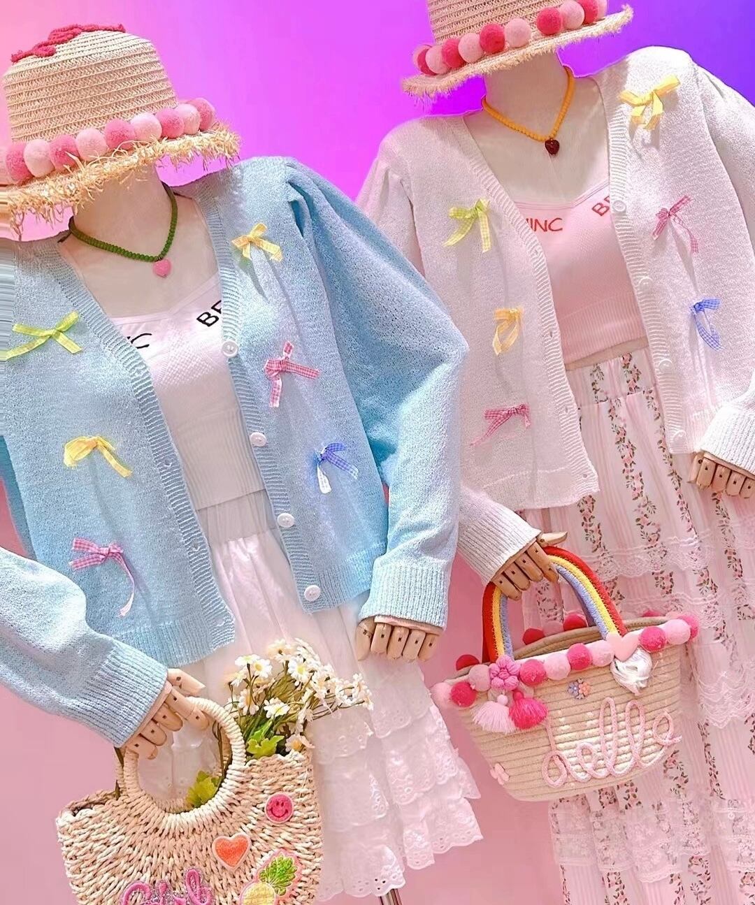 カーディガン ゆったり リボン ガーリー 黄色 ピンク 水色