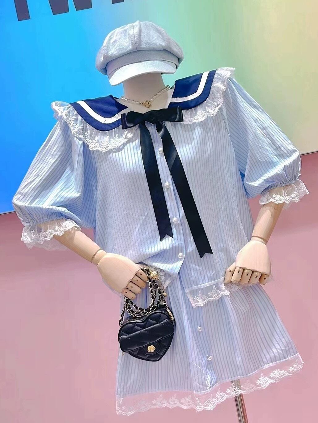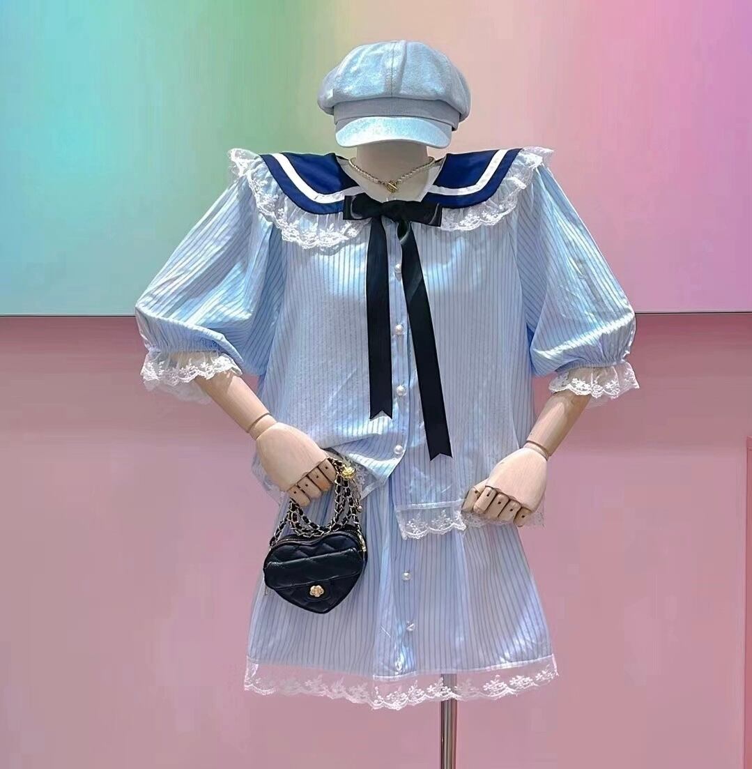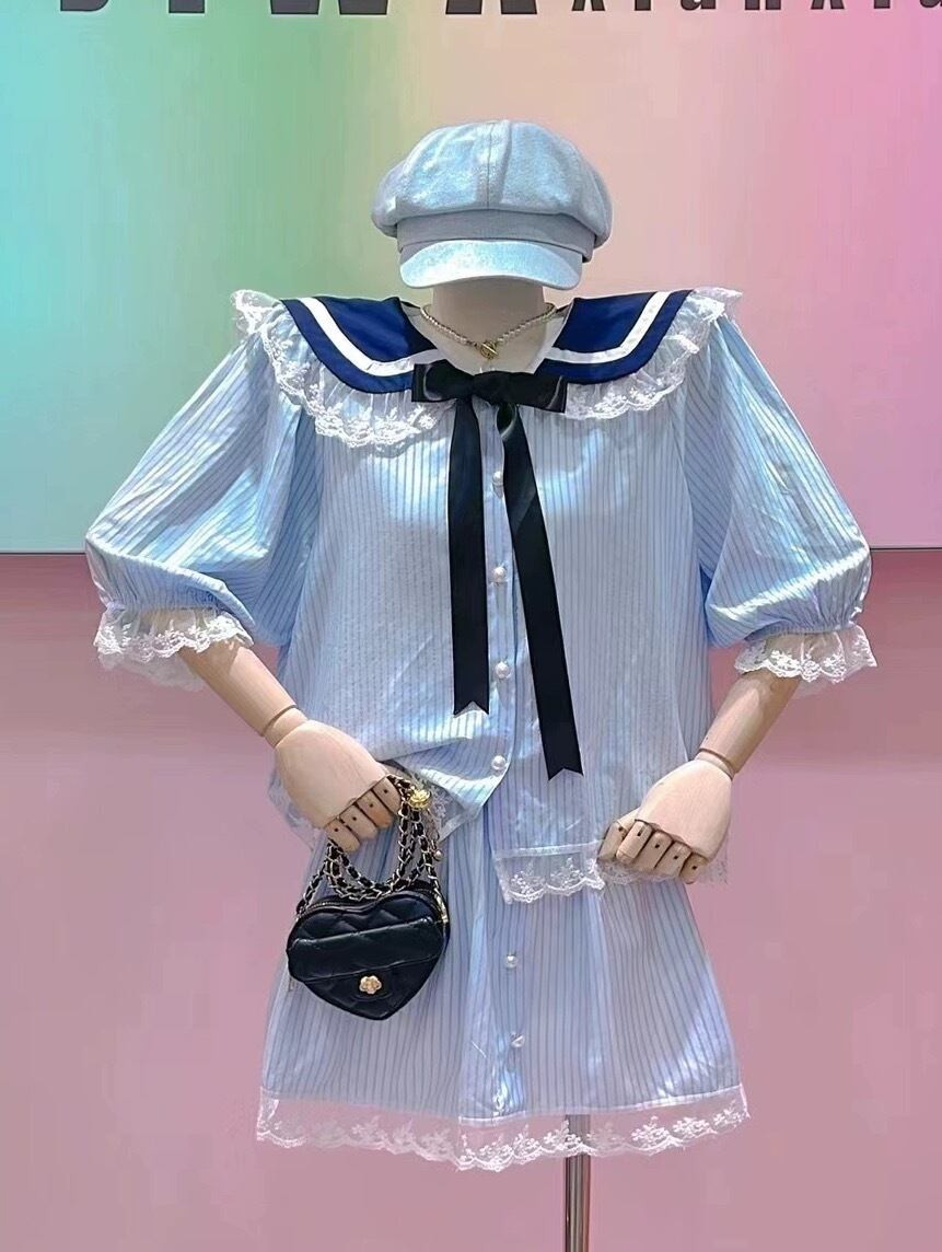ブラウス リボン マリン 水玉 ドット ガーリー リボン ピンク 水色