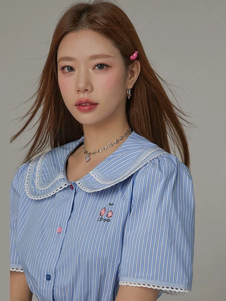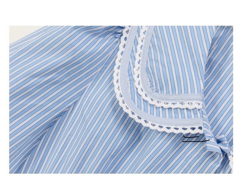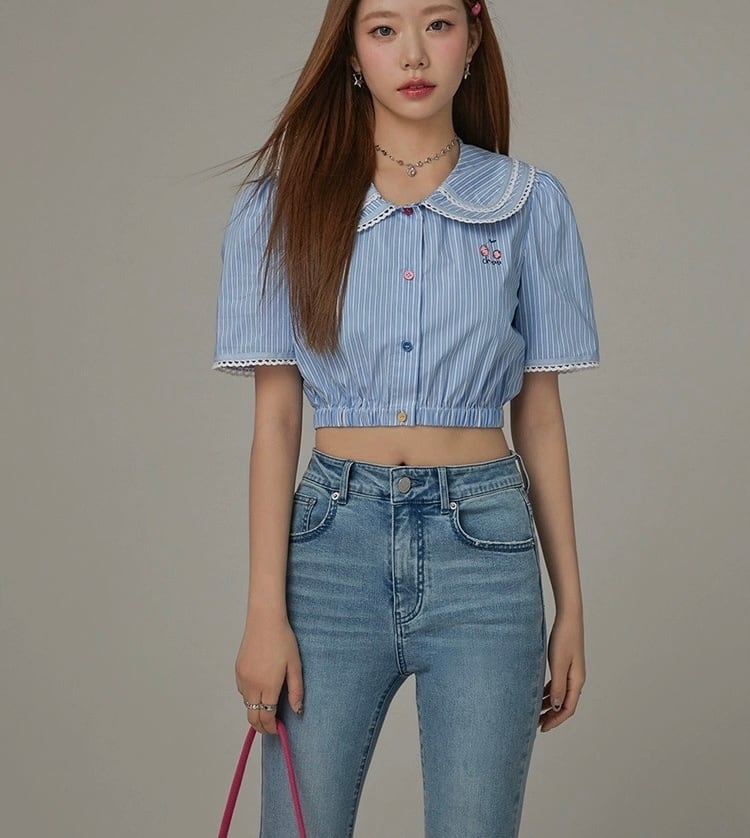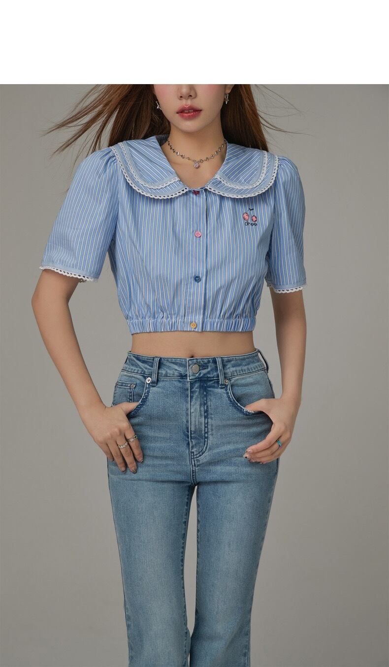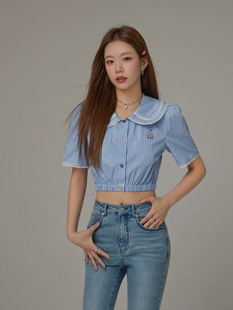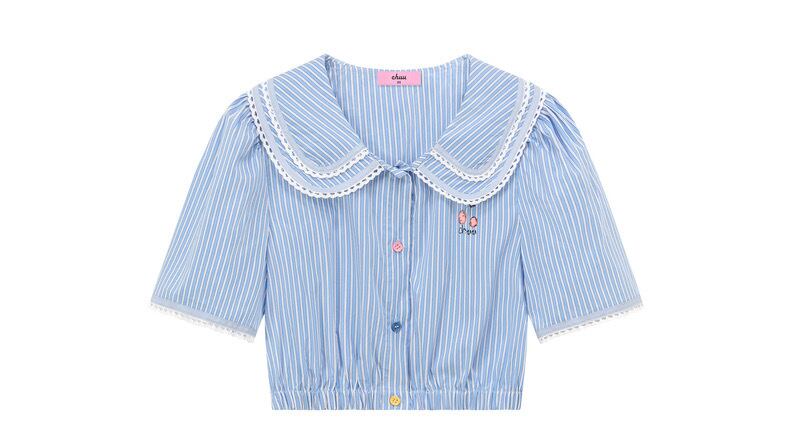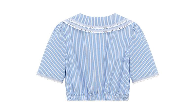 ブラウス シンプル 丸襟 水色 ボーダー チェック トップス