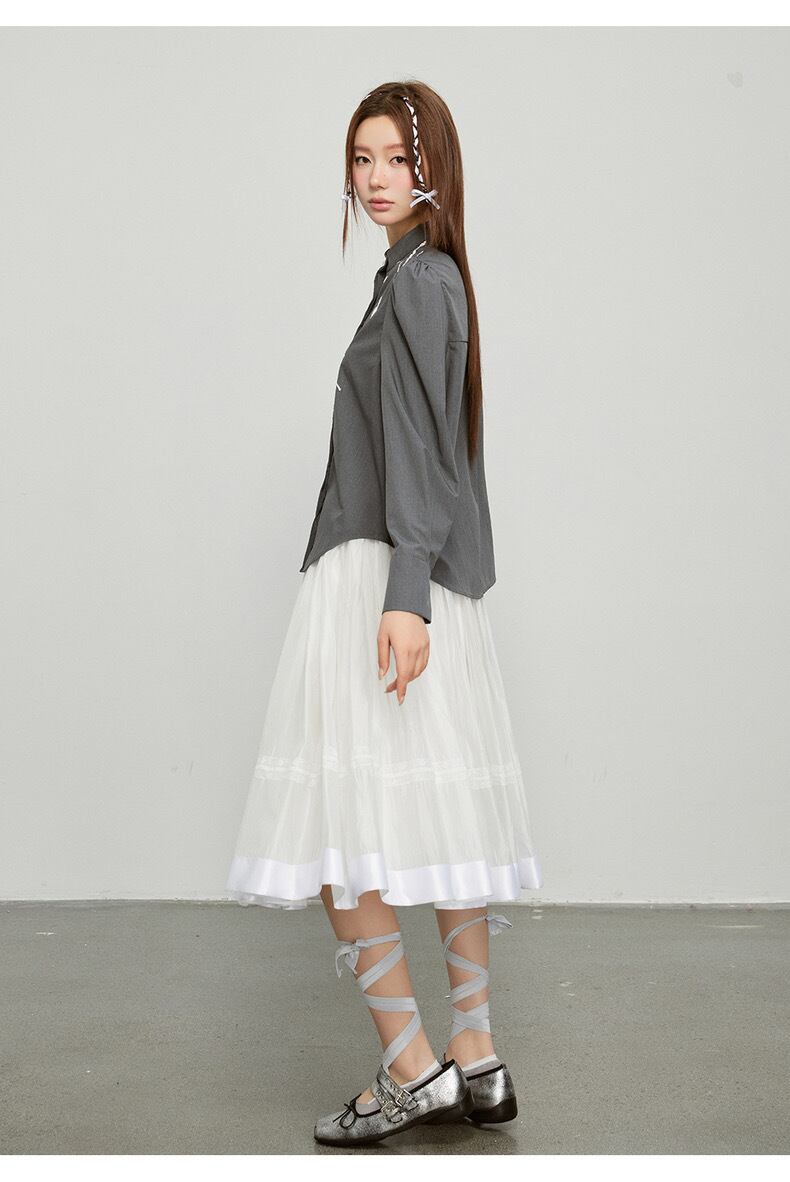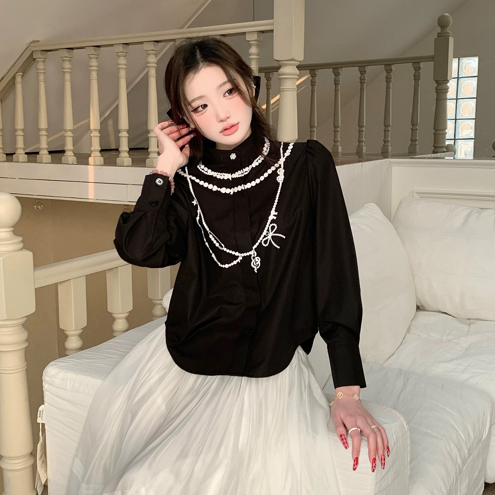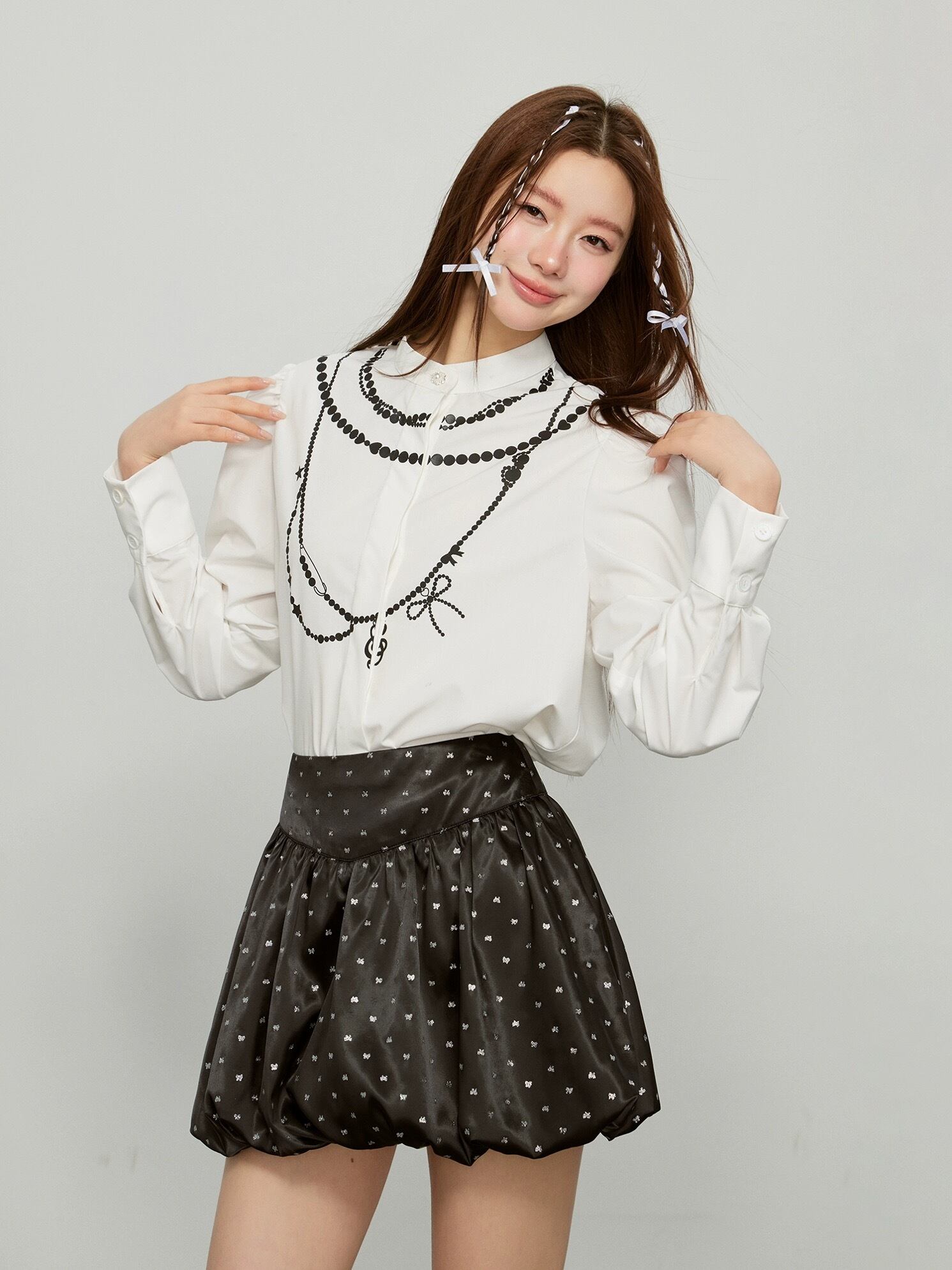 グレー 黒 白 リボン ネックレス ブラウス シャツ トップス