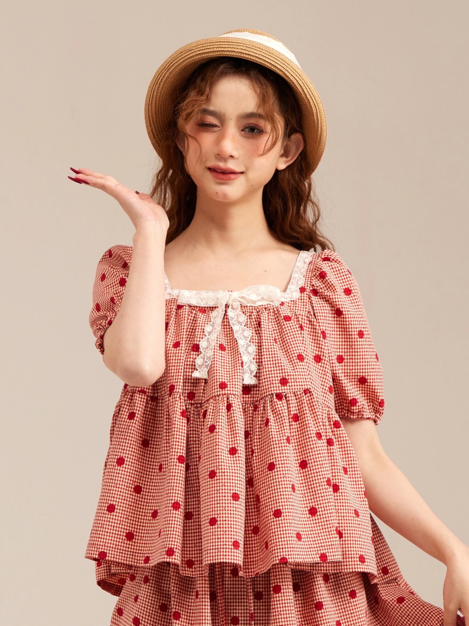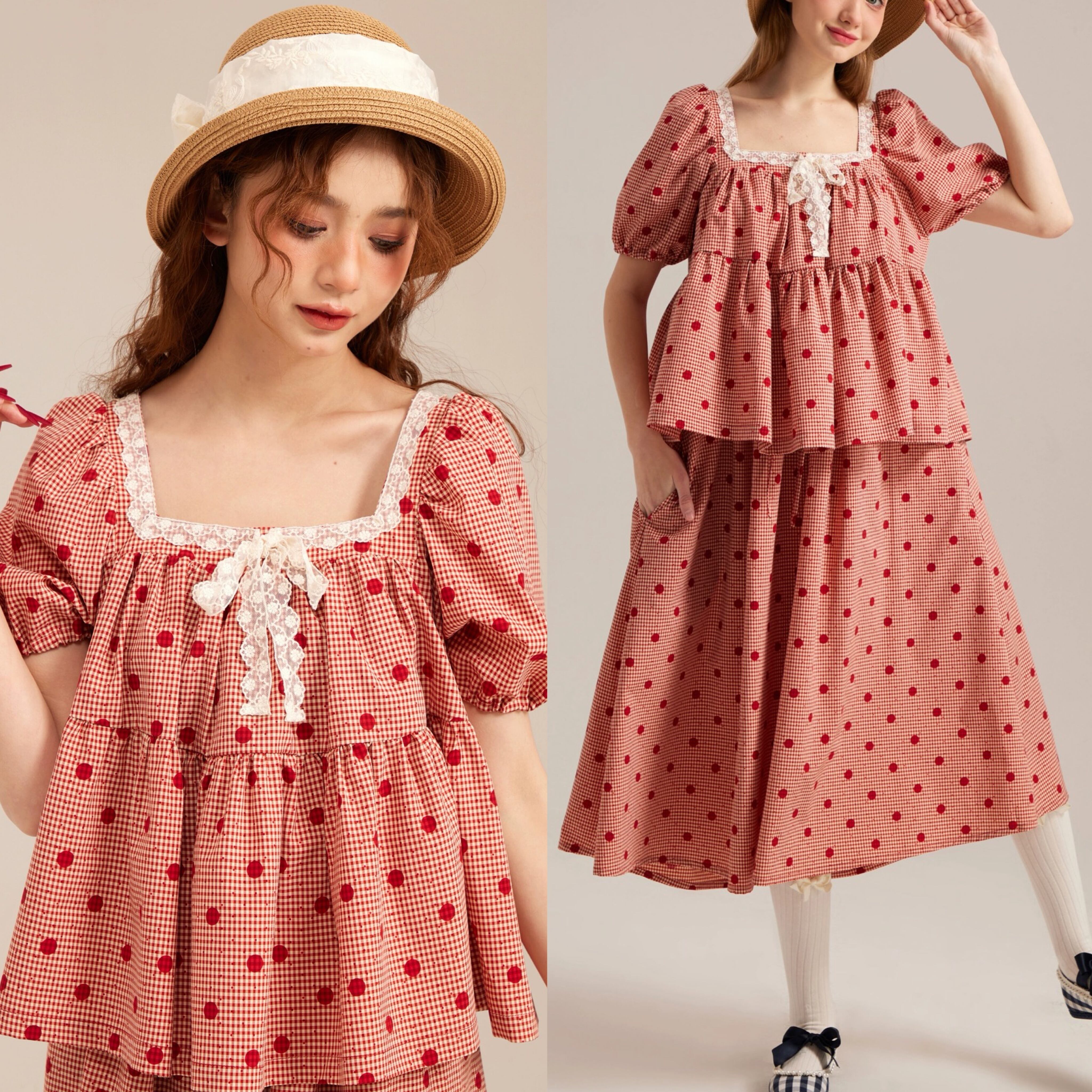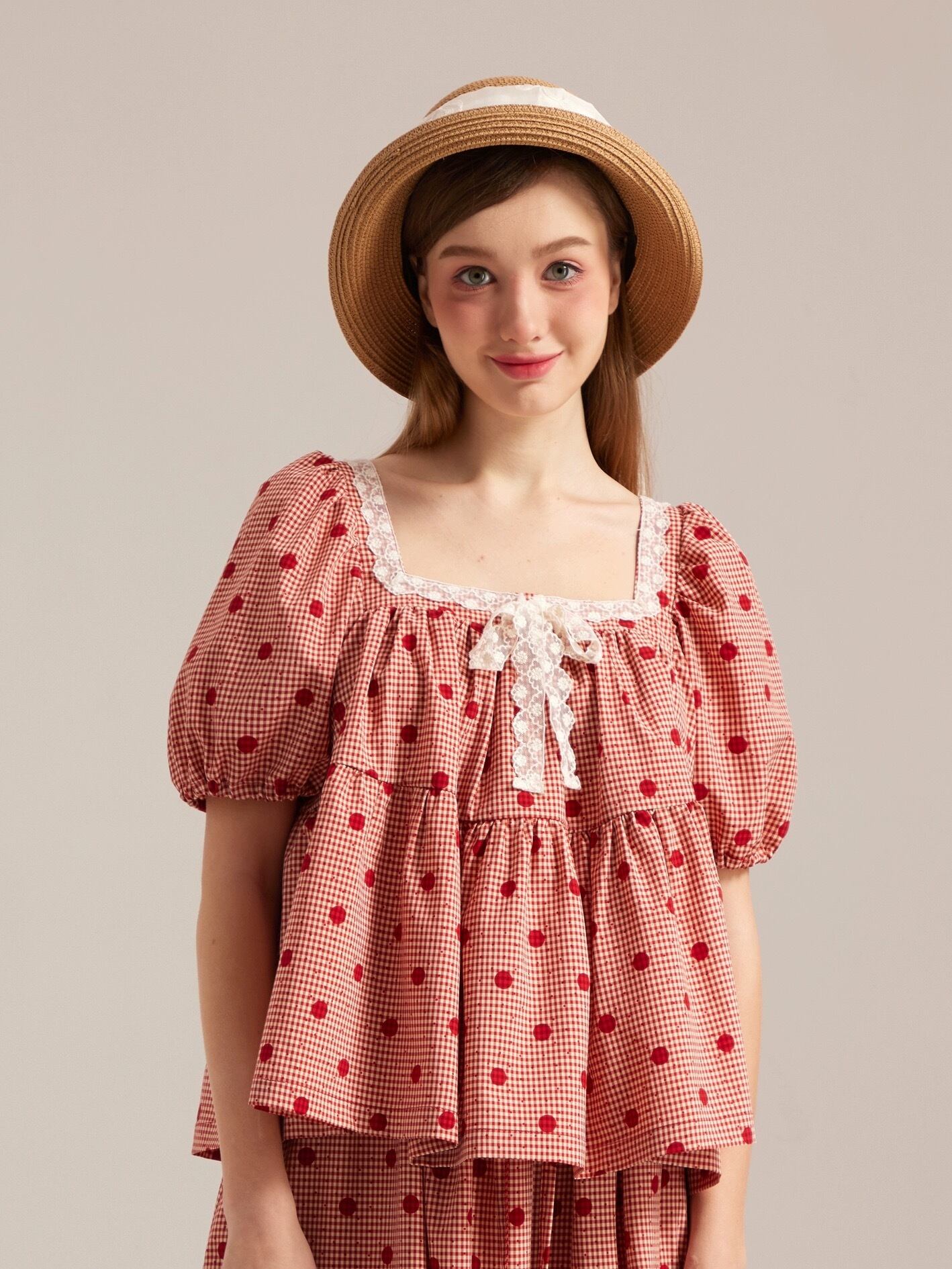 赤 水玉 ブラウス チェック ゆったり カジュアル トップス