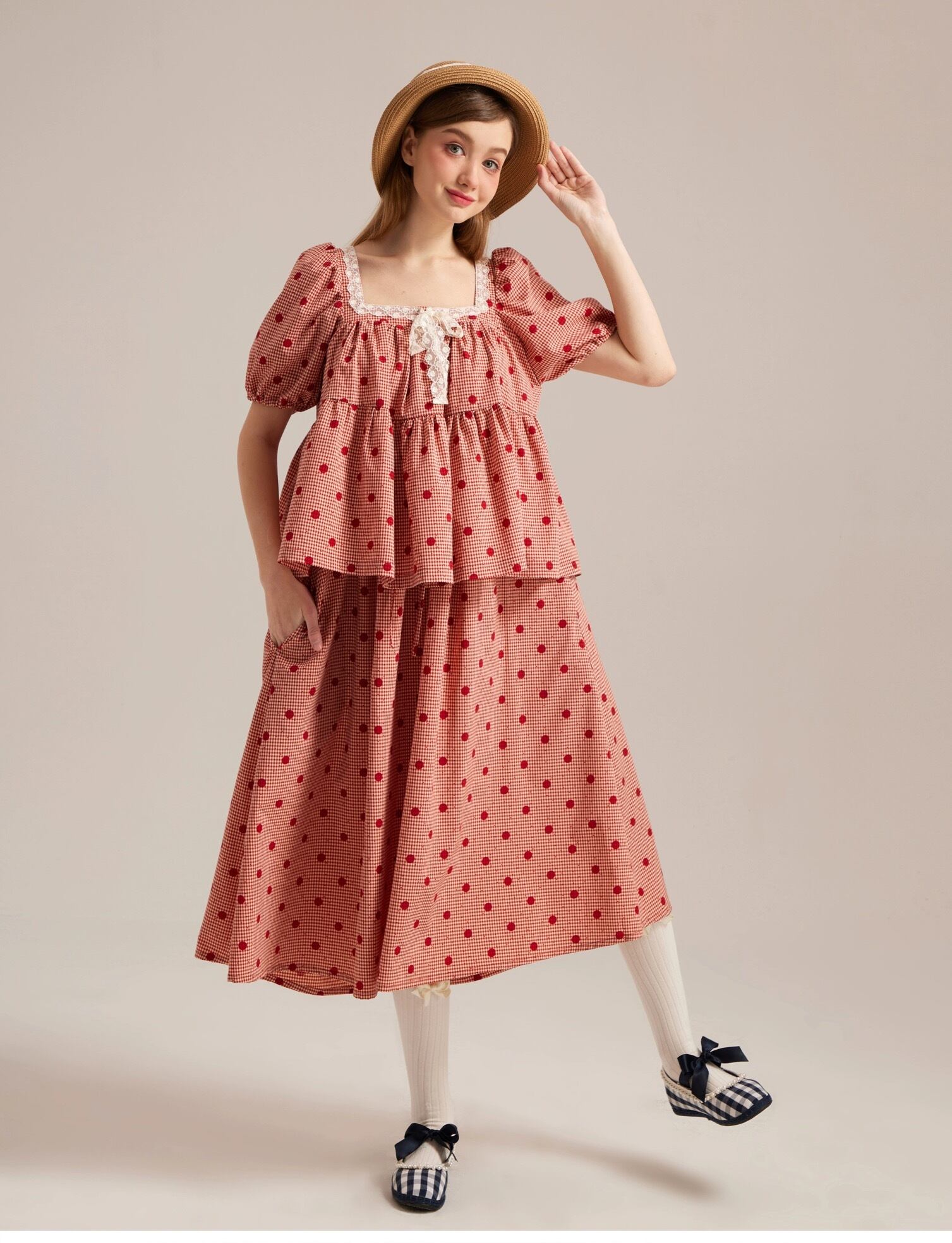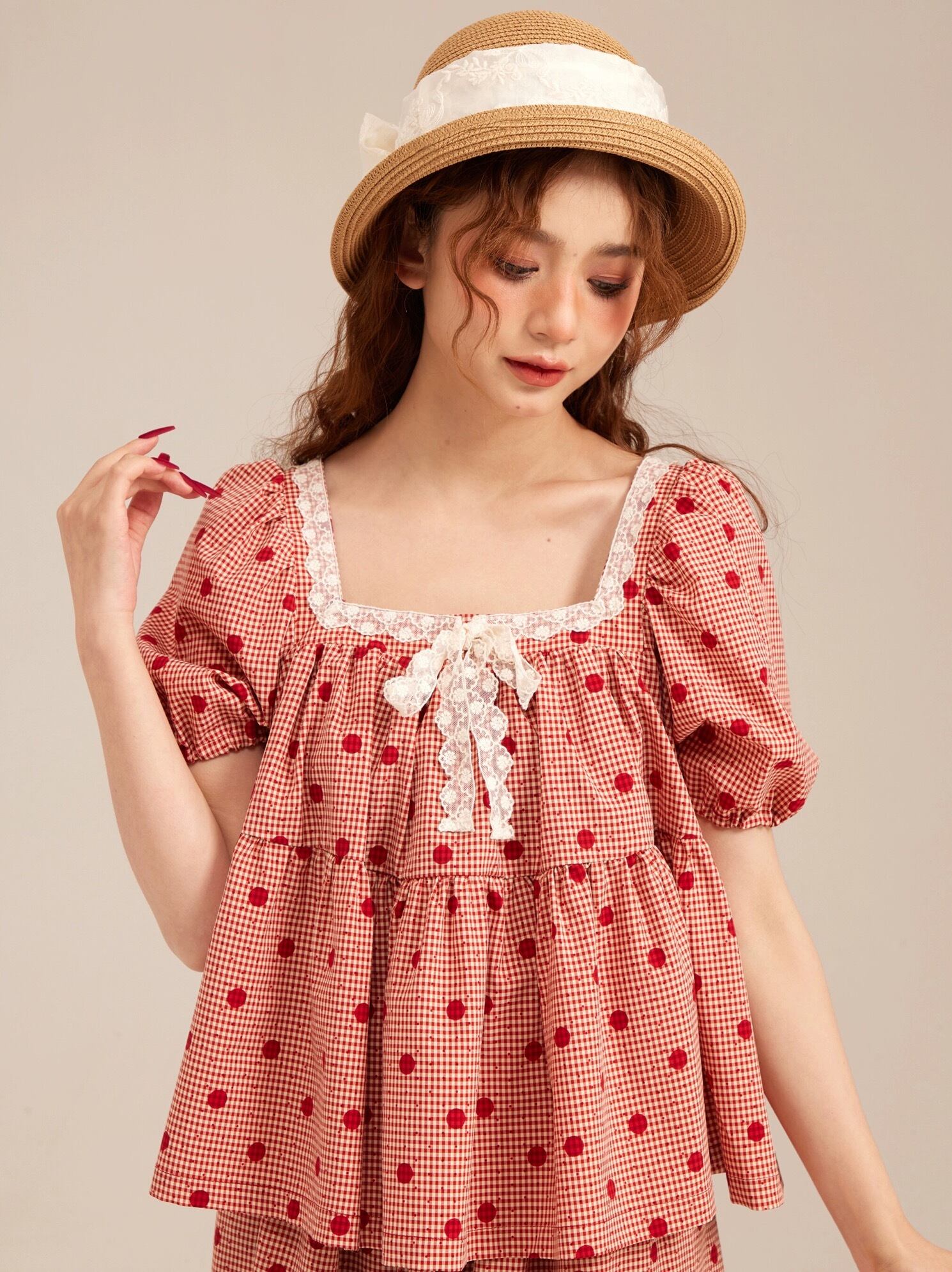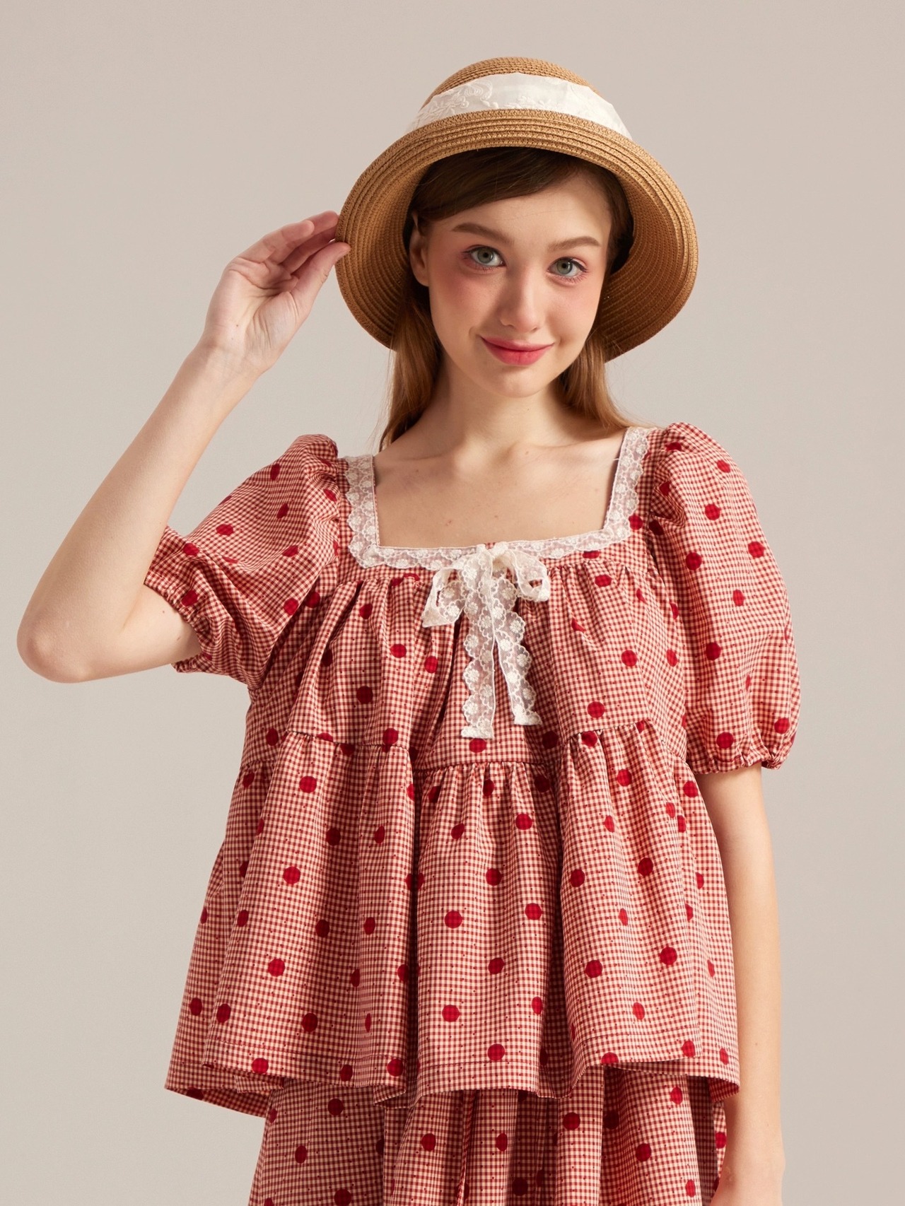 赤 水玉 ブラウス チェック ゆったり カジュアル トップス
