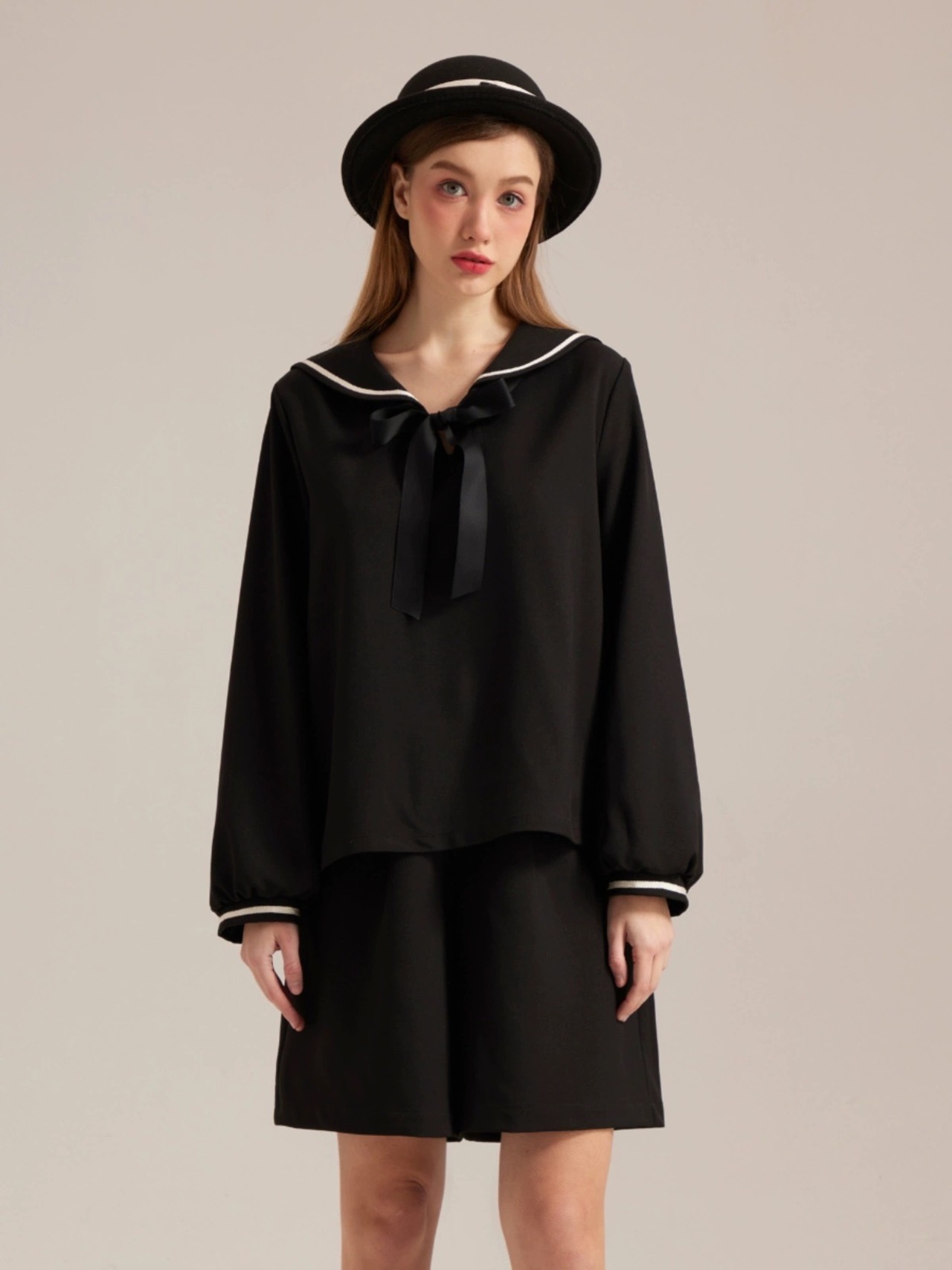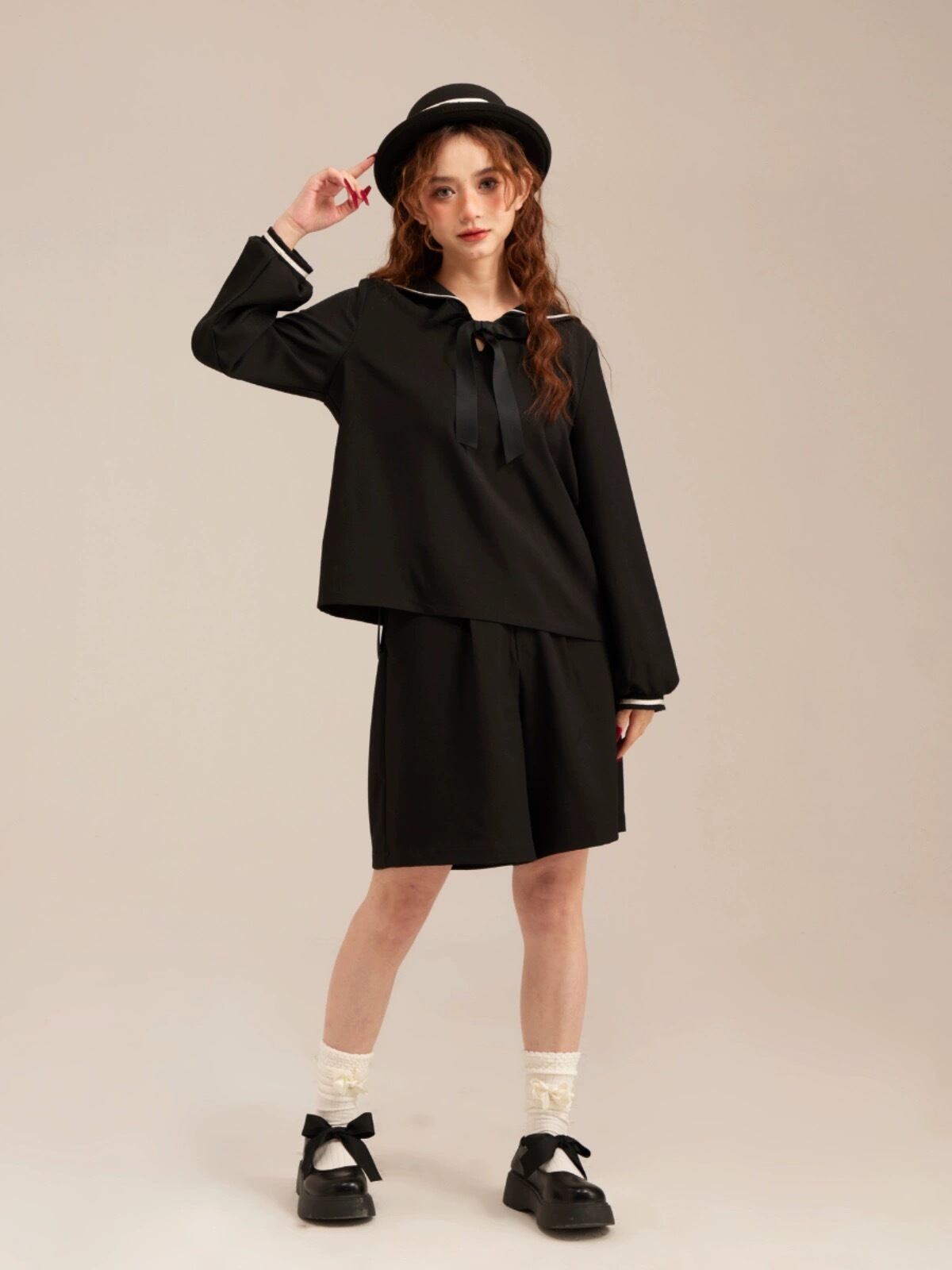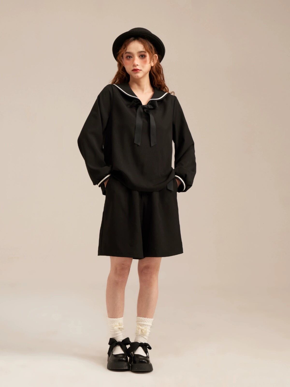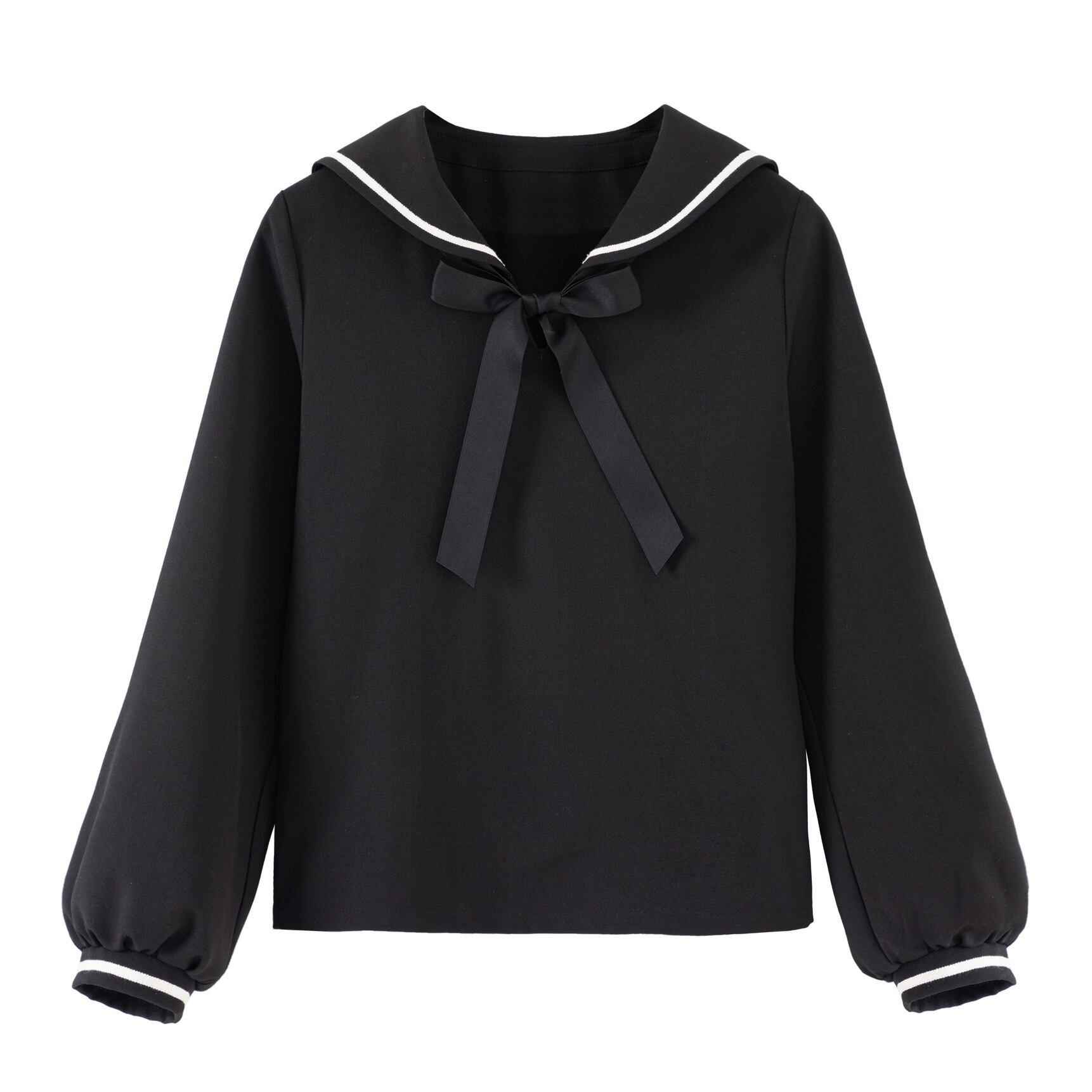 【トップス】セーラー リボン 黒 ブラウス ガーリー