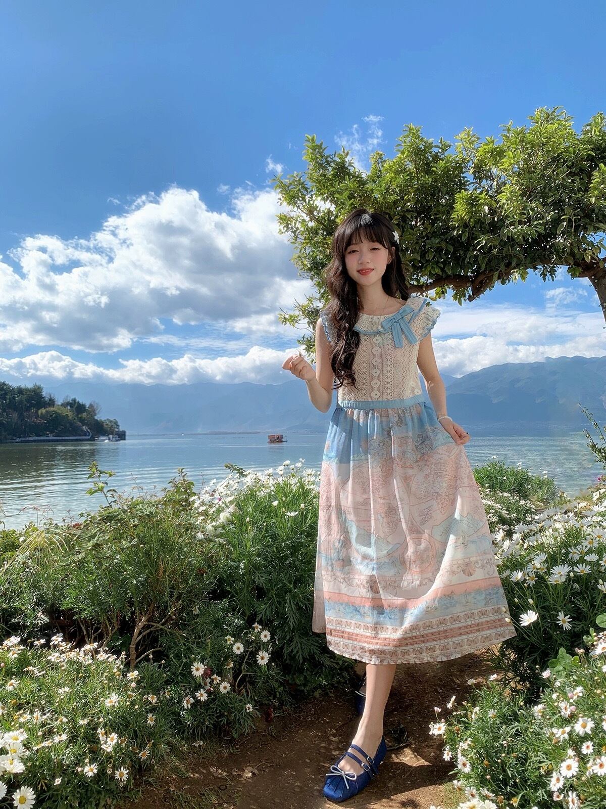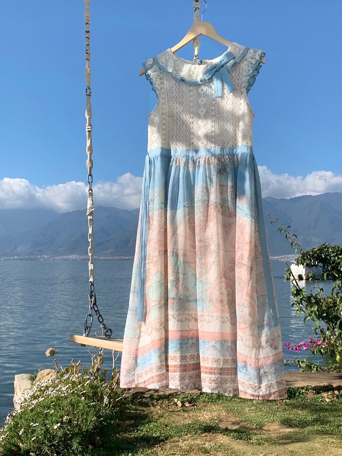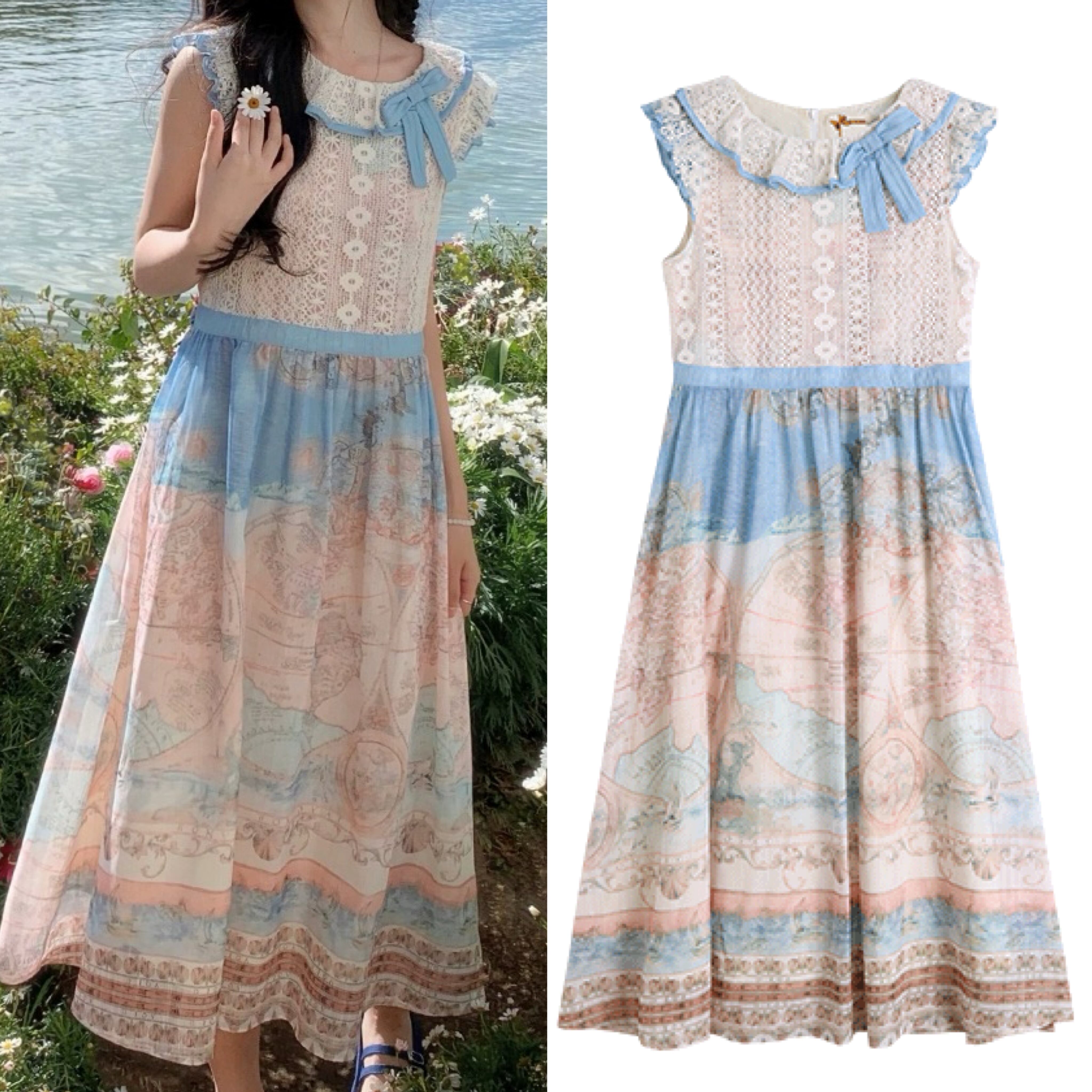 ガーリー 水色 ピンク 地図 地球儀 リボン 原宿 ワンピース