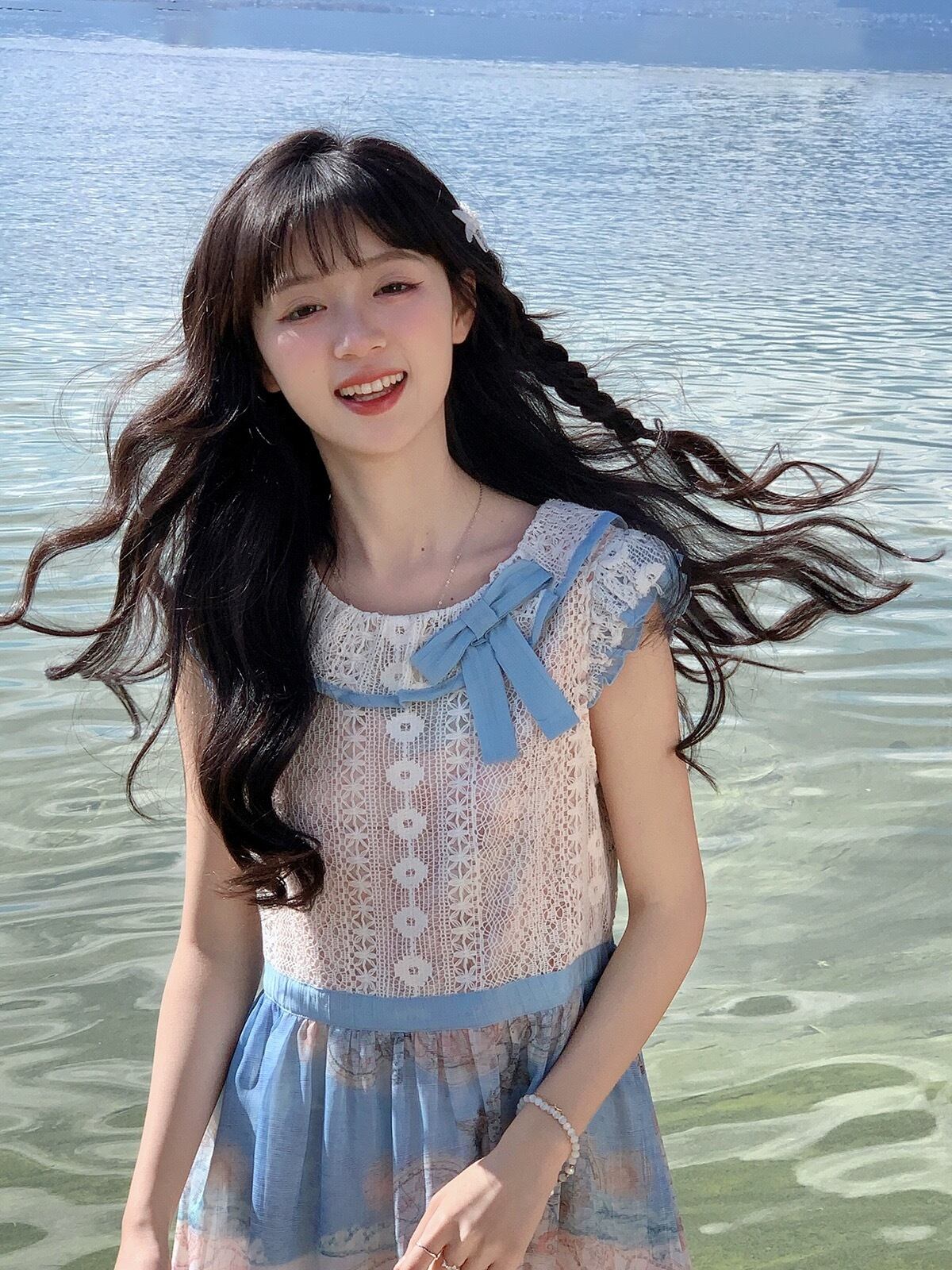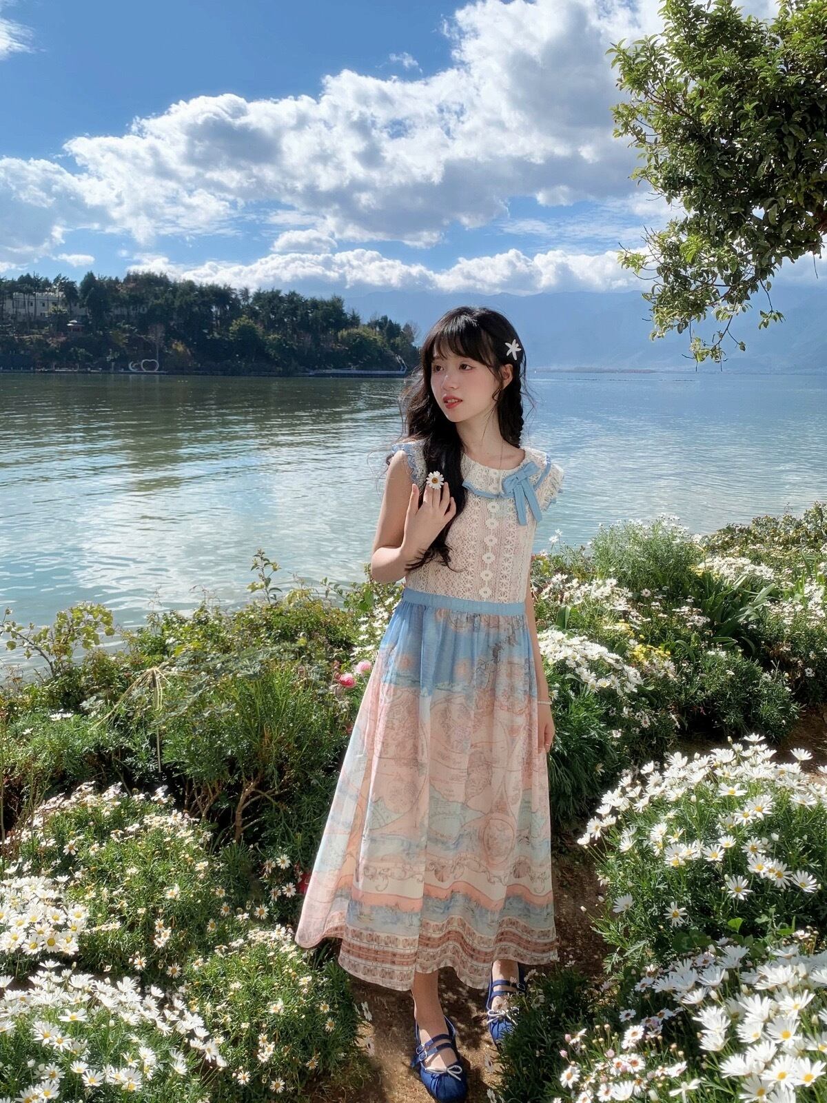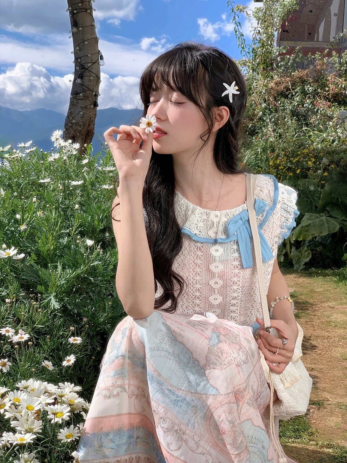 ガーリー 水色 ピンク 地図 地球儀 リボン 原宿 ワンピース