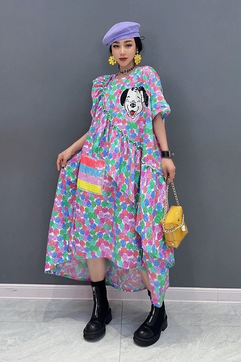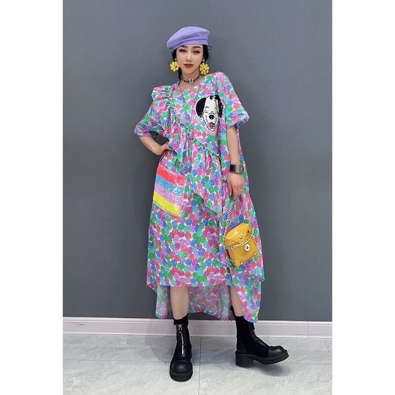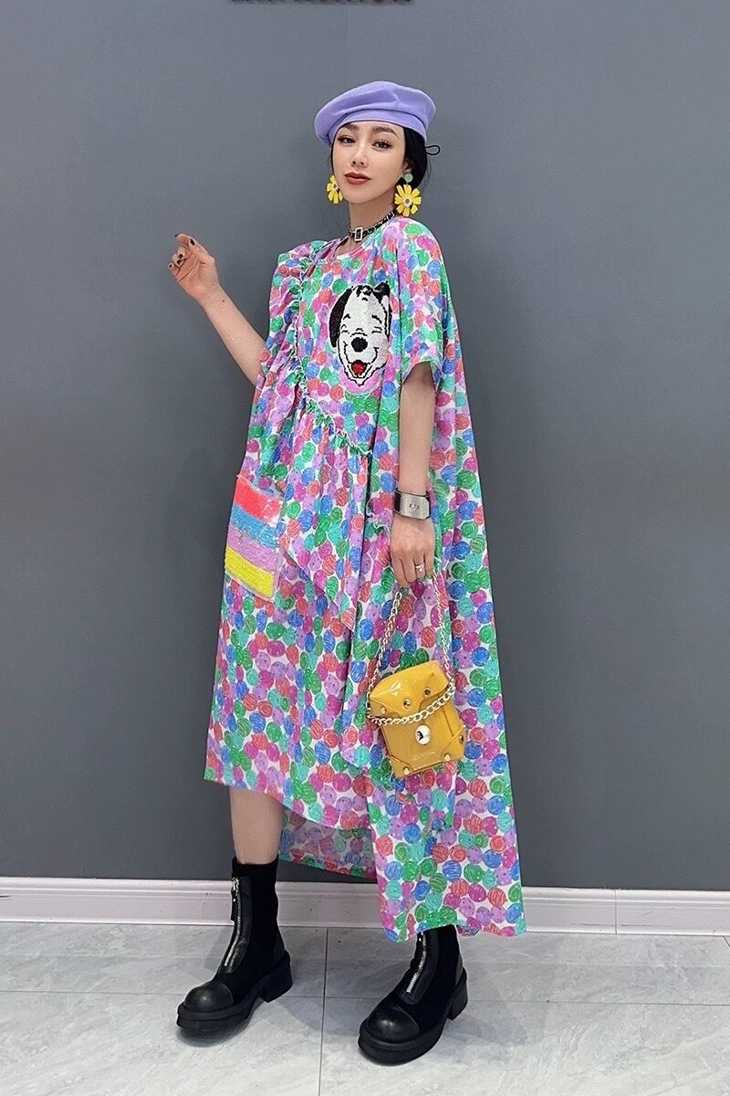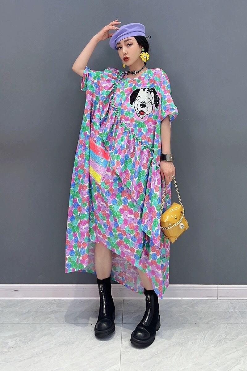 カラフル 水玉 絵の具 紫 水色 ボーダー エスニック XL チェック ゆったり ワンピース ブラウス いぬ わんちゃん ブラウス