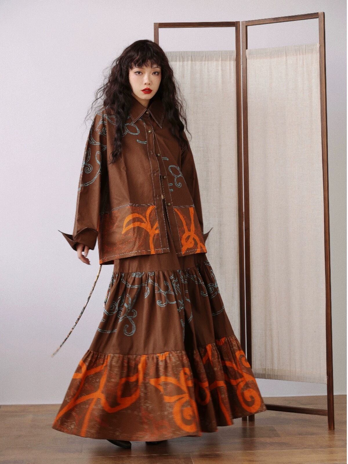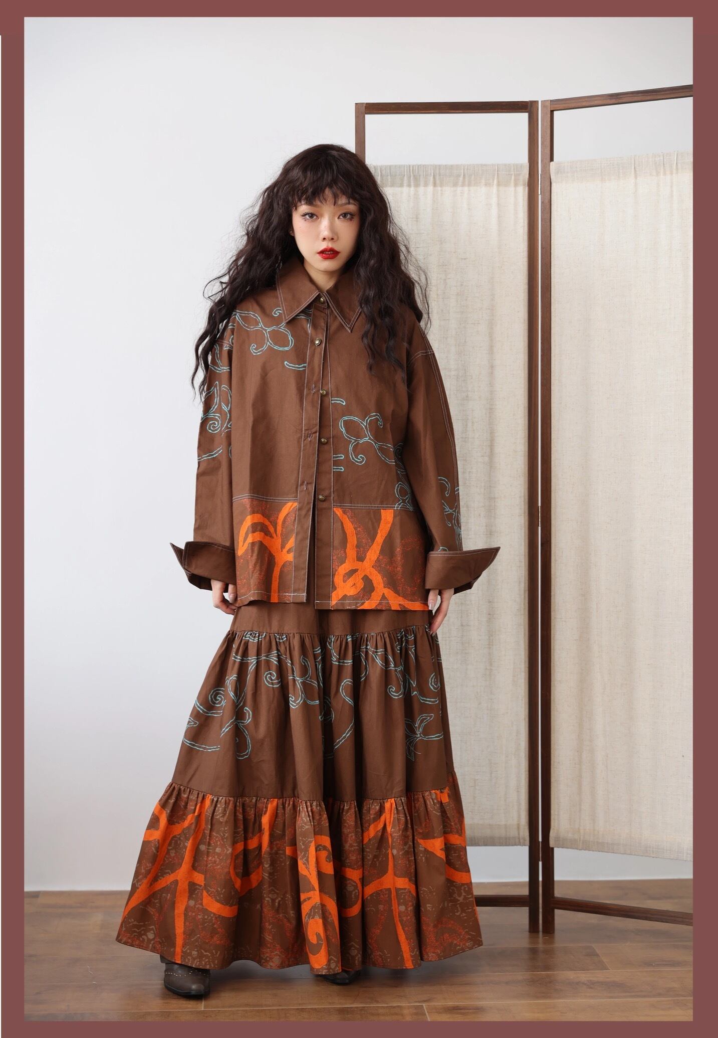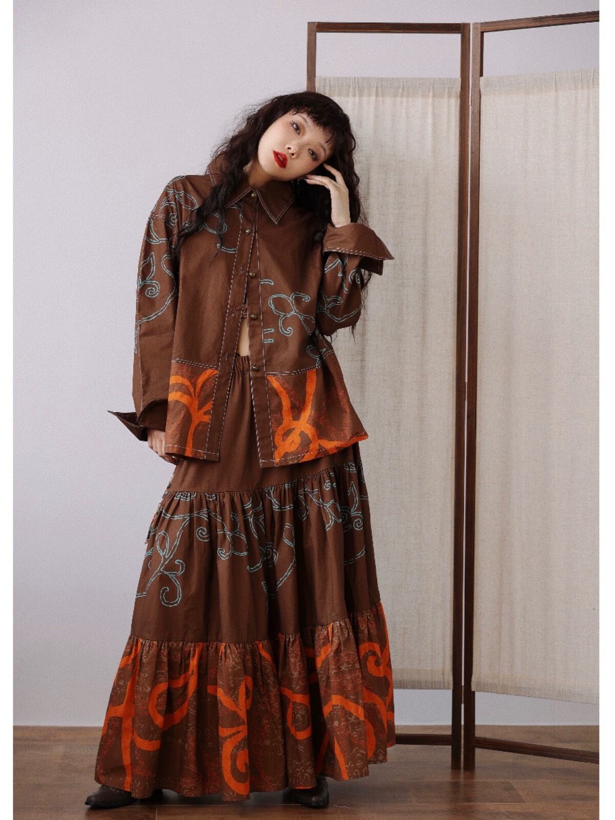 ブラウス スカート オレンジ 茶色 カジュアル ゆったり トップス セットアップ オレンジ アジアン エスニック