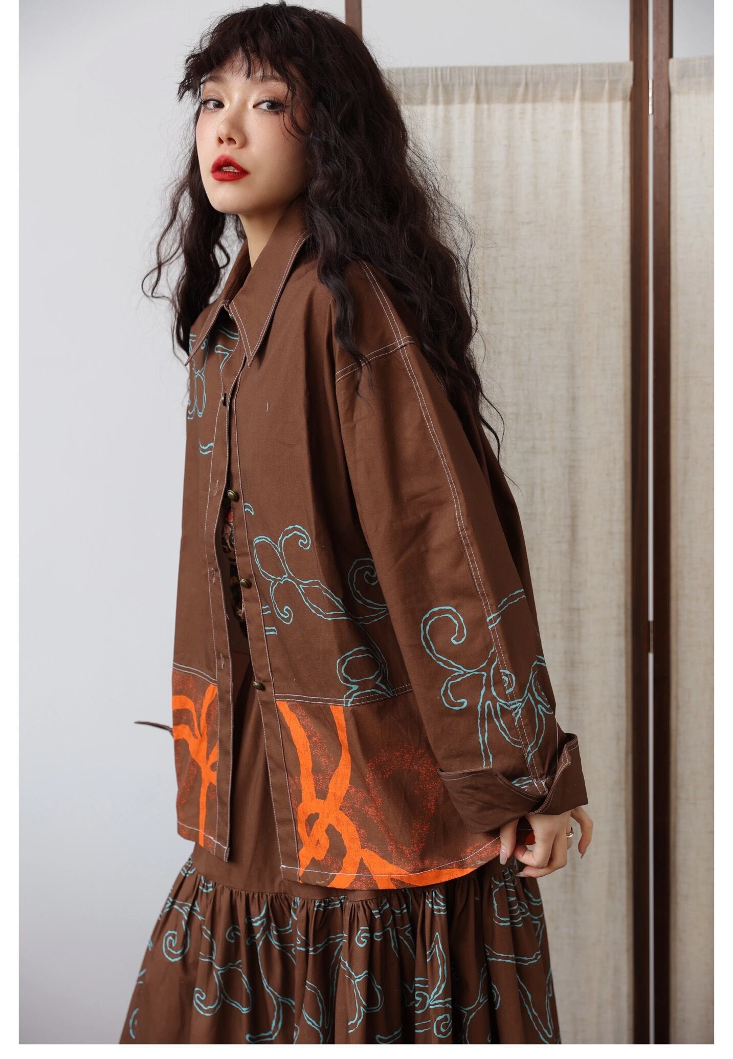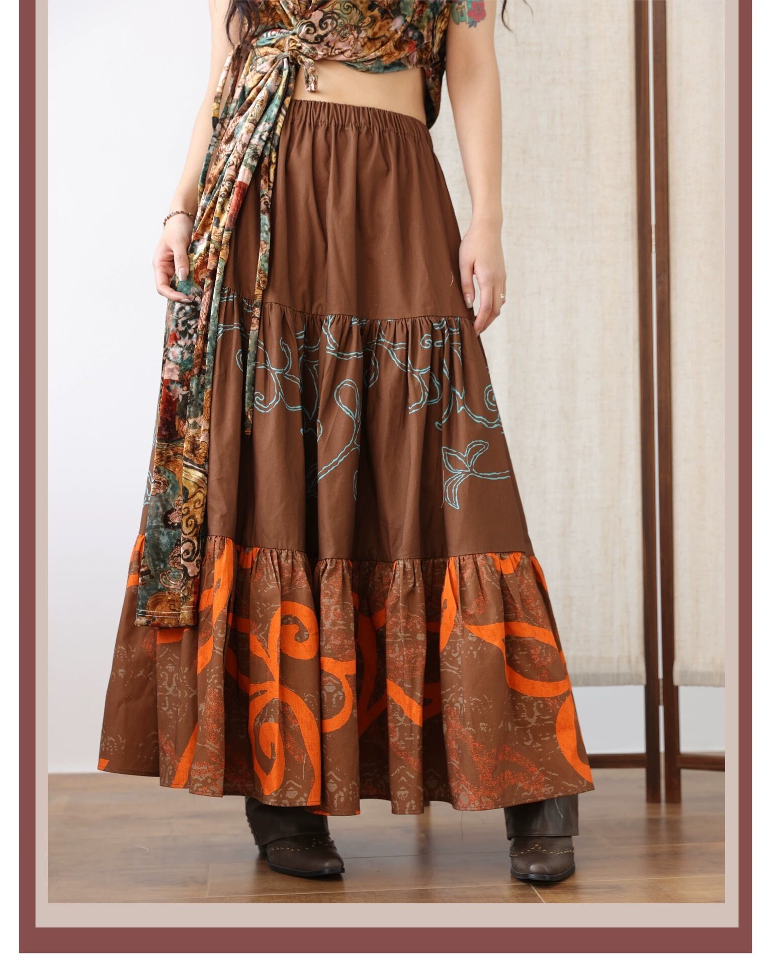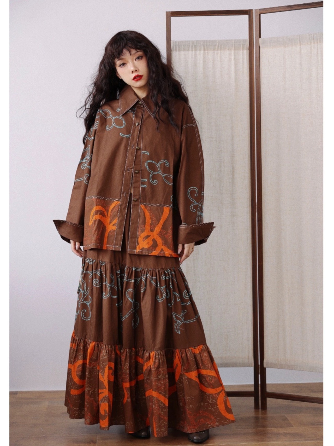 ブラウス スカート オレンジ 茶色 カジュアル ゆったり トップス セットアップ オレンジ アジアン エスニック