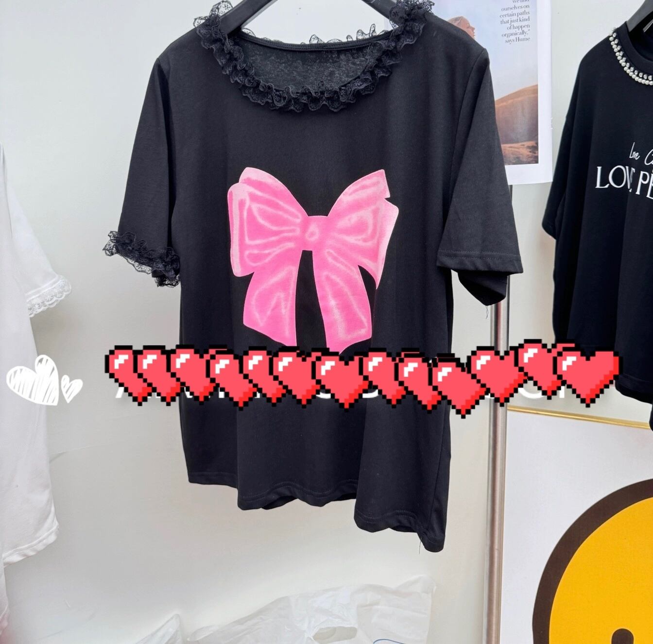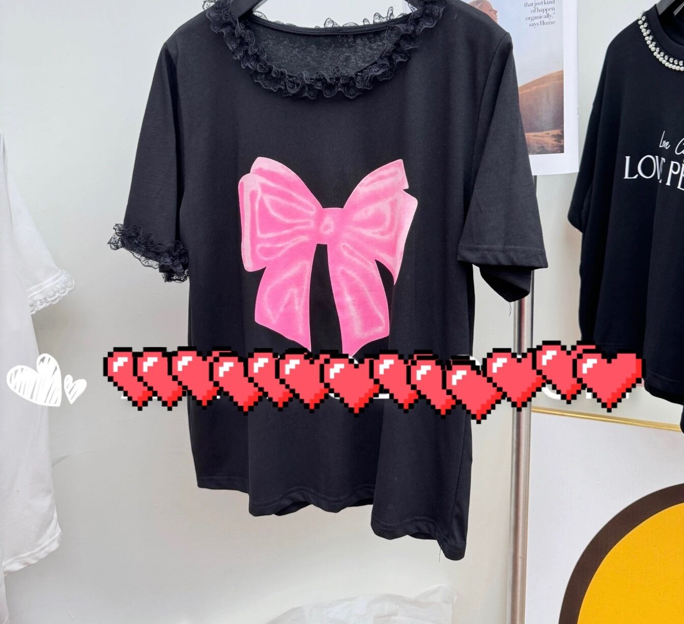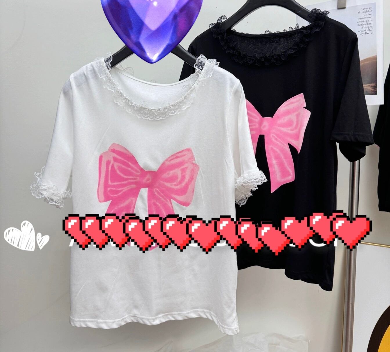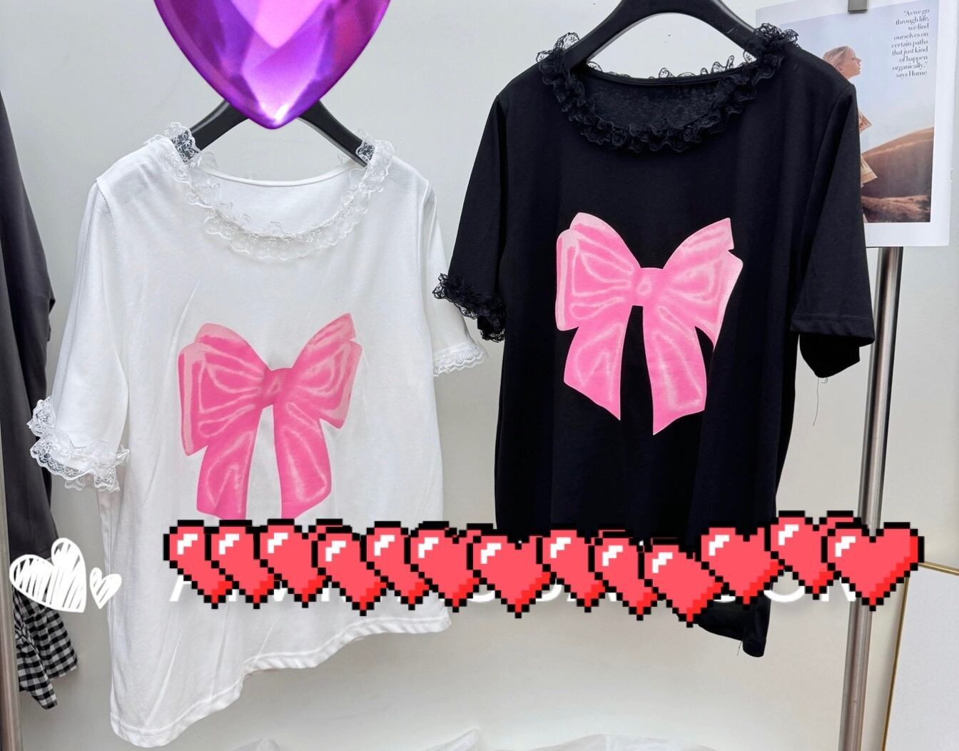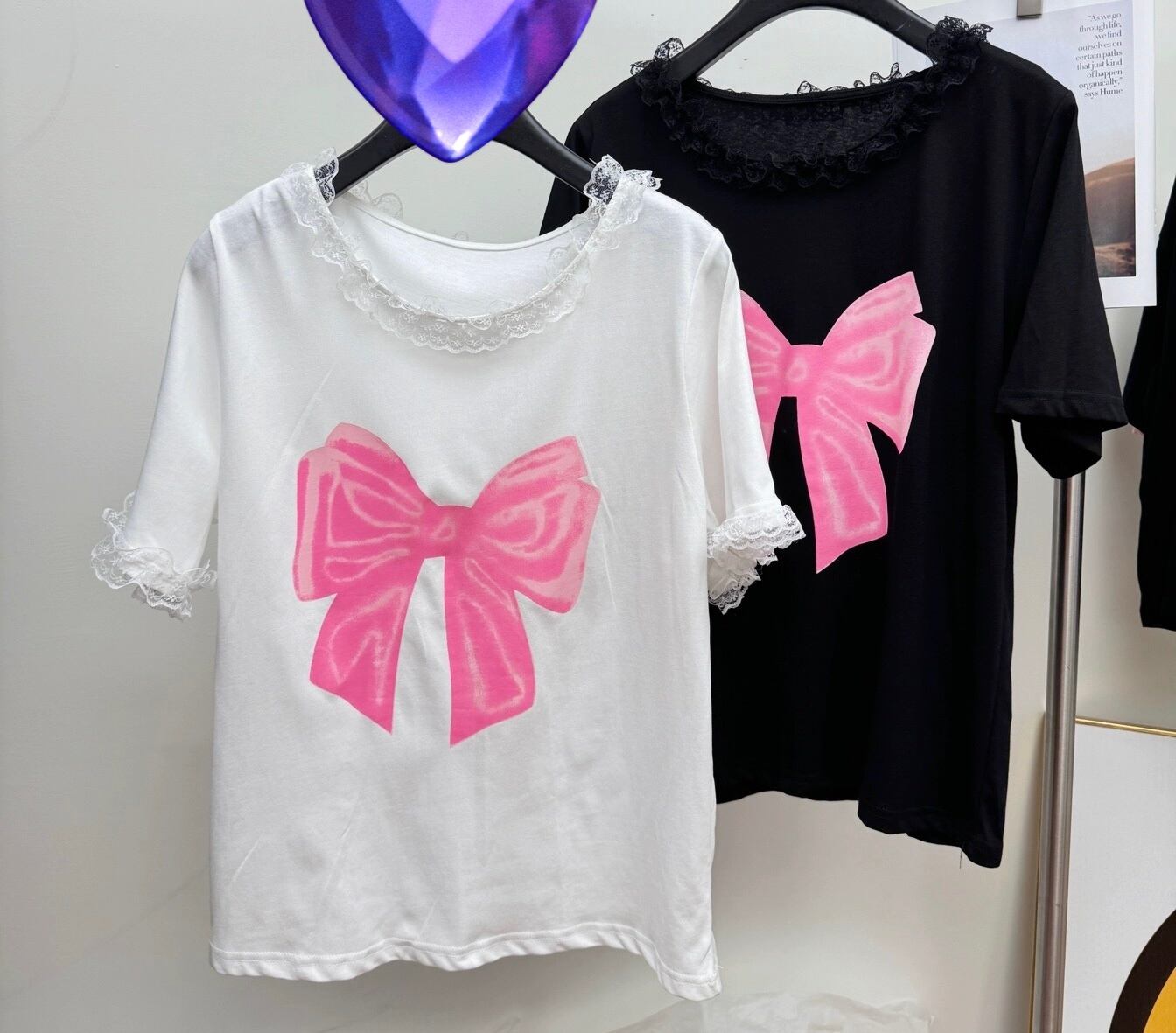 トップス 黒 白 ピンク リボン ガーリー Tシャツ