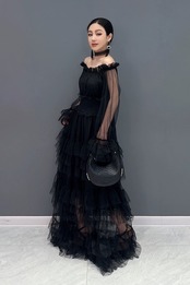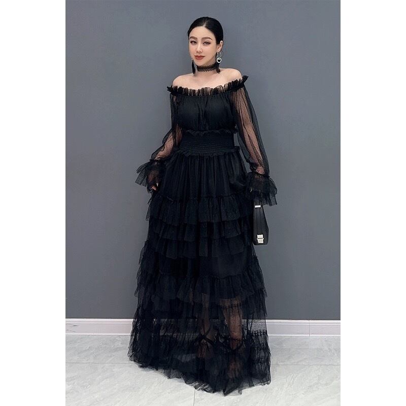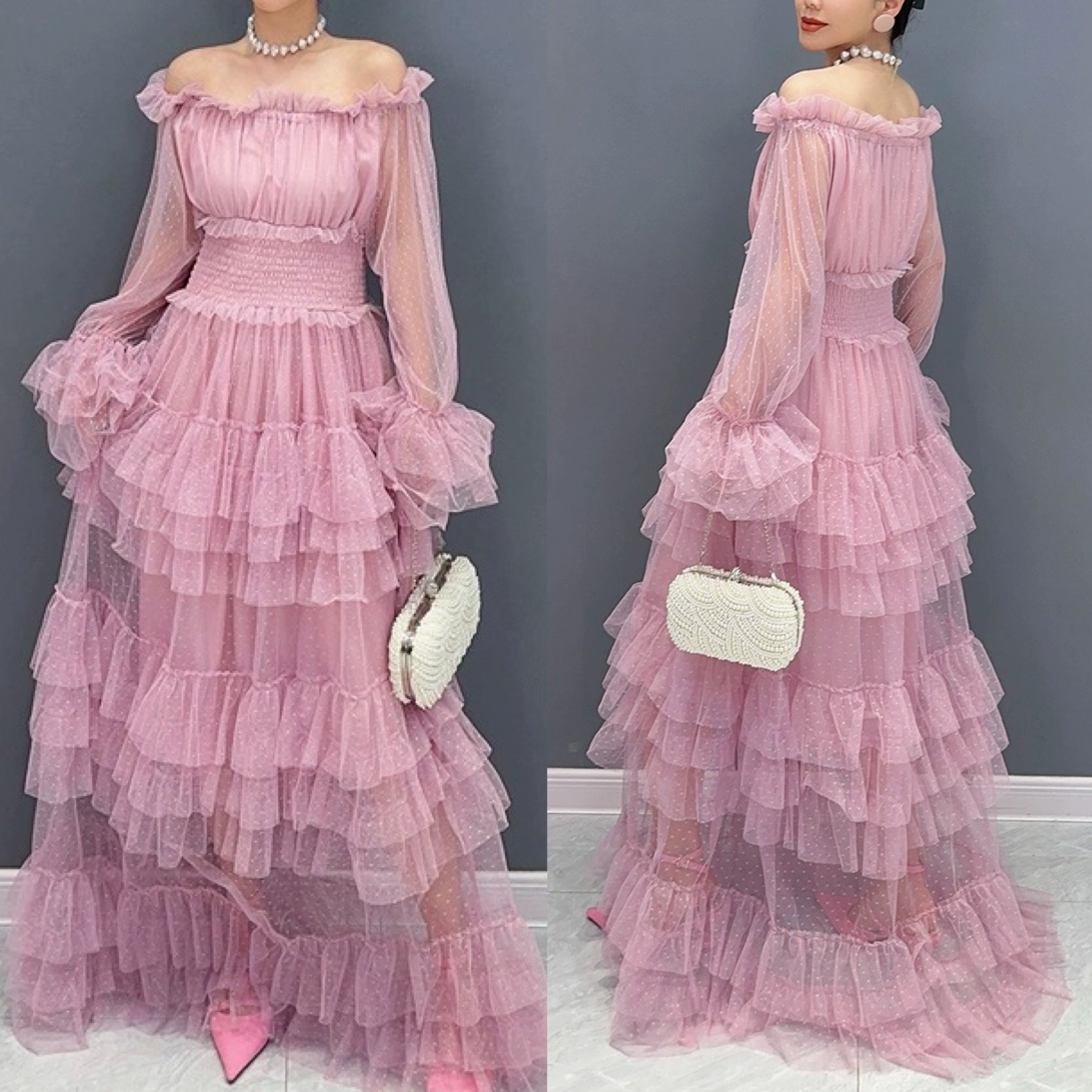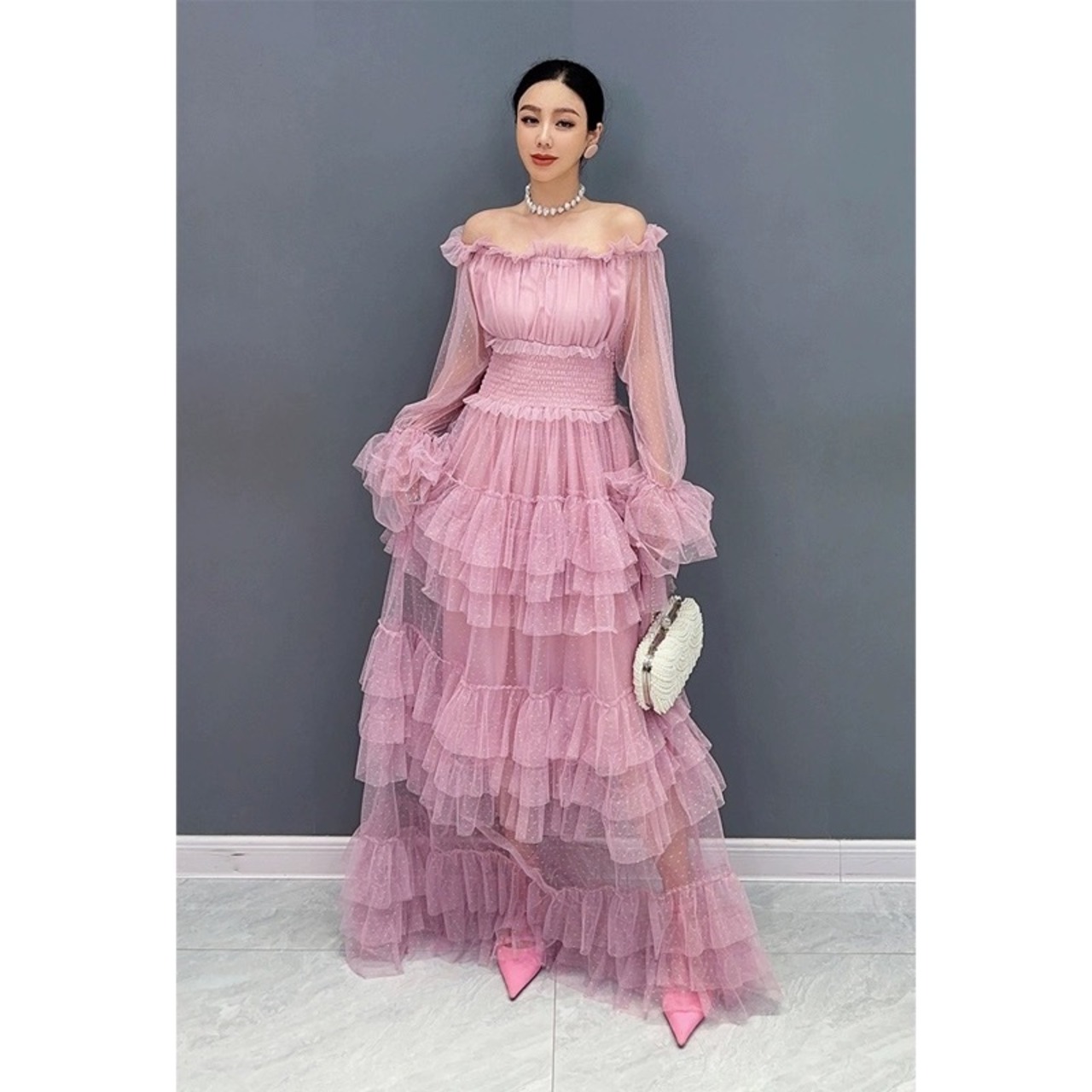 【ピンク】オフショルダー ワンピース ドレス 水玉 エレガント XL