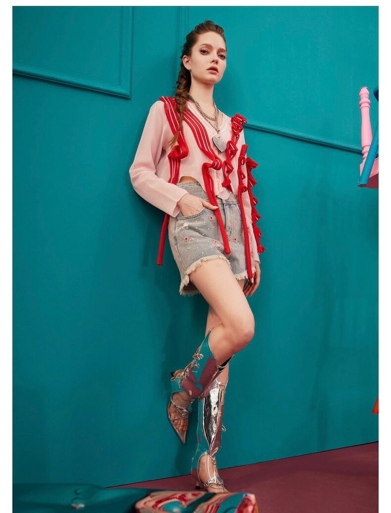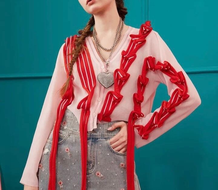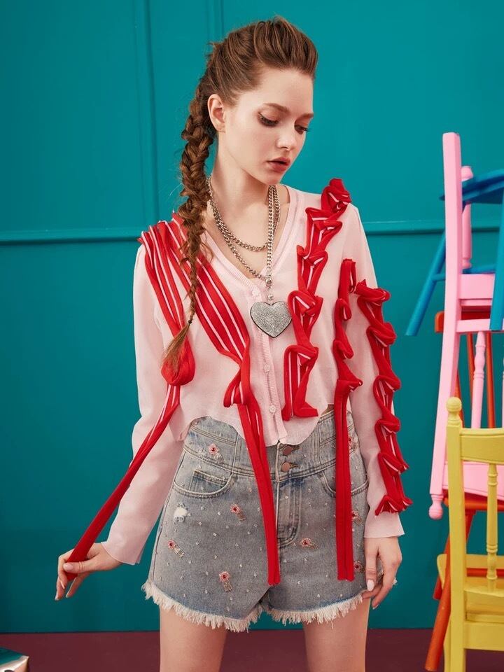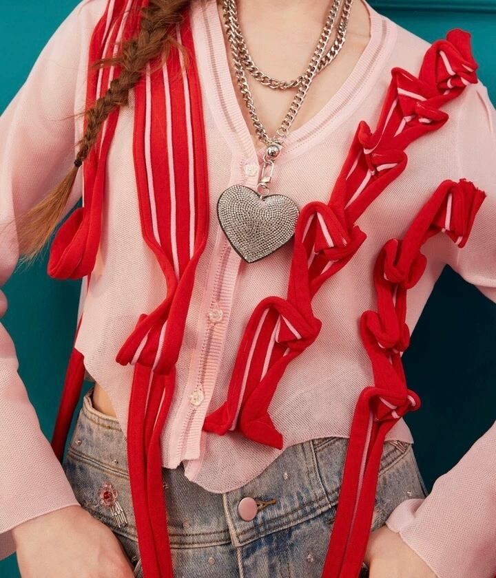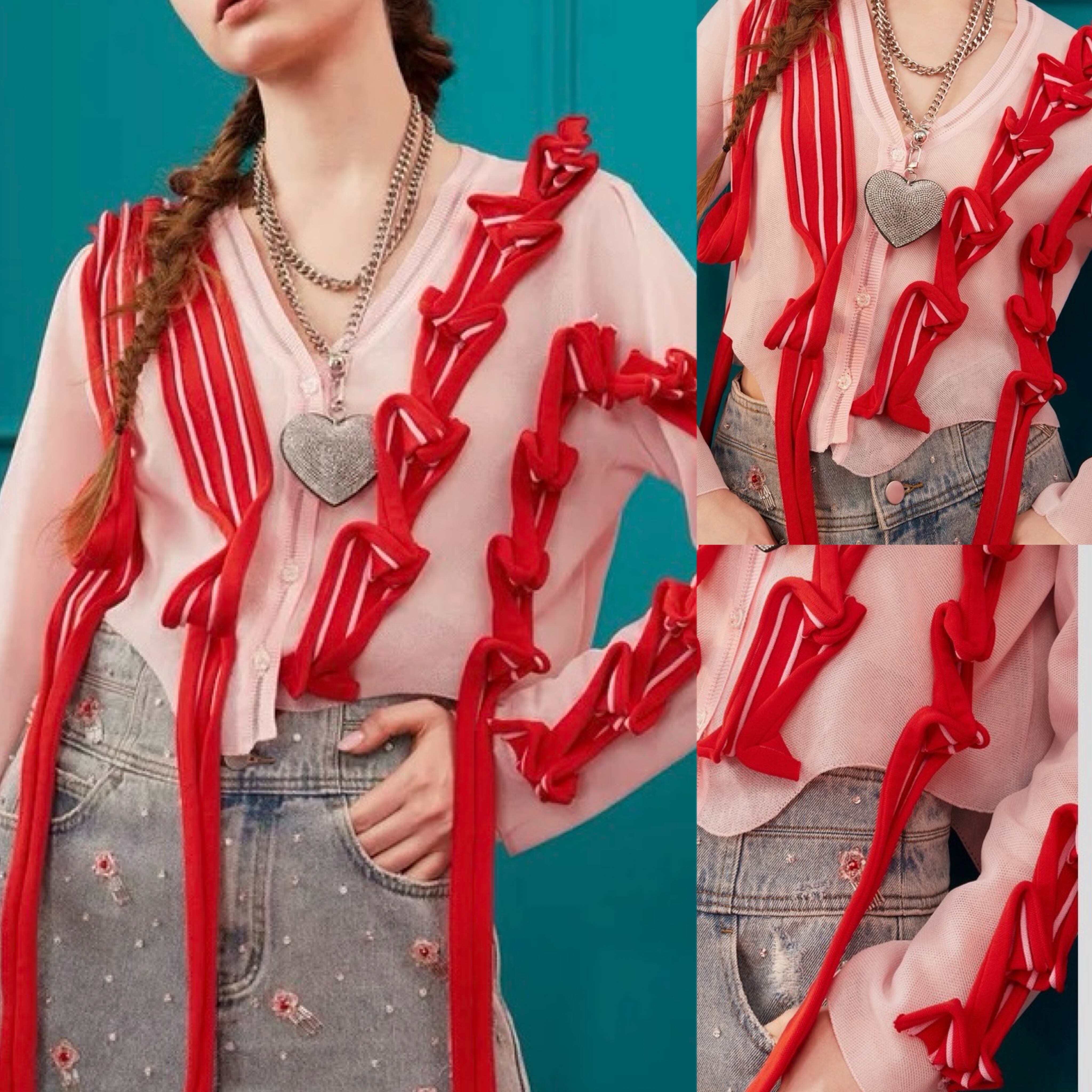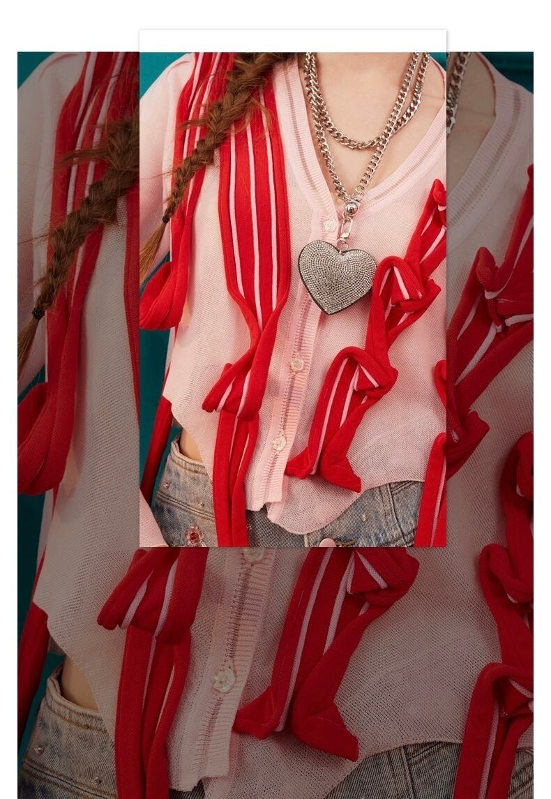 ピンク 赤 リボン カーディガン XL トップス セーター ニット