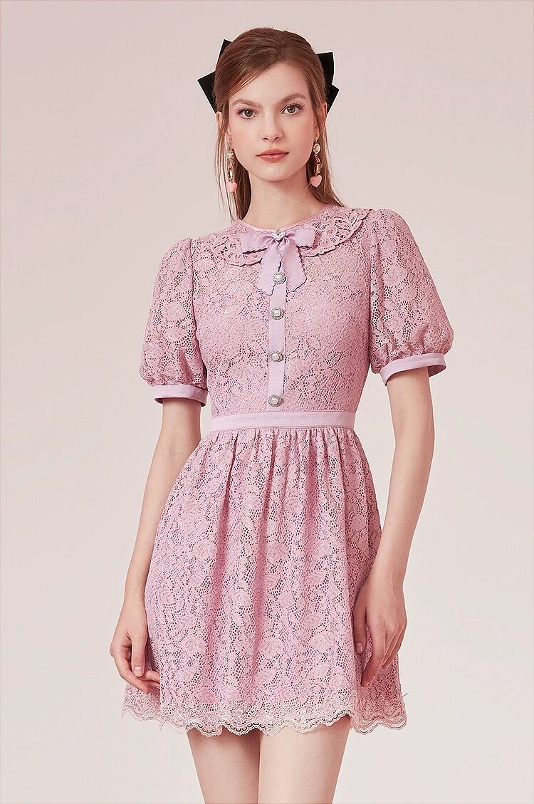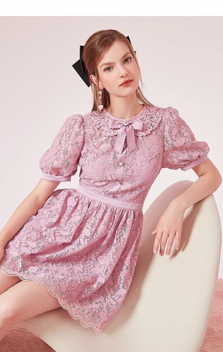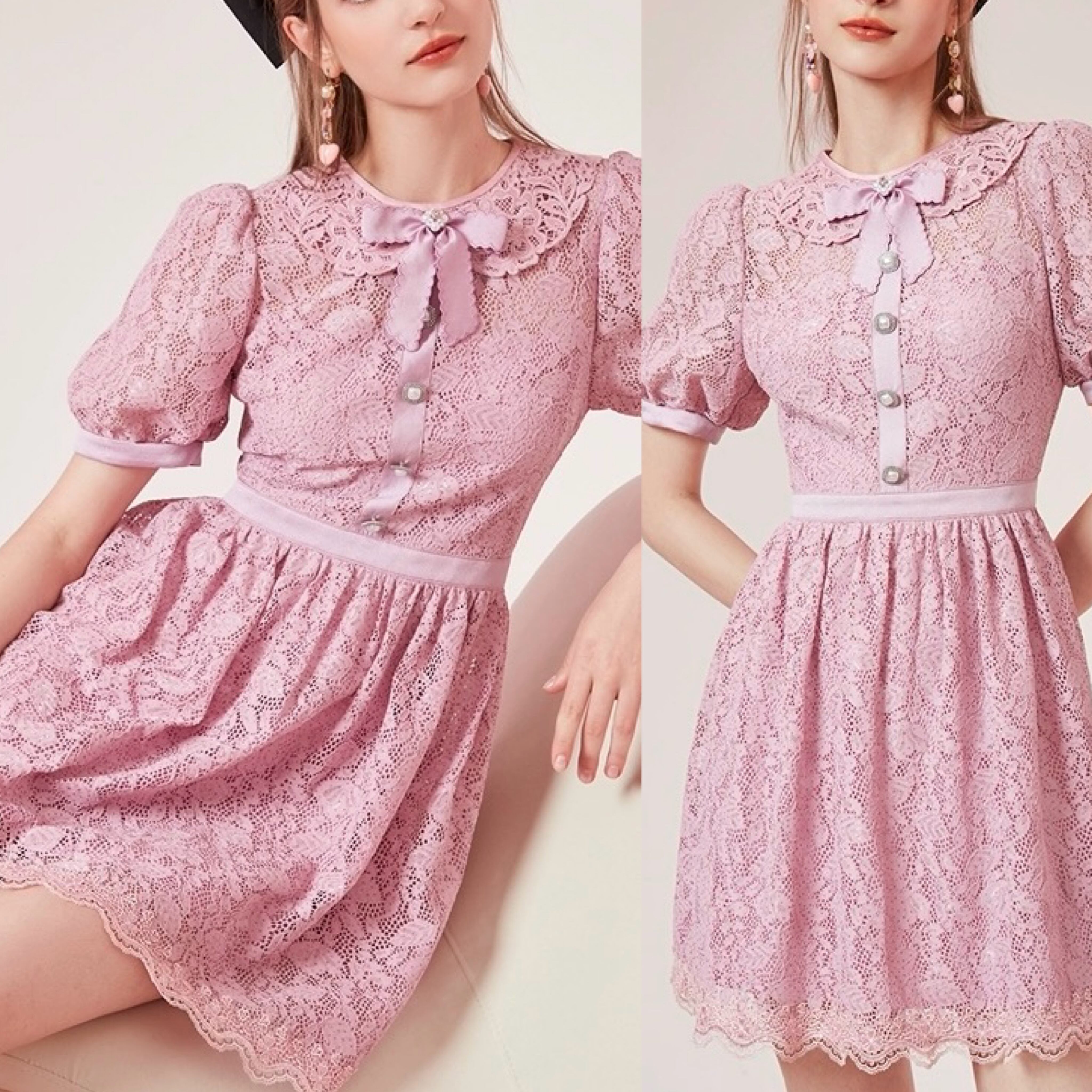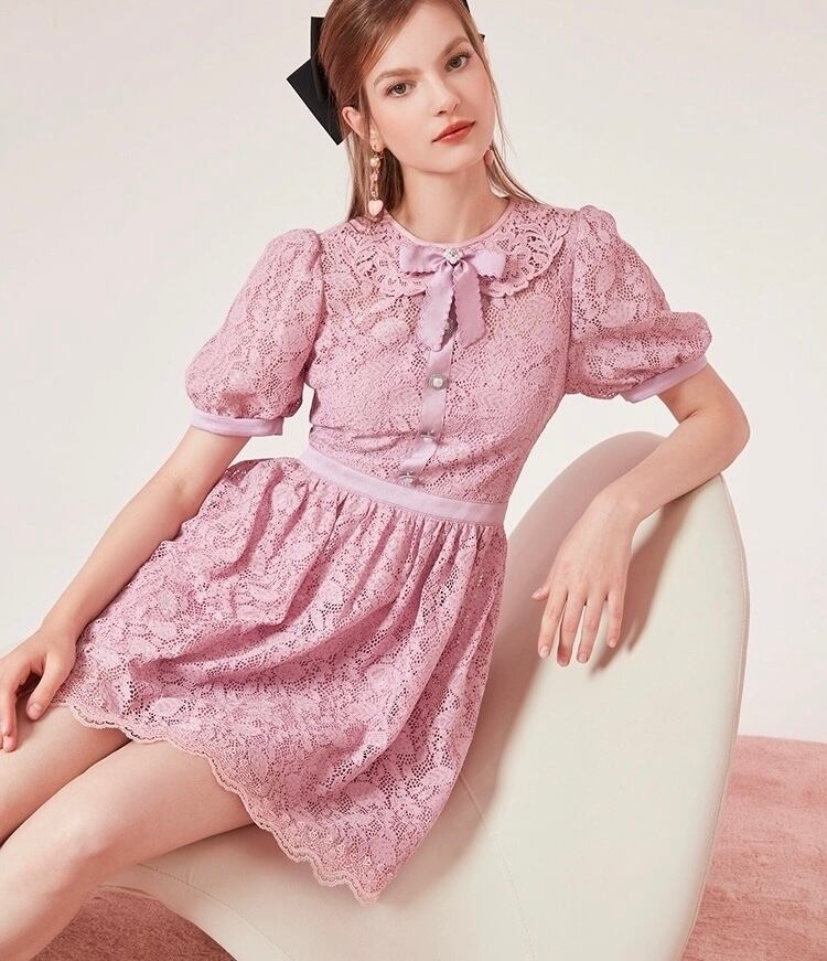 ピンク 紫 丸襟 ワンピース ガーリー レース ブラウス お嬢様 XL