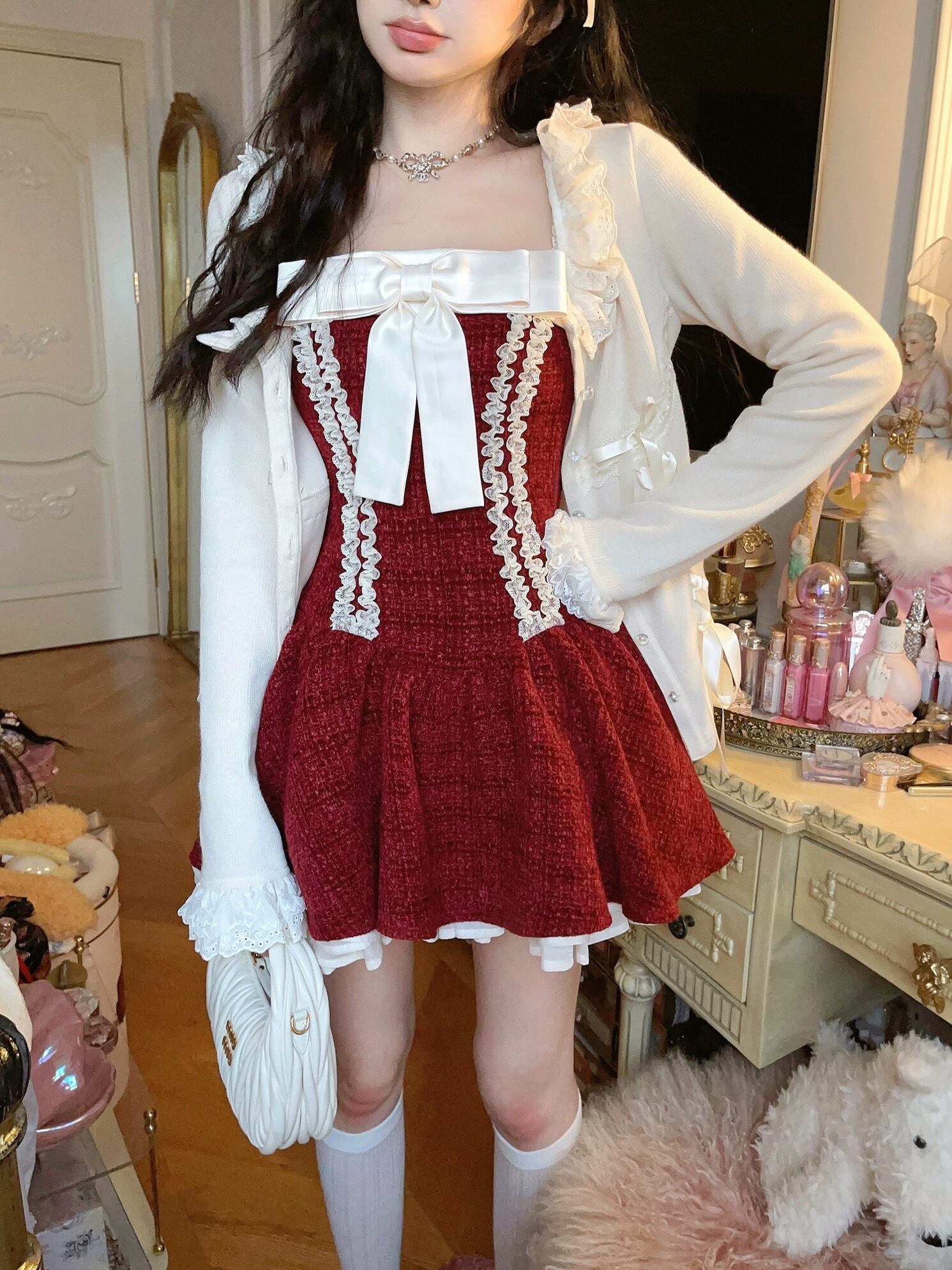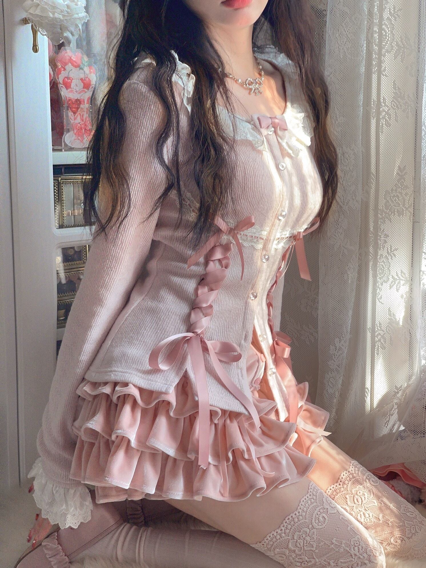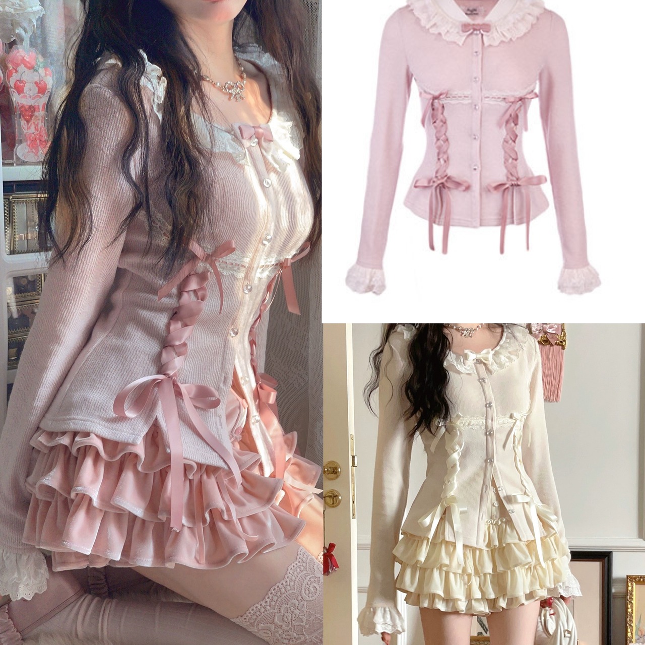 カーディガン リボン ピンク 白 カジュアル ガーリー 可愛い