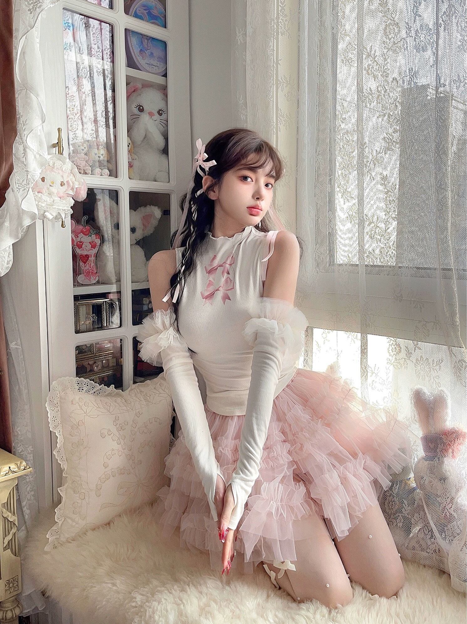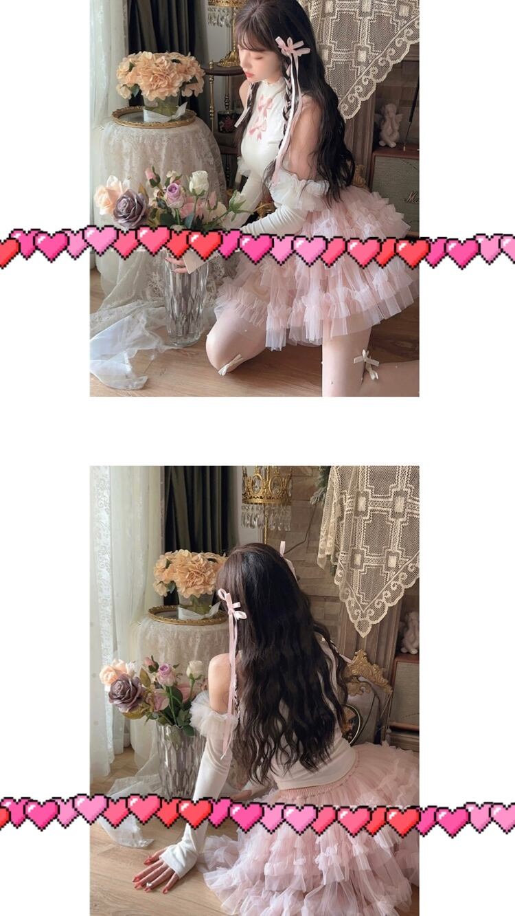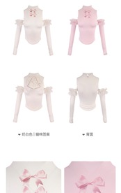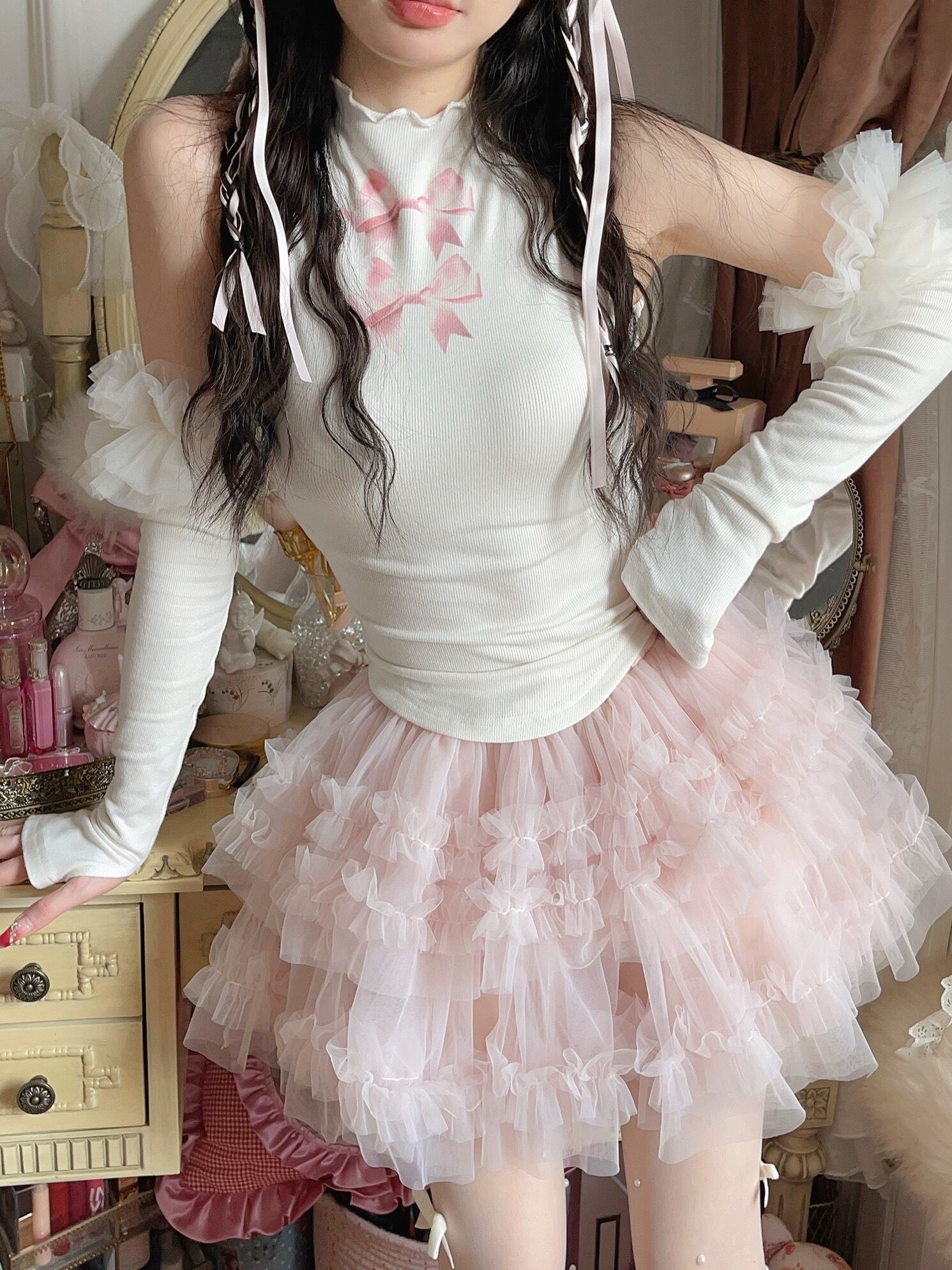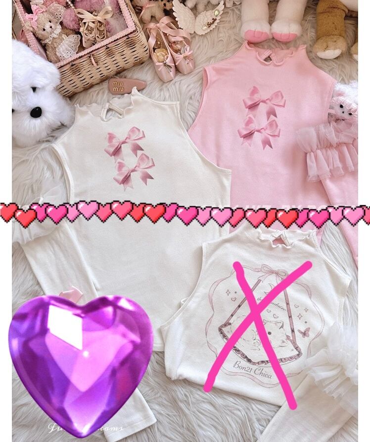 【アームウォーマーつき】ガーリー ブラウス スウェット タンクトップ 白 ピンク リボン