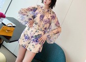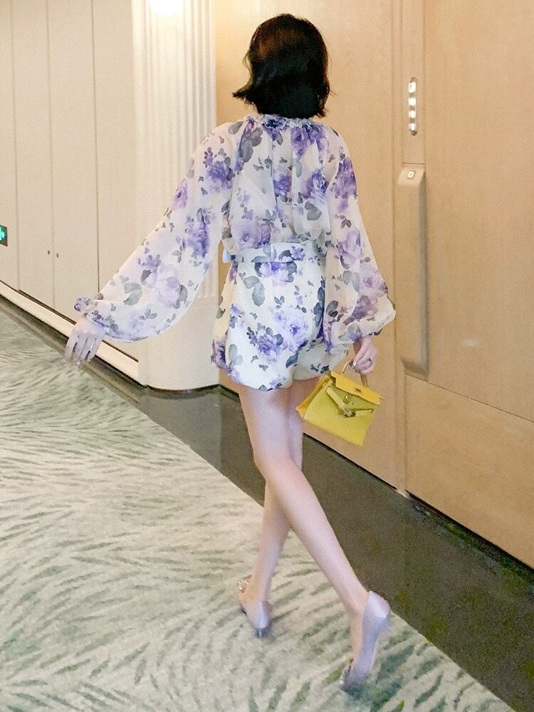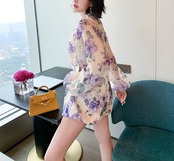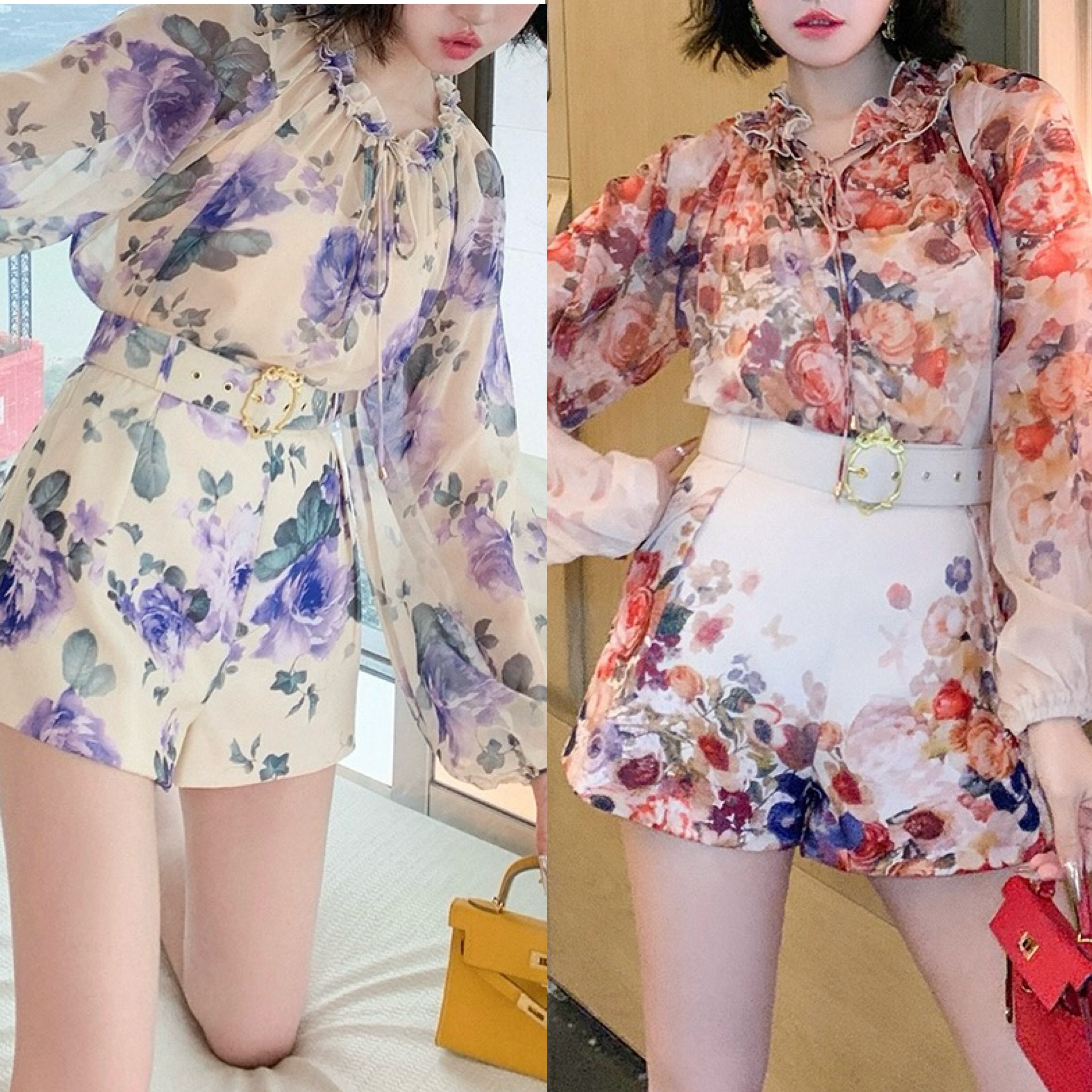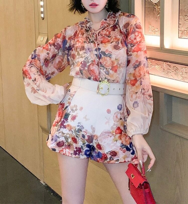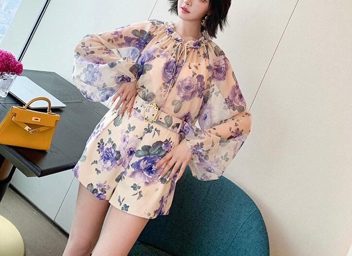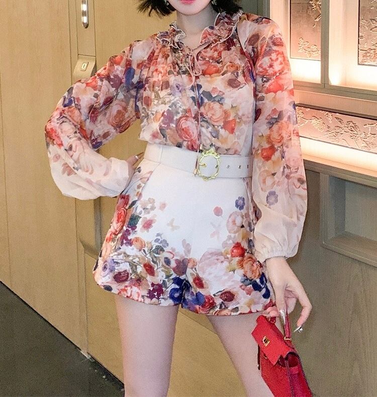 【セットアップ】花柄 水色 紫 ブラウス 薔薇 オレンジ ブラウス スーツ