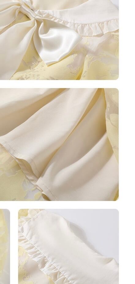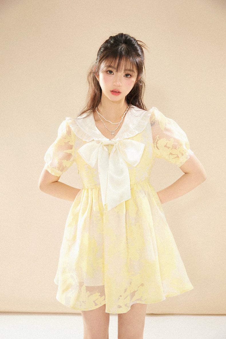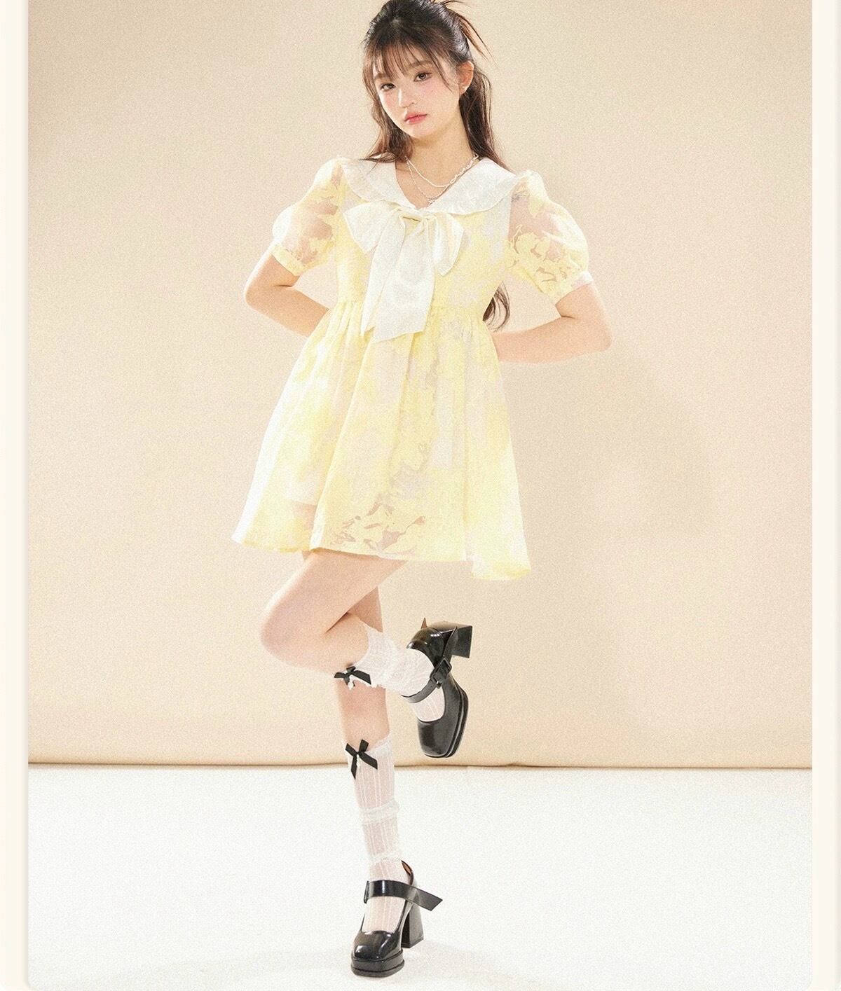 黄色 ブラウス 丸襟 リボン 花柄 フラワー ガーリー ワンピース リボン