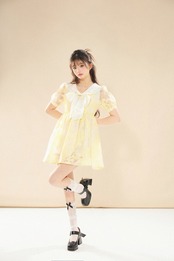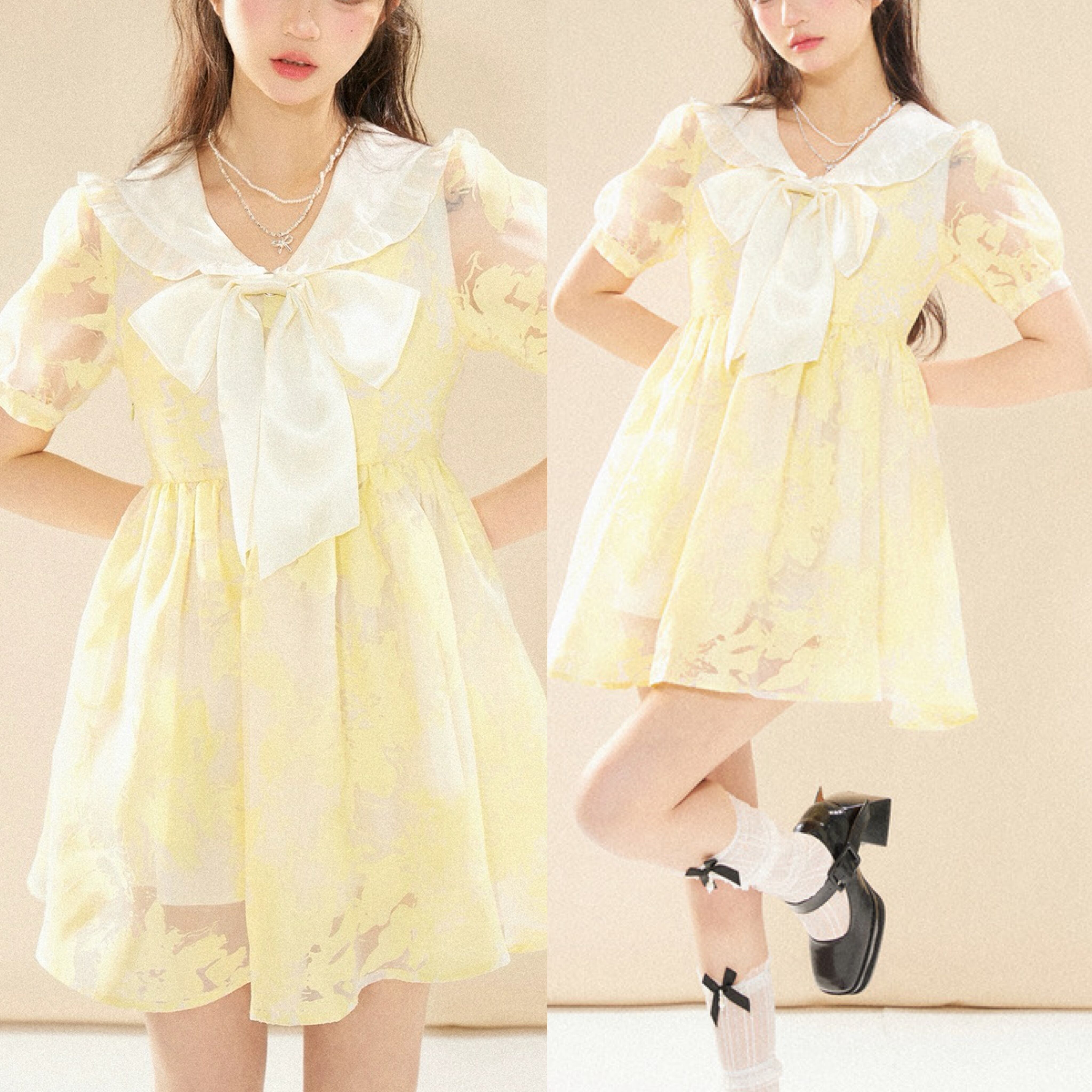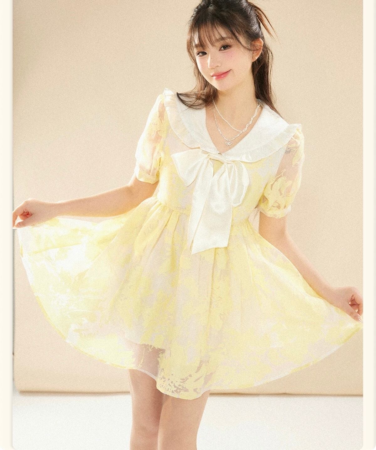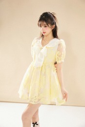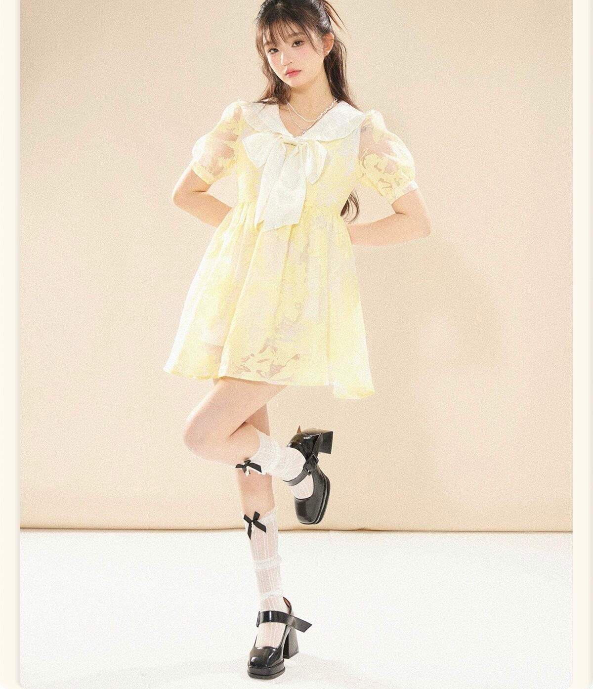 黄色 ブラウス 丸襟 リボン 花柄 フラワー ガーリー ワンピース リボン