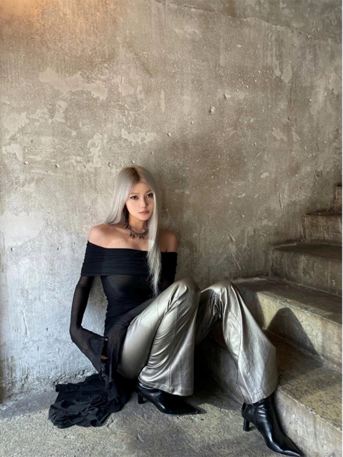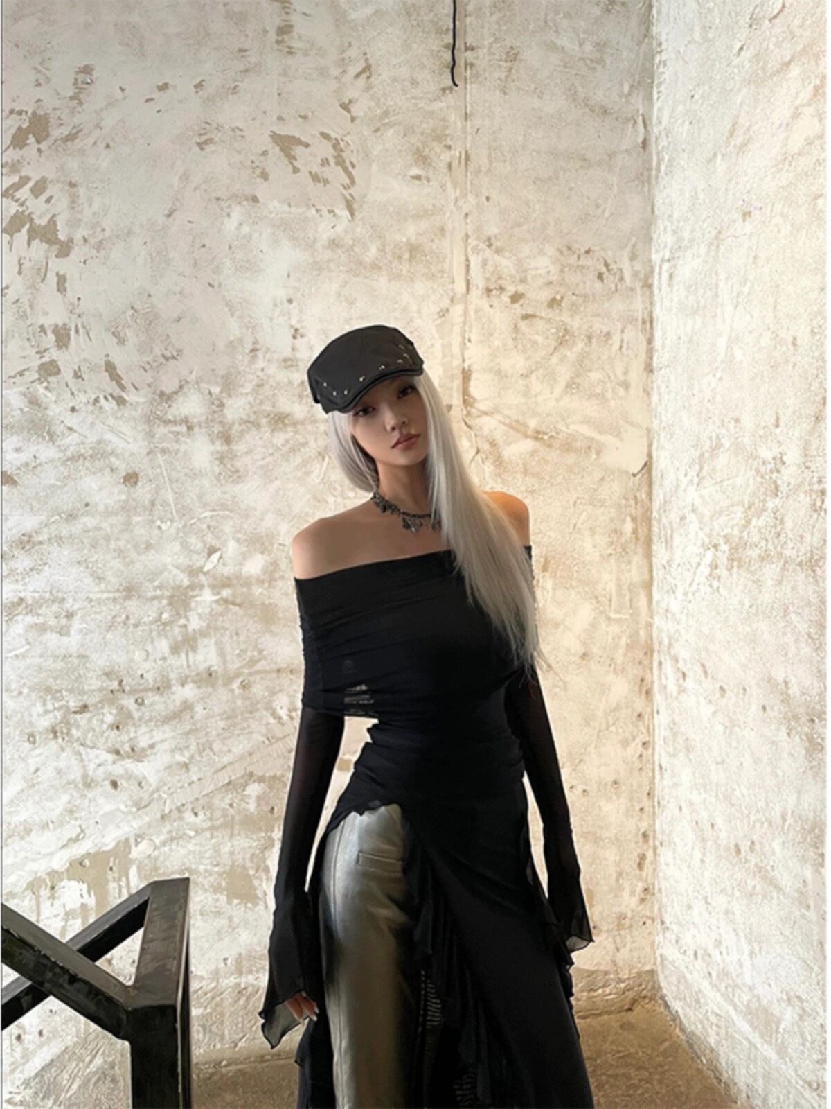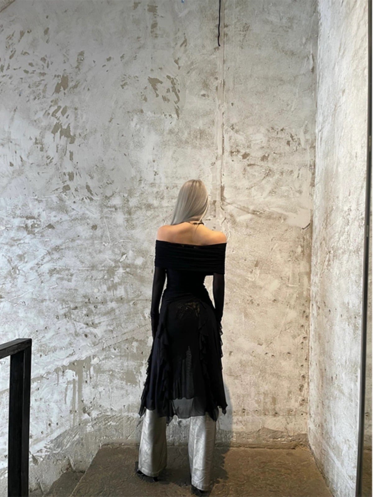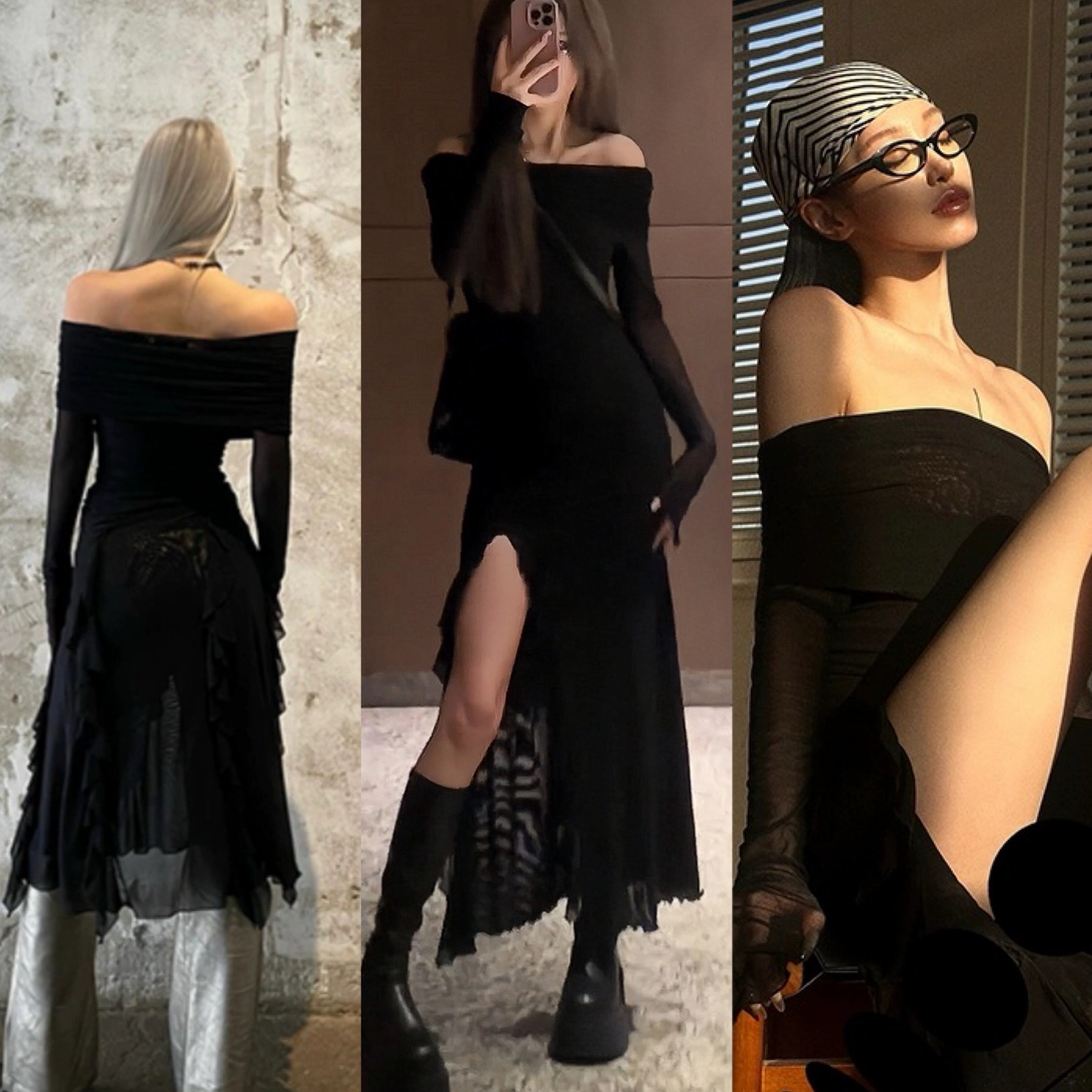 黒 セクシー シースルー ワンピース オフショルダー マキシ