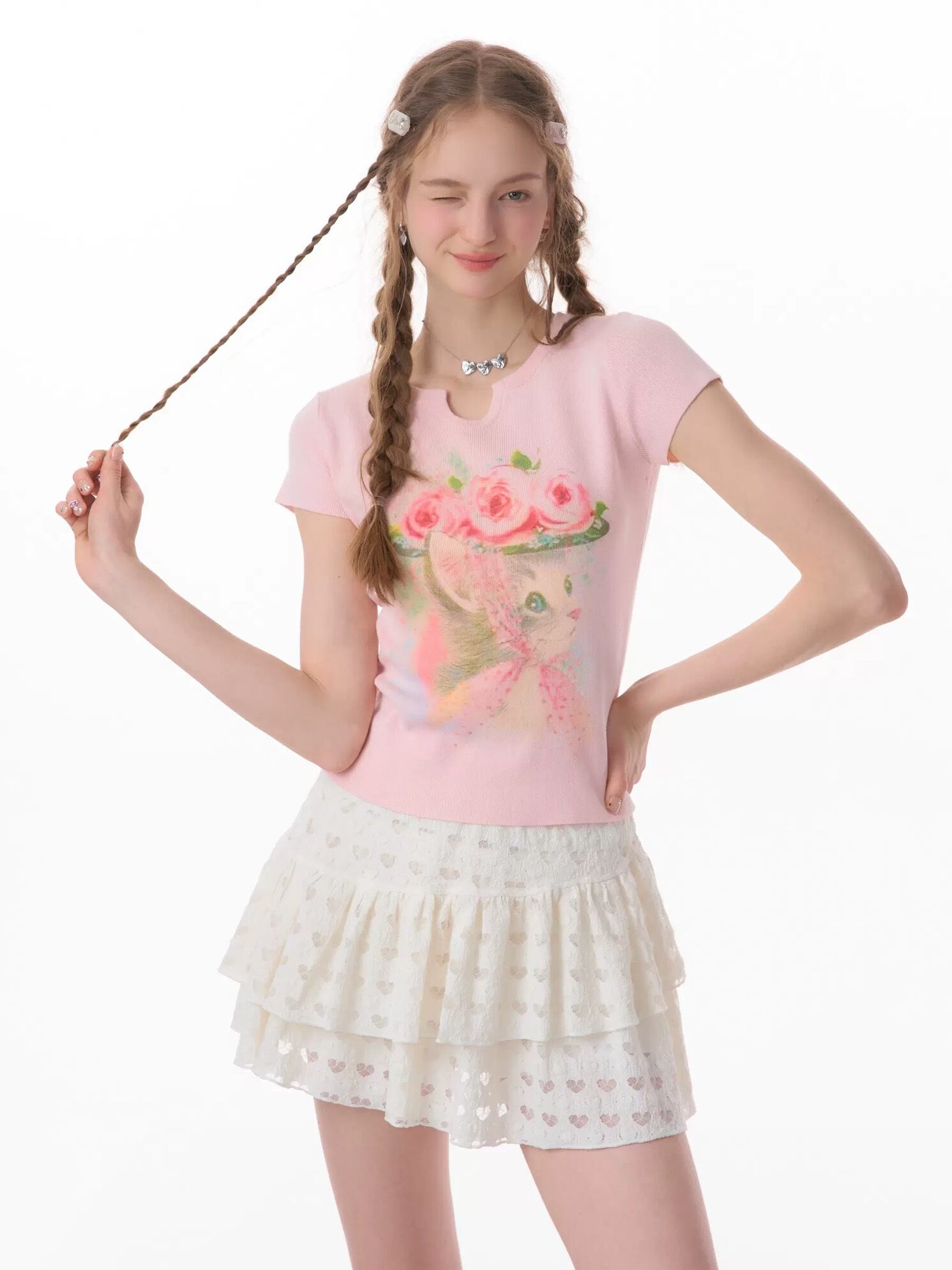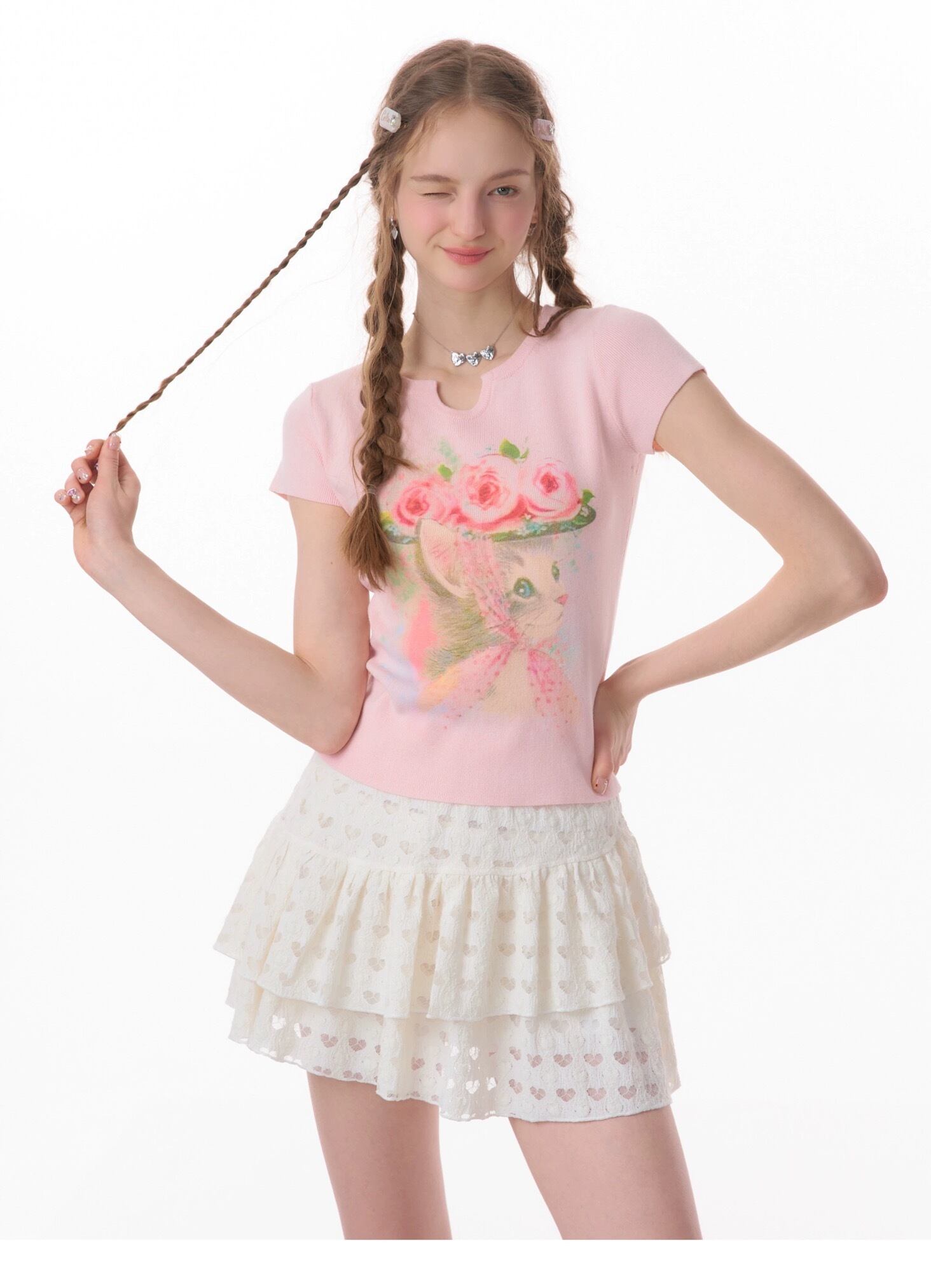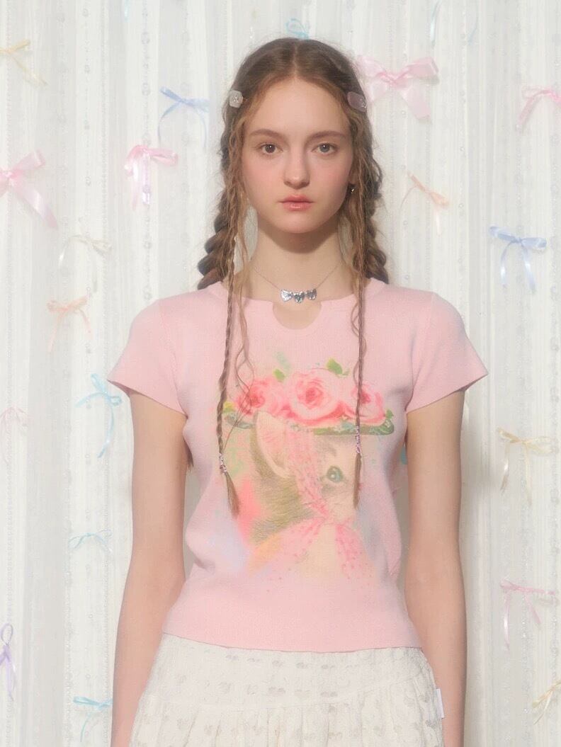 ピンク 黄色 トップス ねこ 花柄 フラワー
