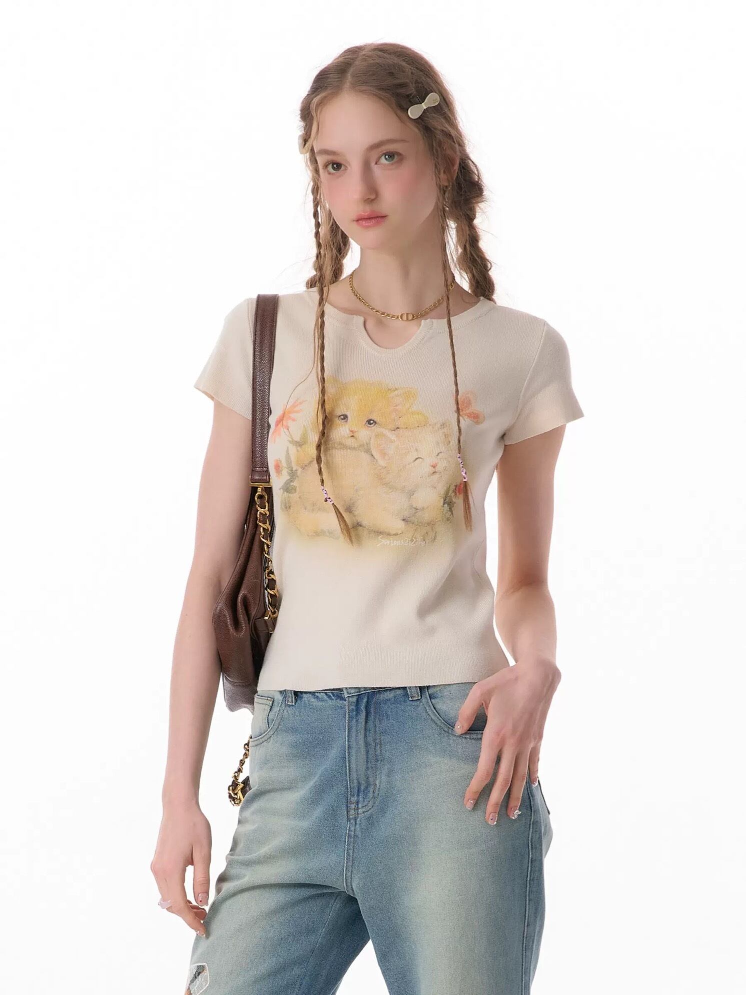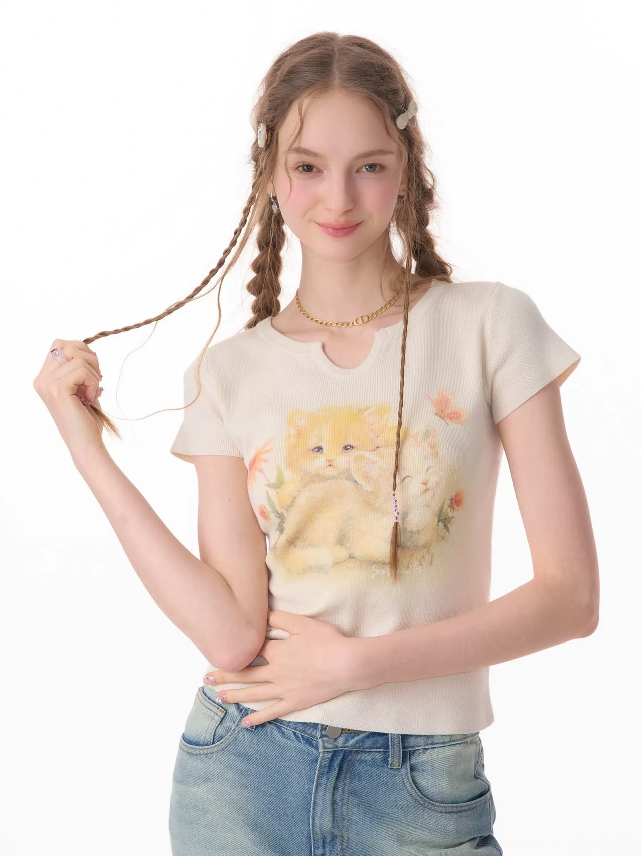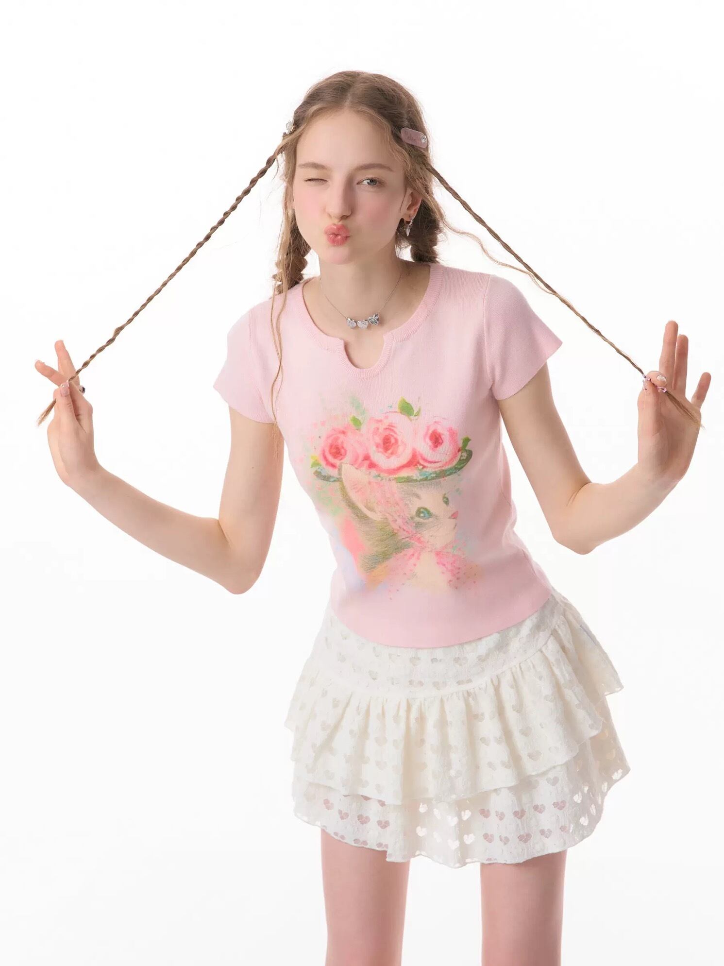 ピンク 黄色 トップス ねこ 花柄 フラワー