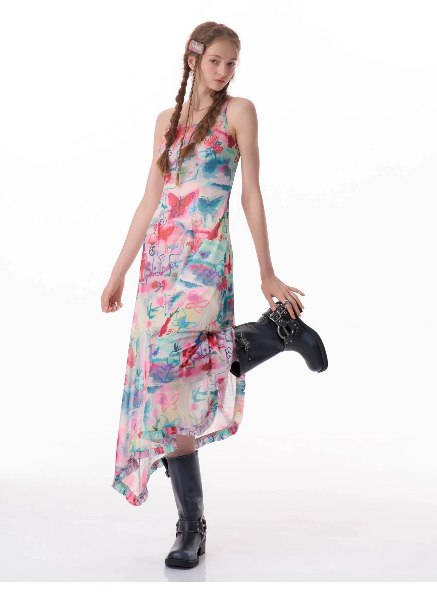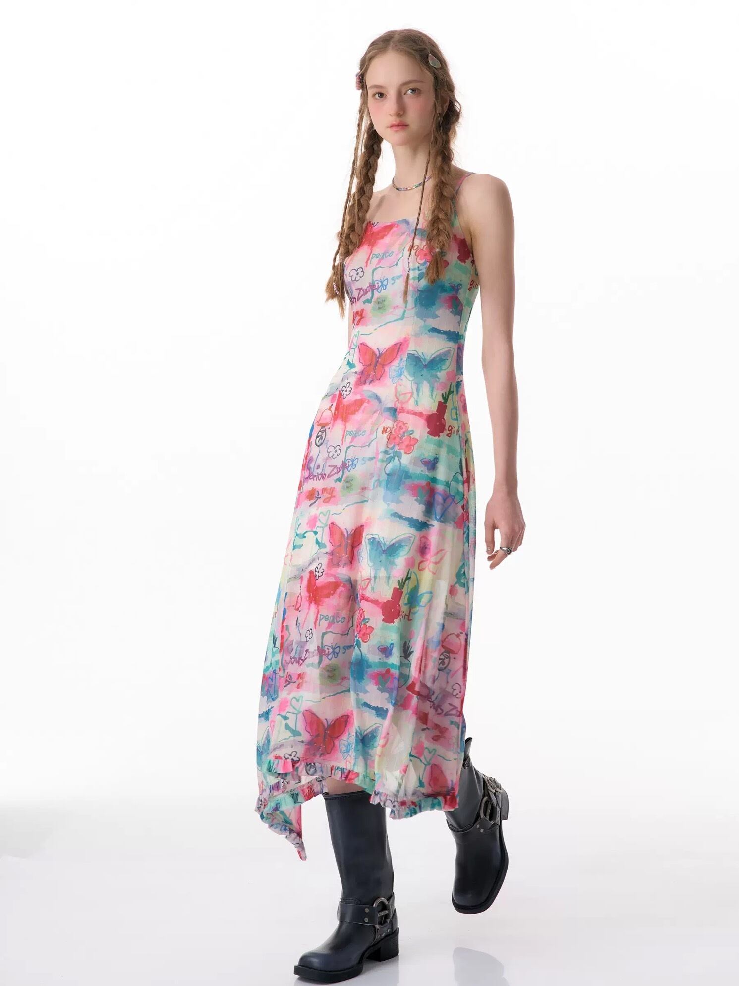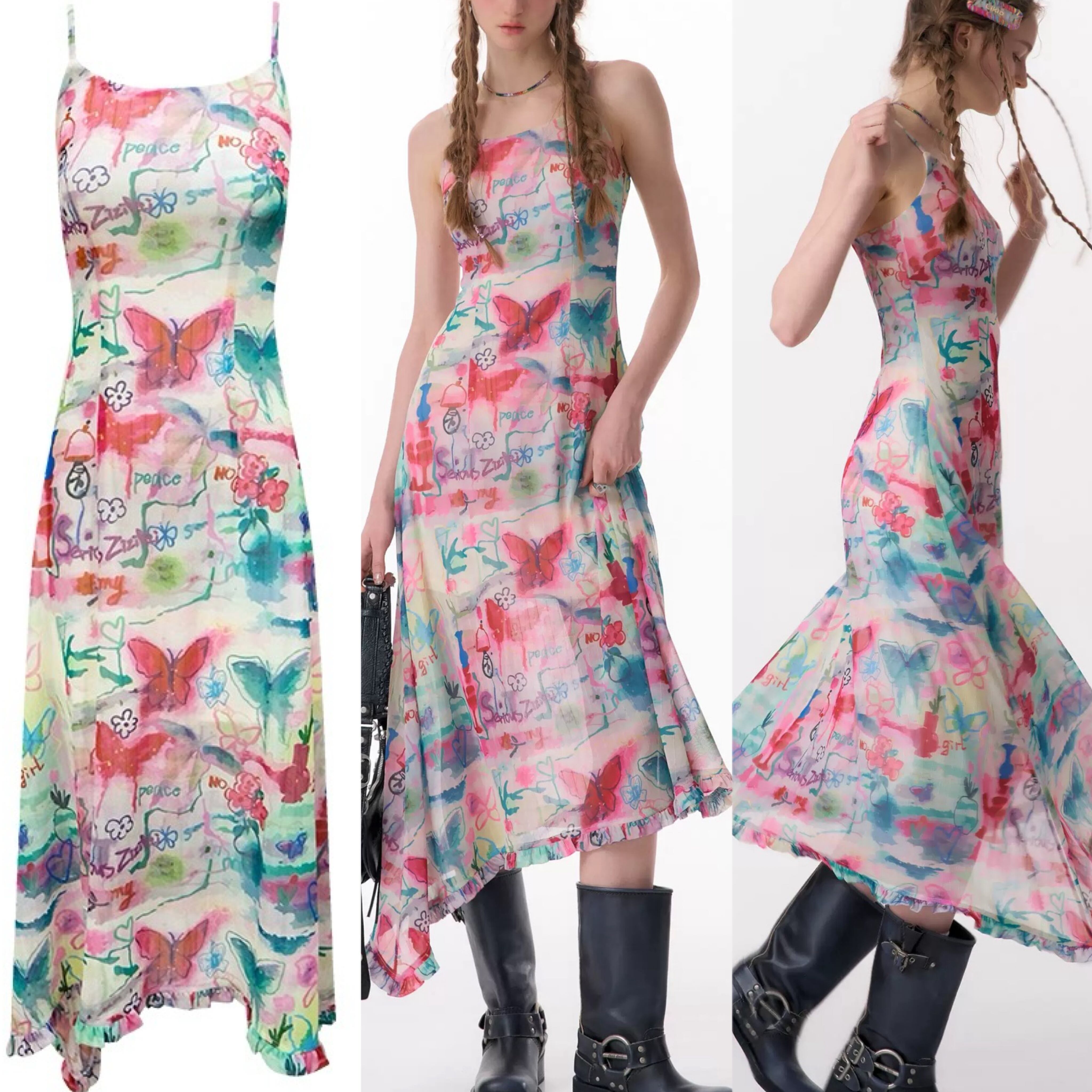 カラフル ワンピース バタフライ 水色 ピンク キャミソール