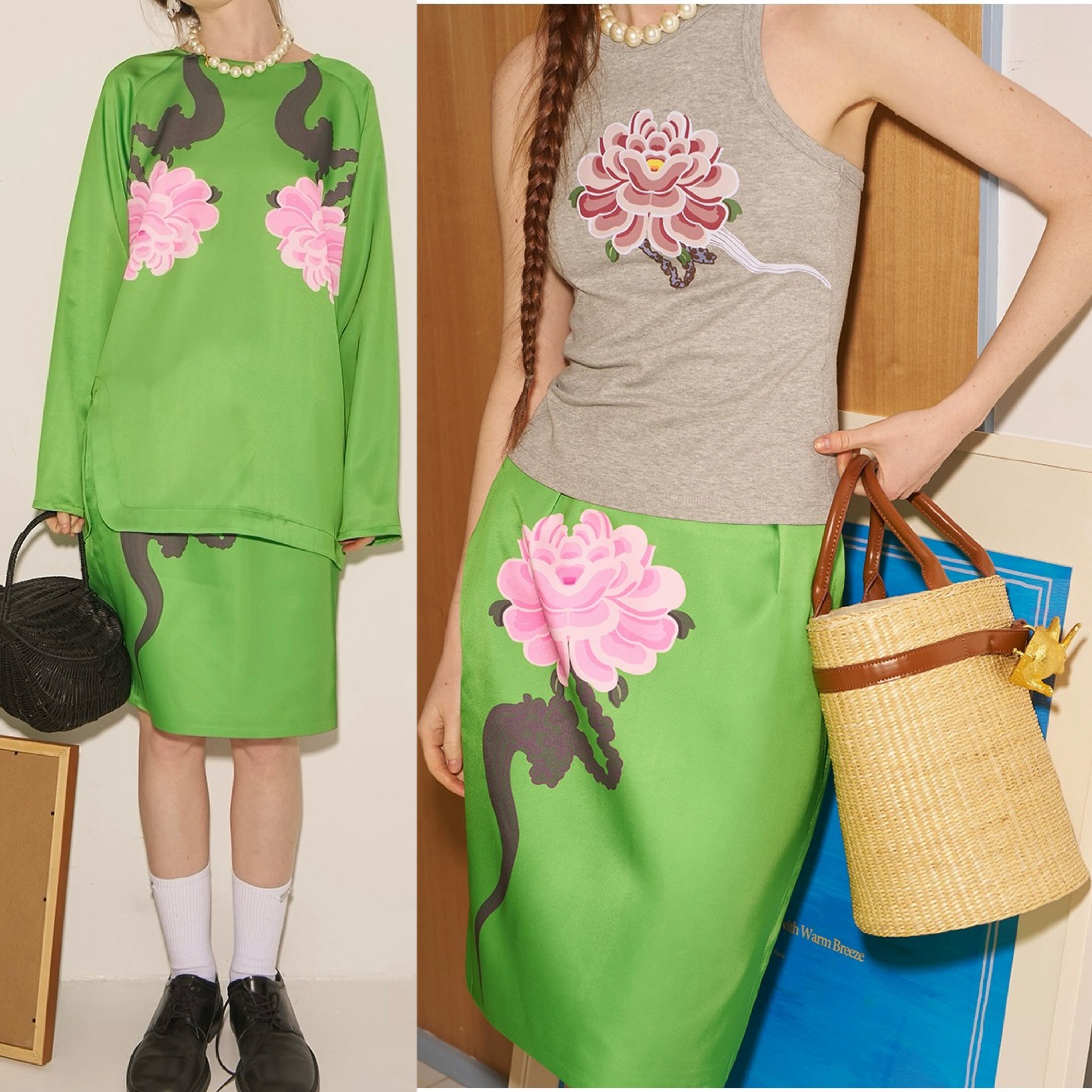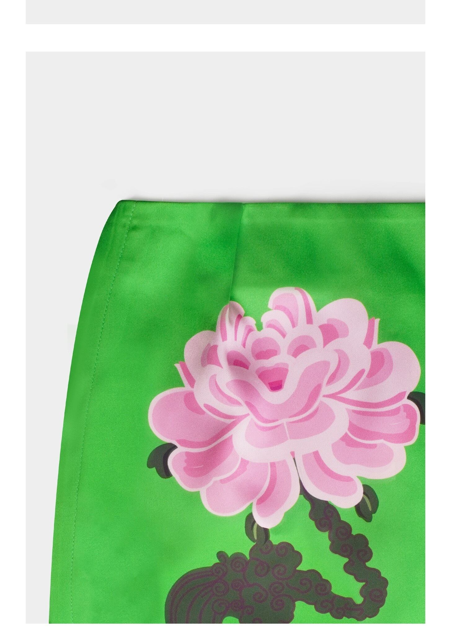 【ボトムス】緑 グリーン 花柄 ピンク チャイナ スカート