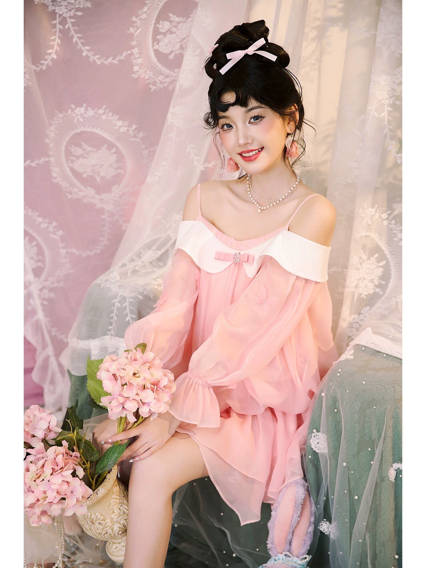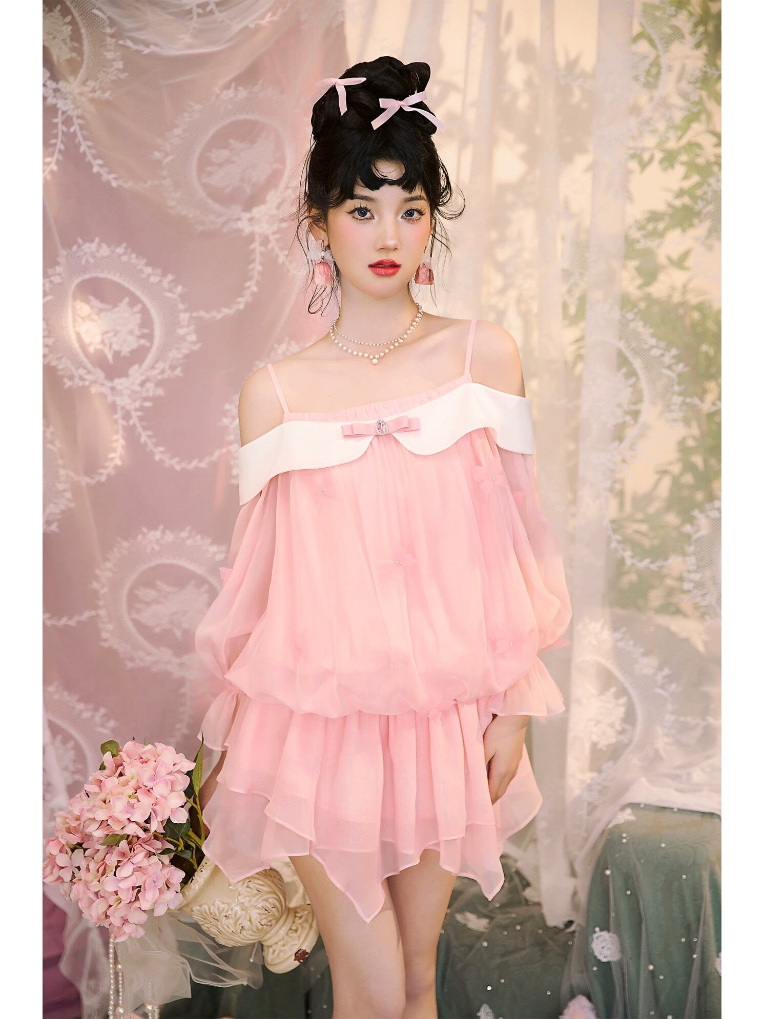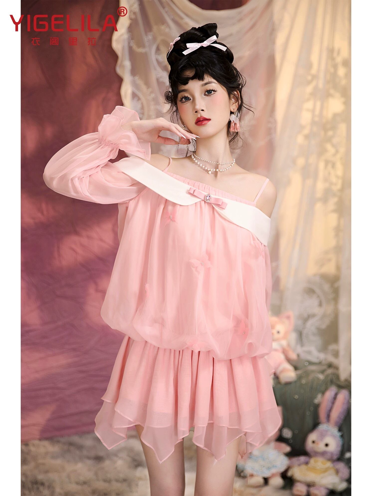 オフショルダー ピンク ブラウス チュニック ワンピース