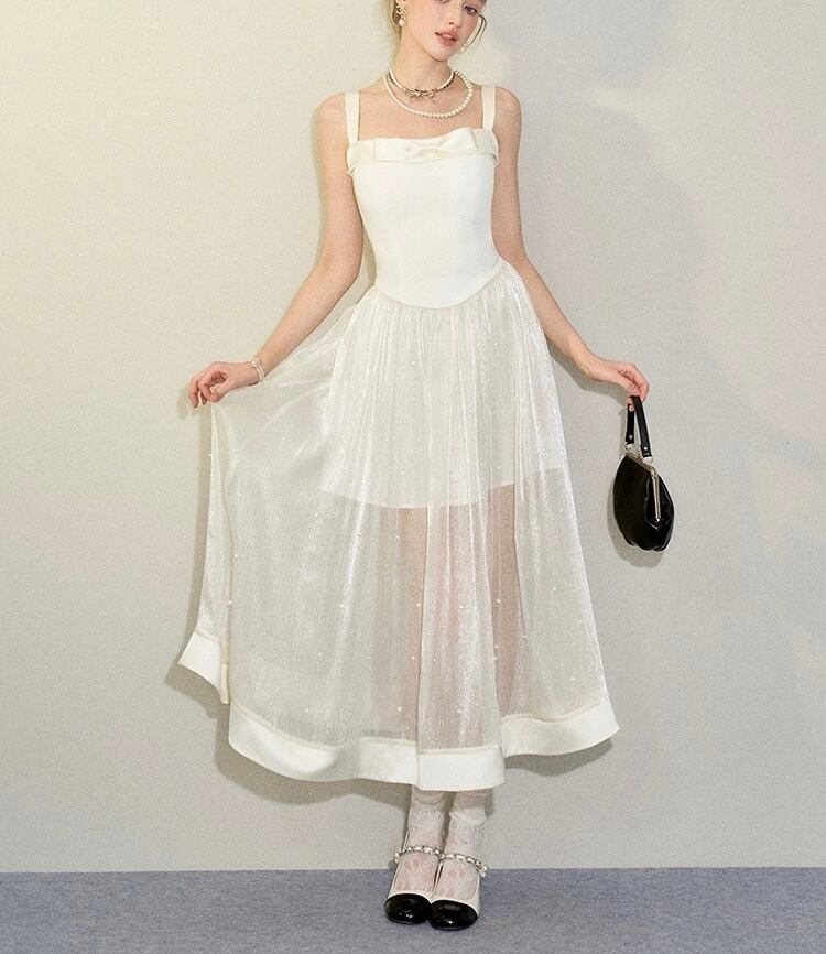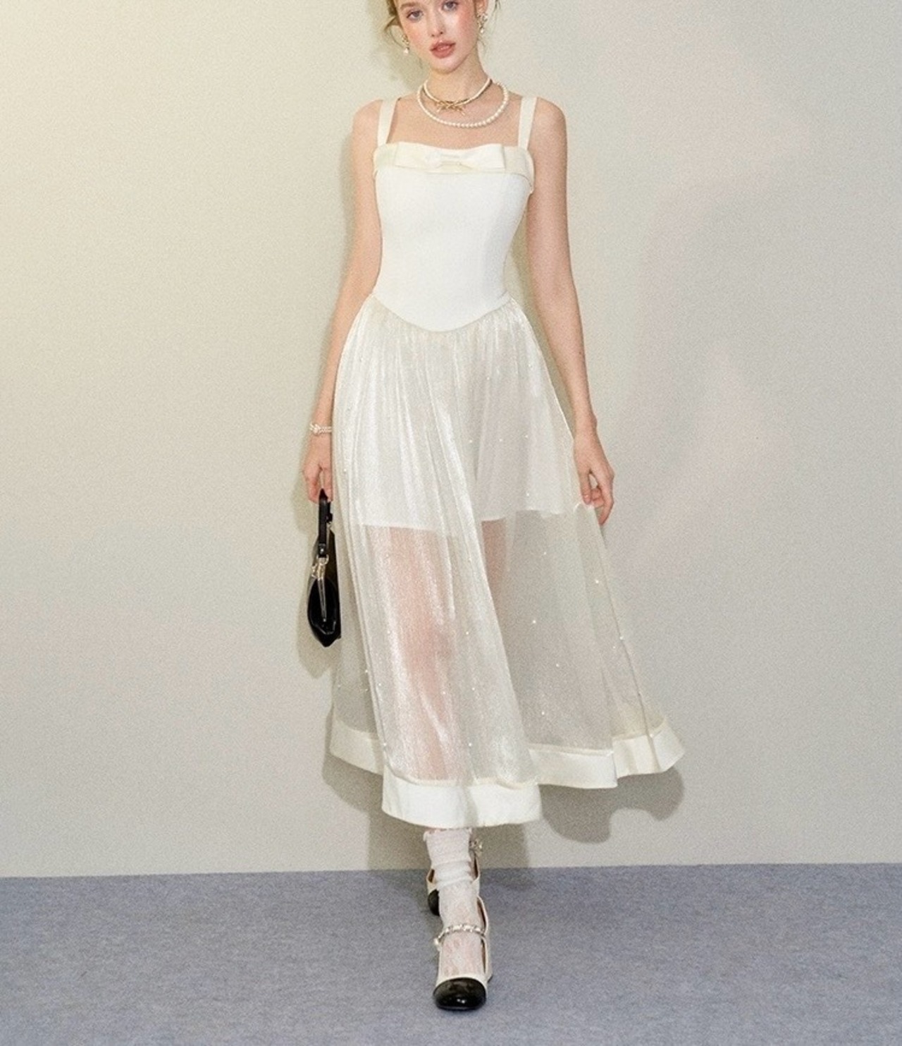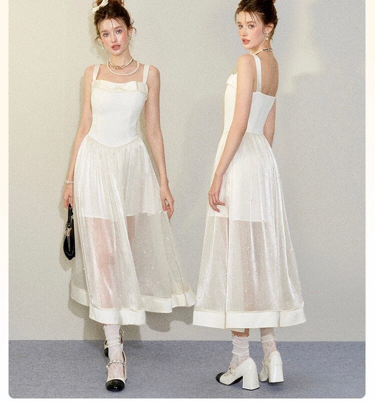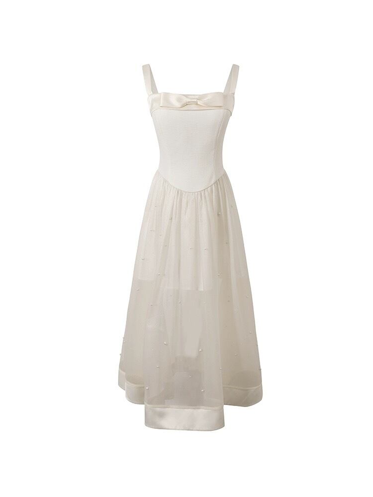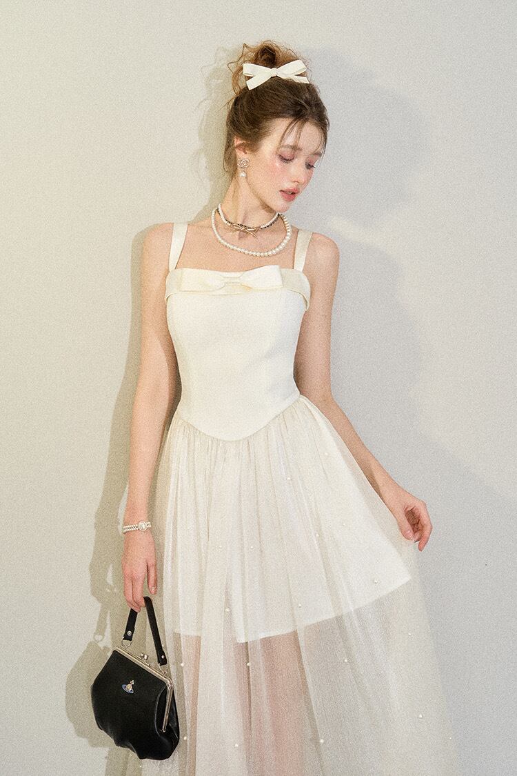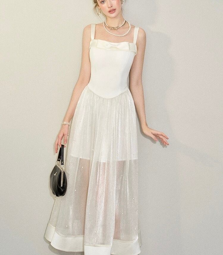 白 ホワイト 可愛い リボン パール マキシ ワンピース