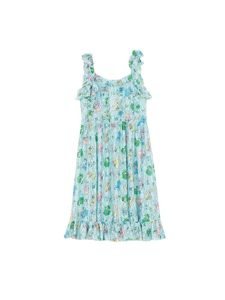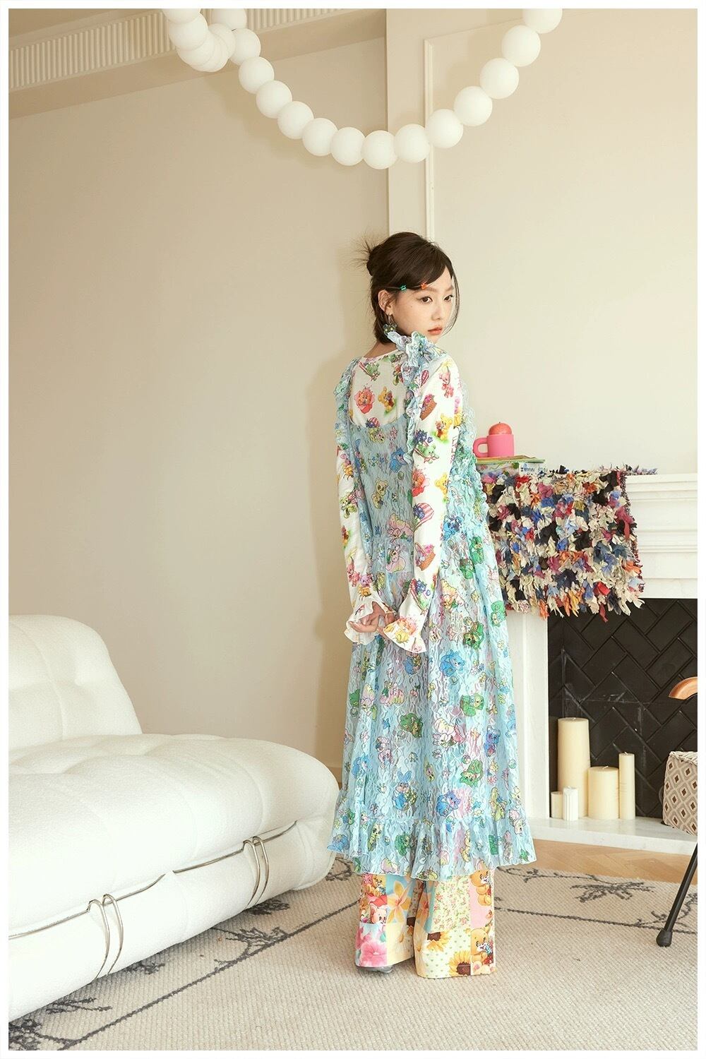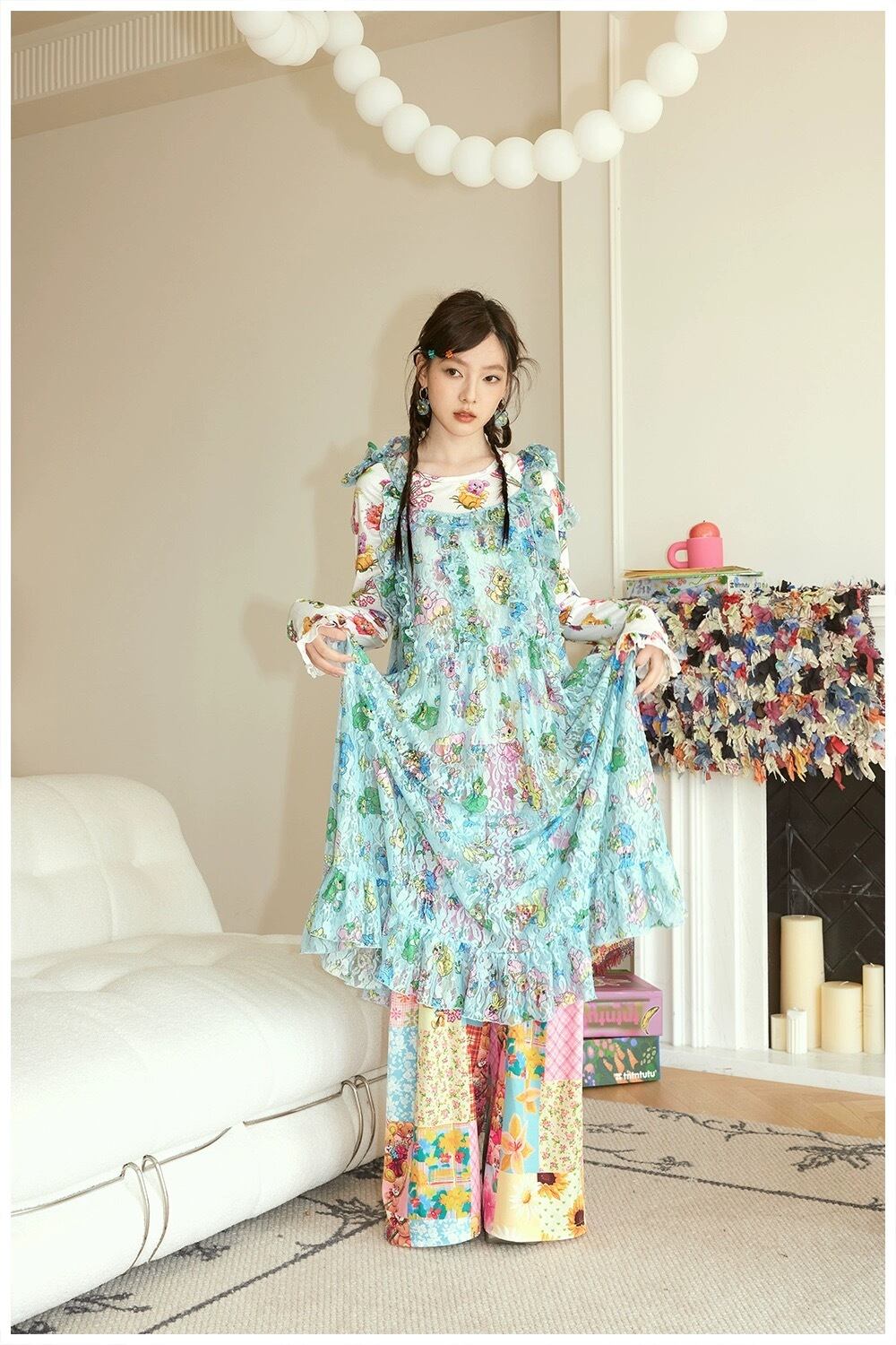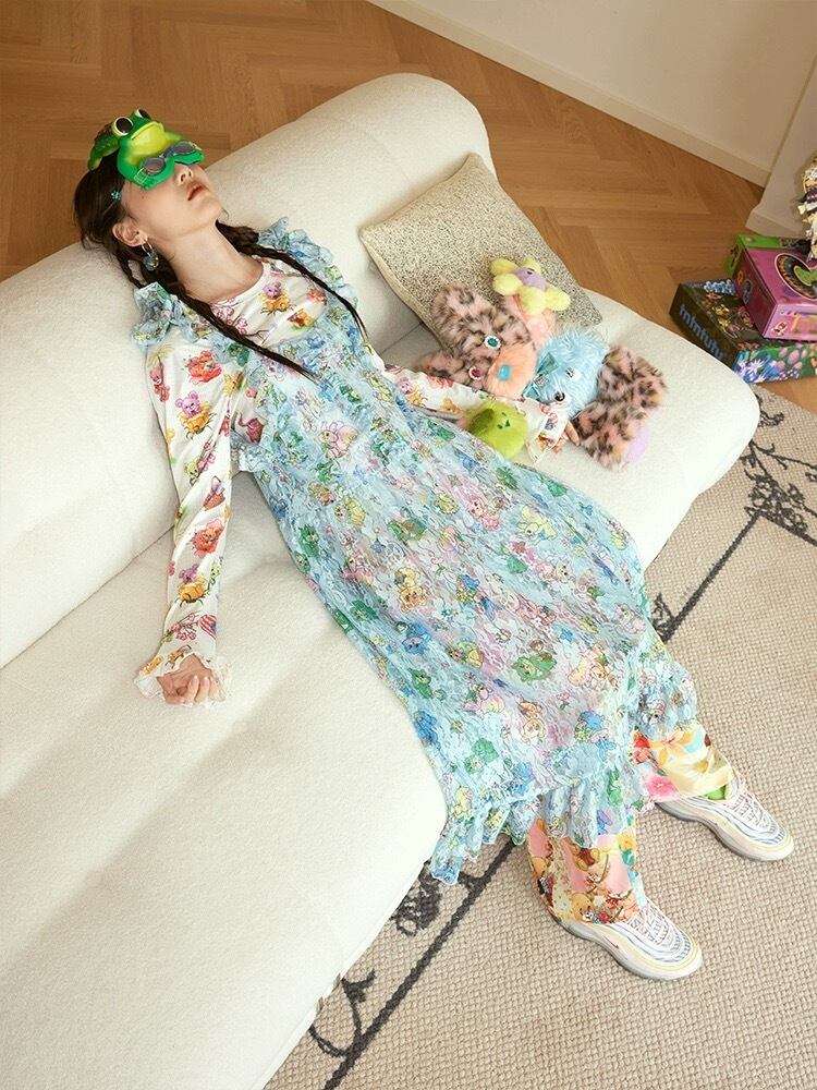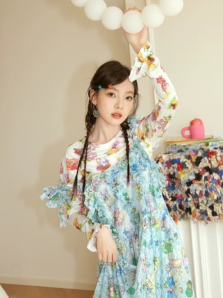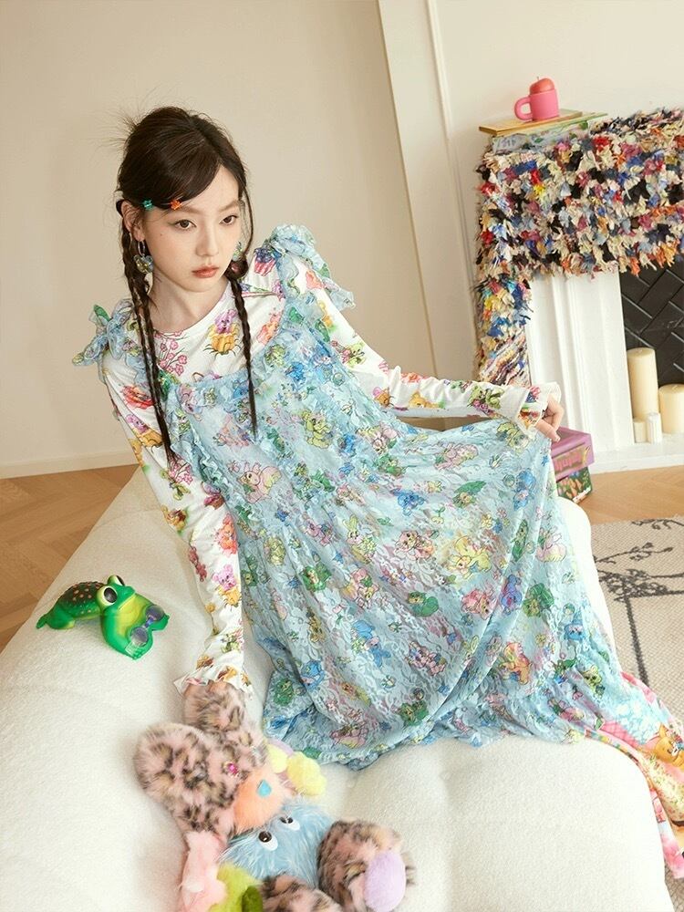 水色 可愛い ワンピース ブラウス 重ね着 黄色
