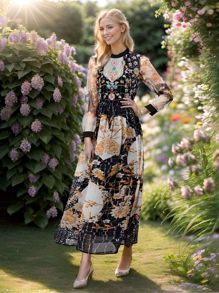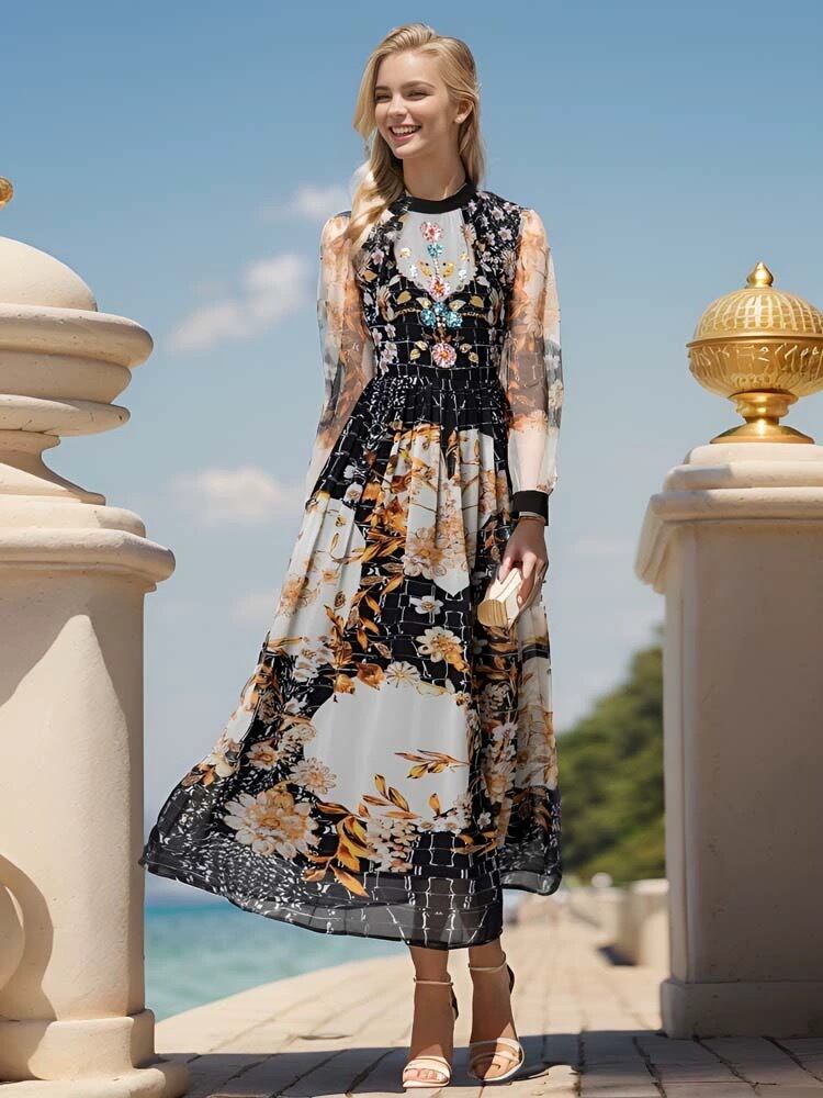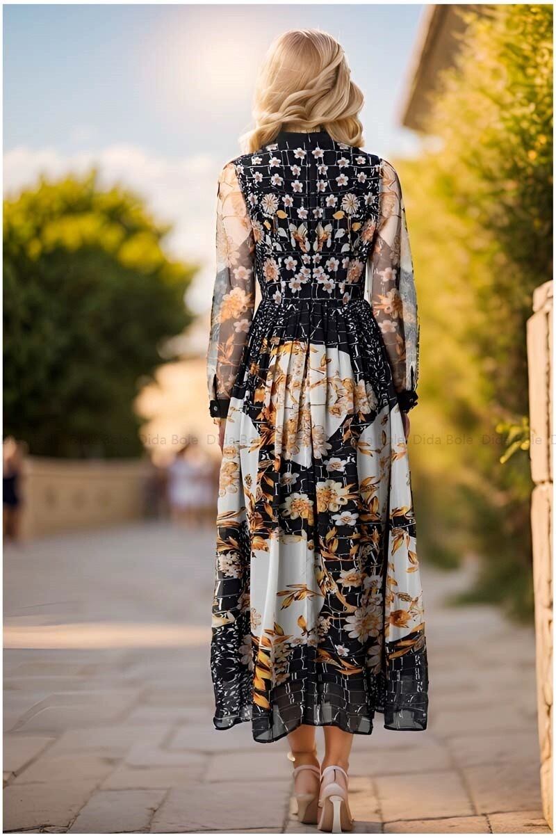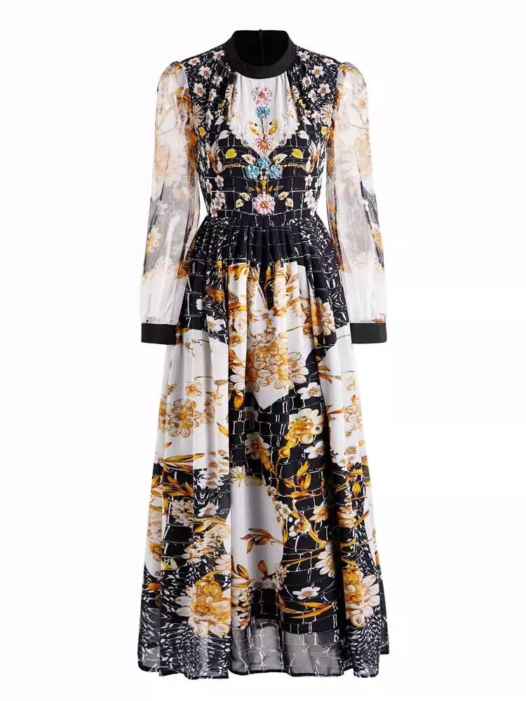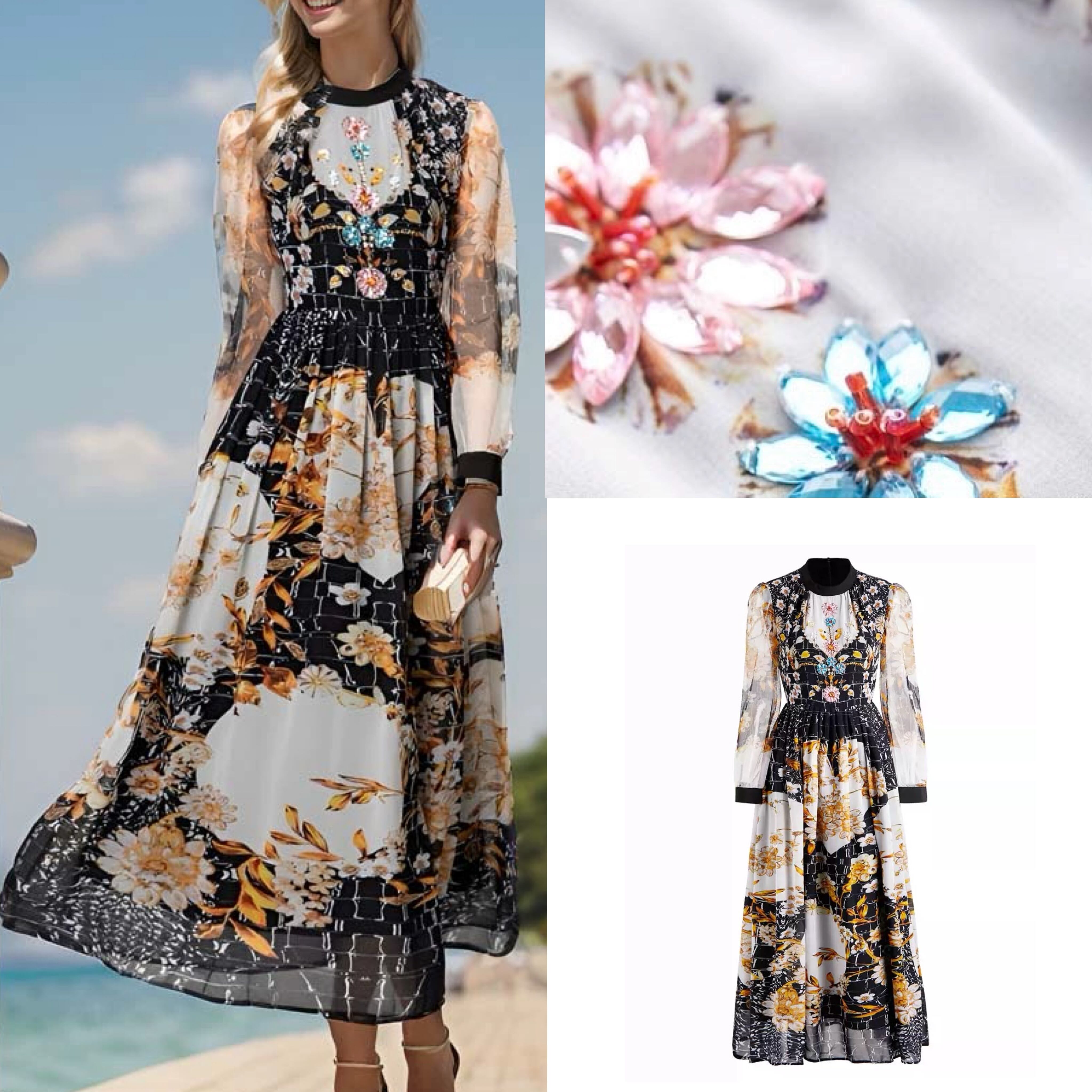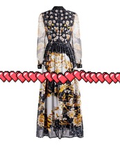 デコレーション 花柄 カラフル 黄色 黒 ワンピース 2XL
