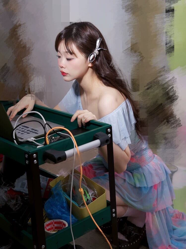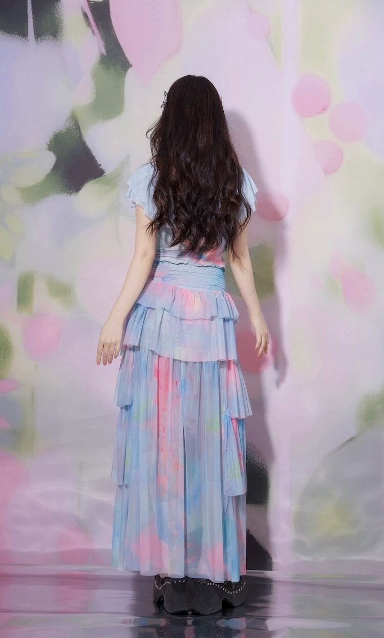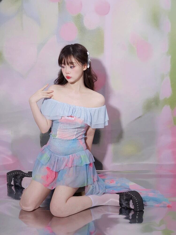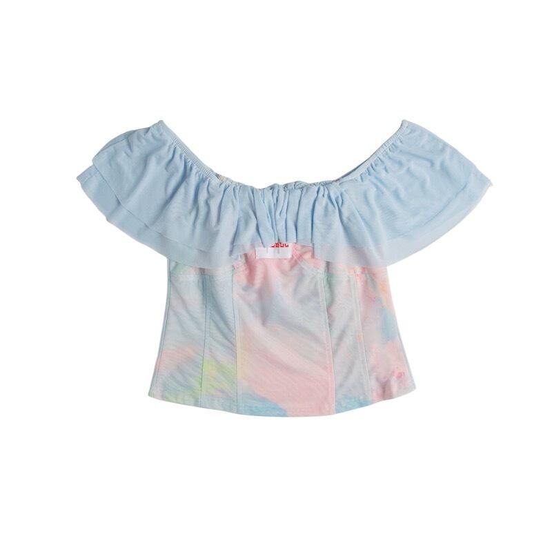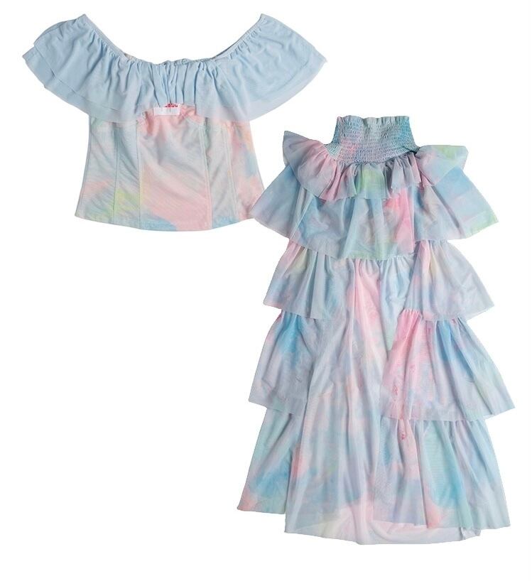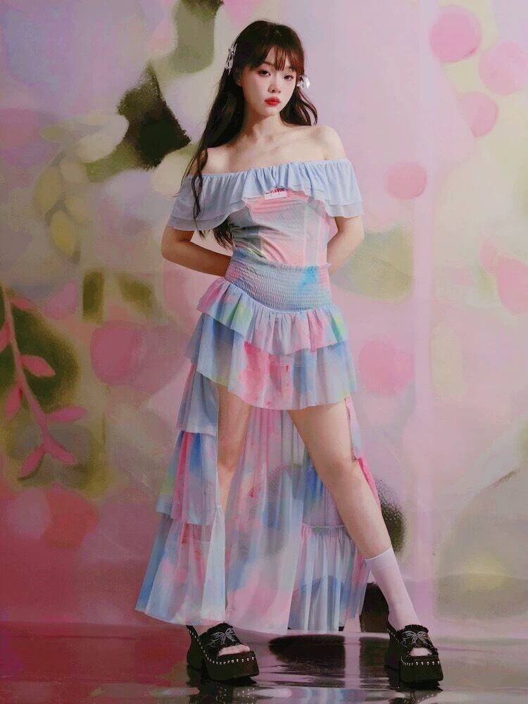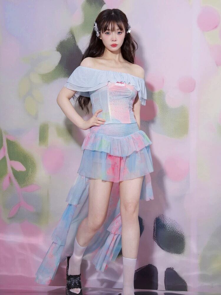 【セットアップ】水色 ブラウス オフショルダー ワンピース ピンク グラデーション
