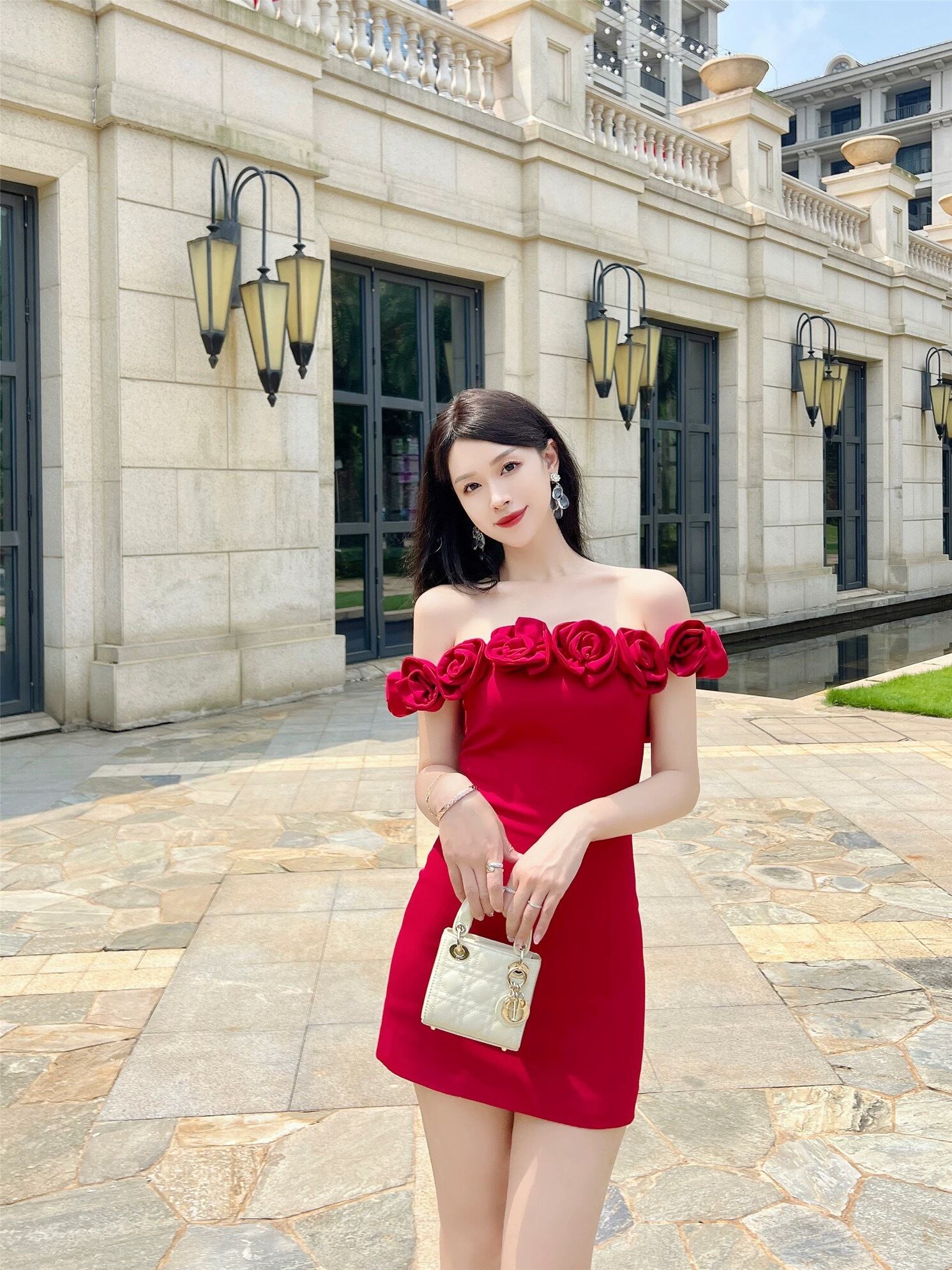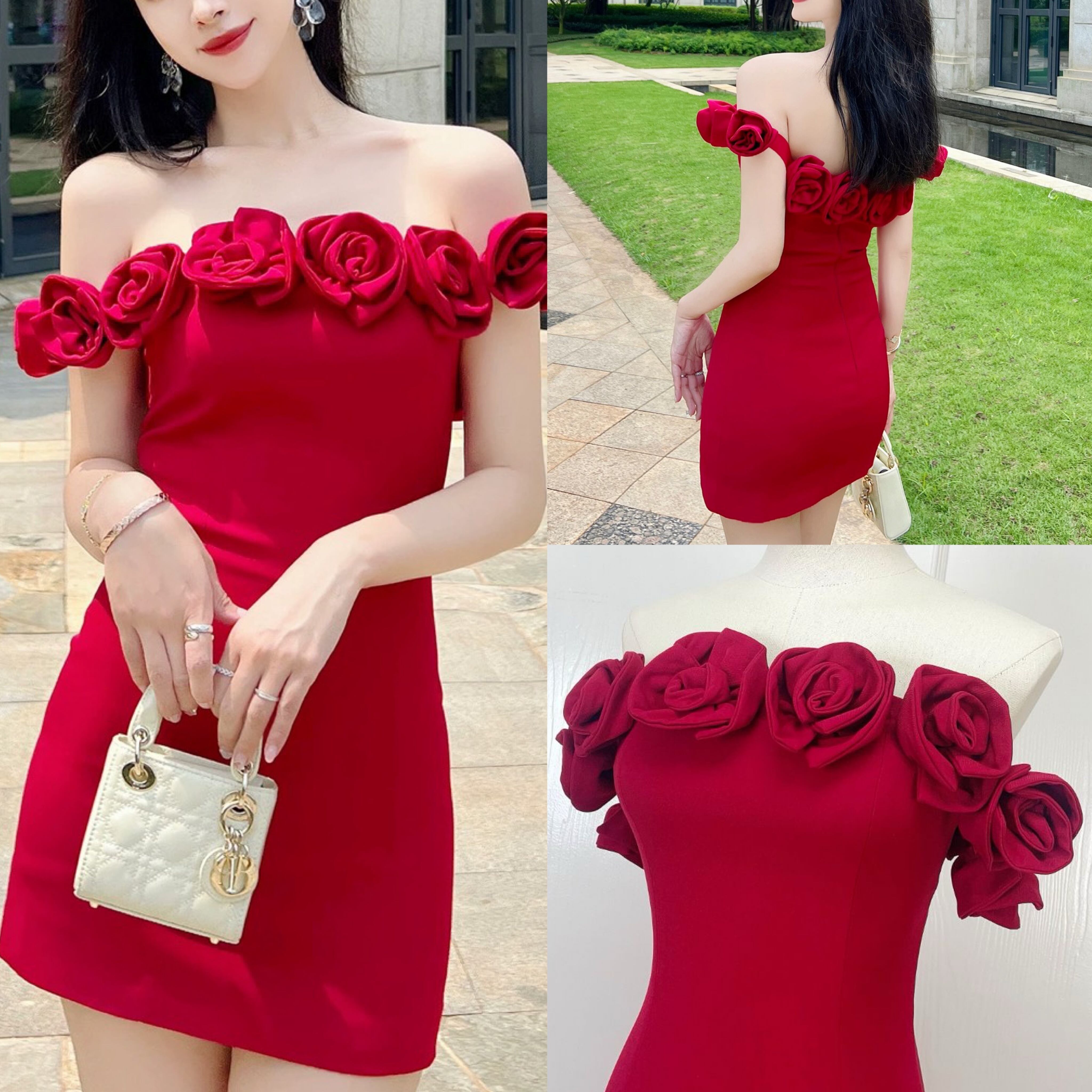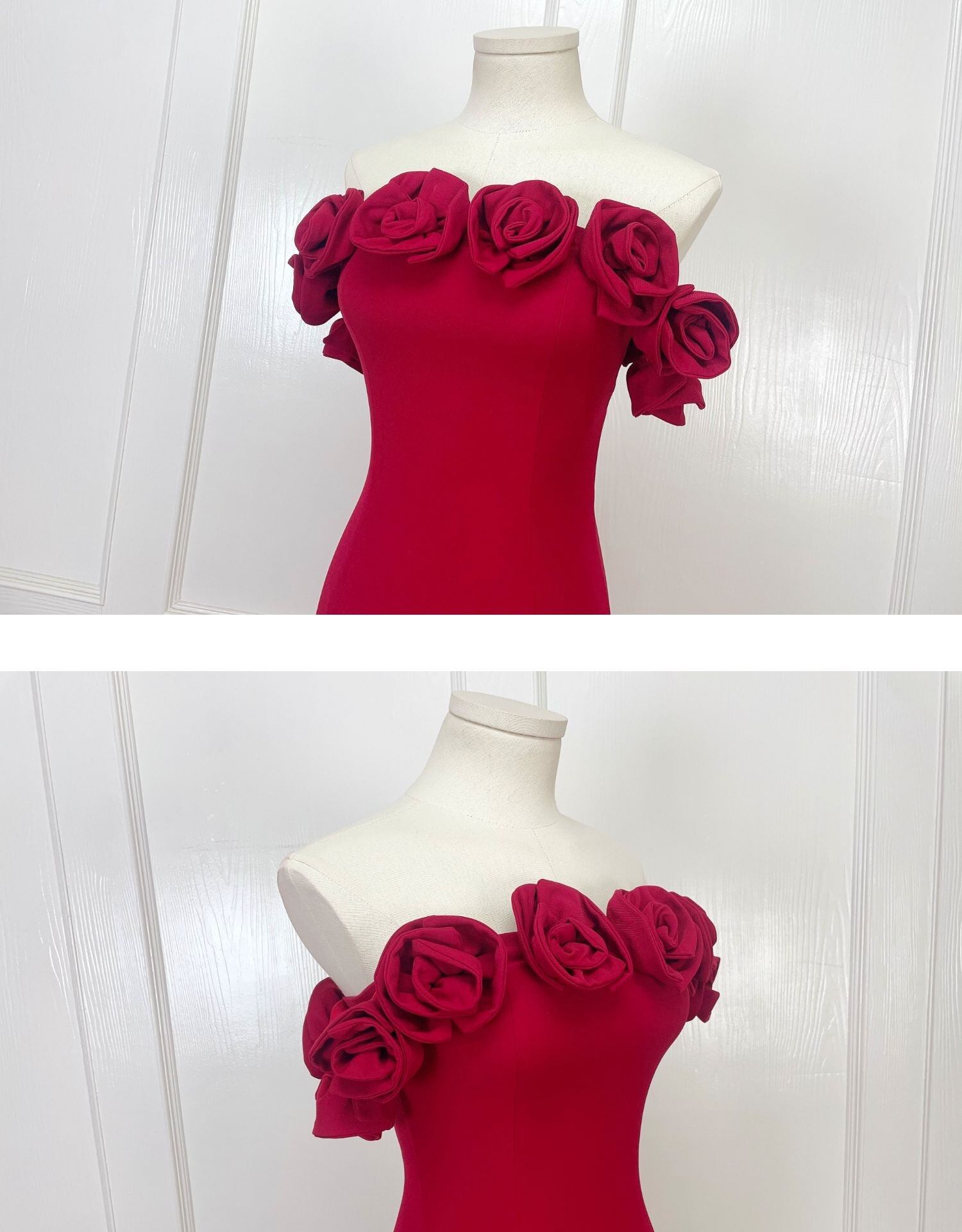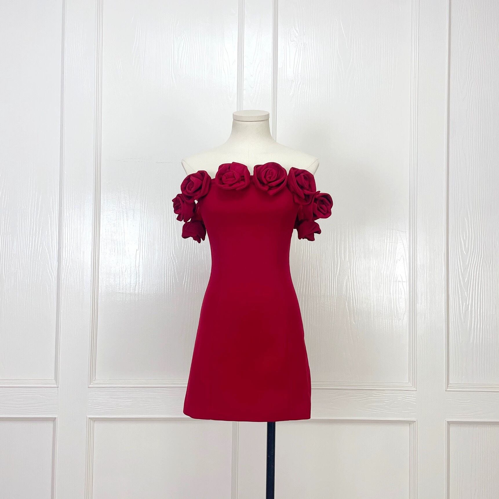 赤 バラ フラワー 薔薇 フラワー ベアトップ ワンピース ドレス