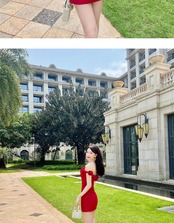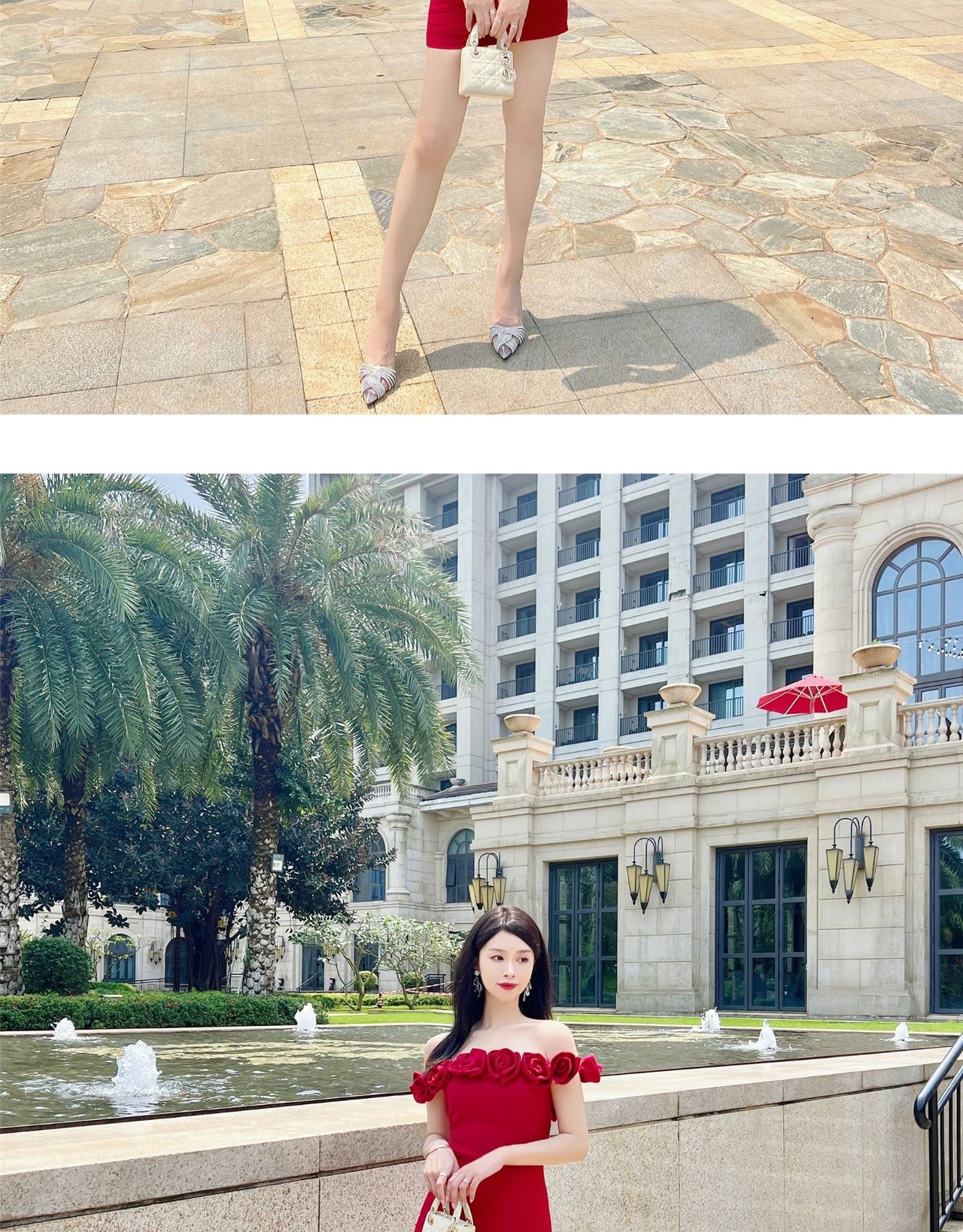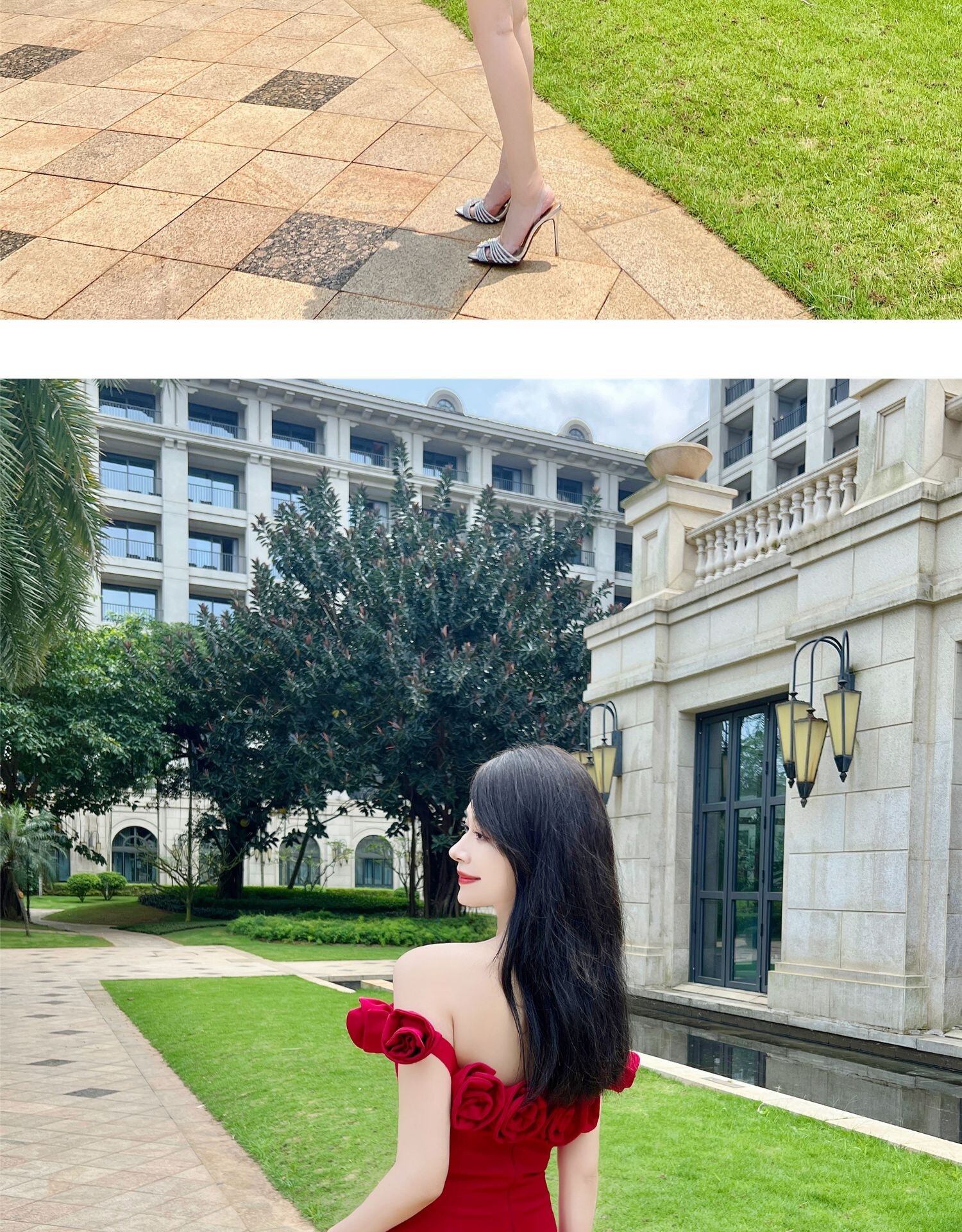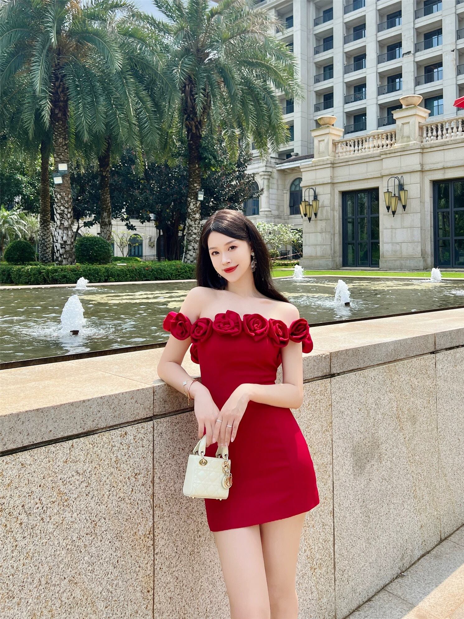 赤 バラ フラワー 薔薇 フラワー ベアトップ ワンピース ドレス