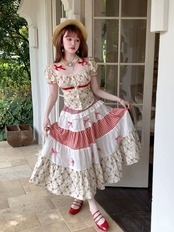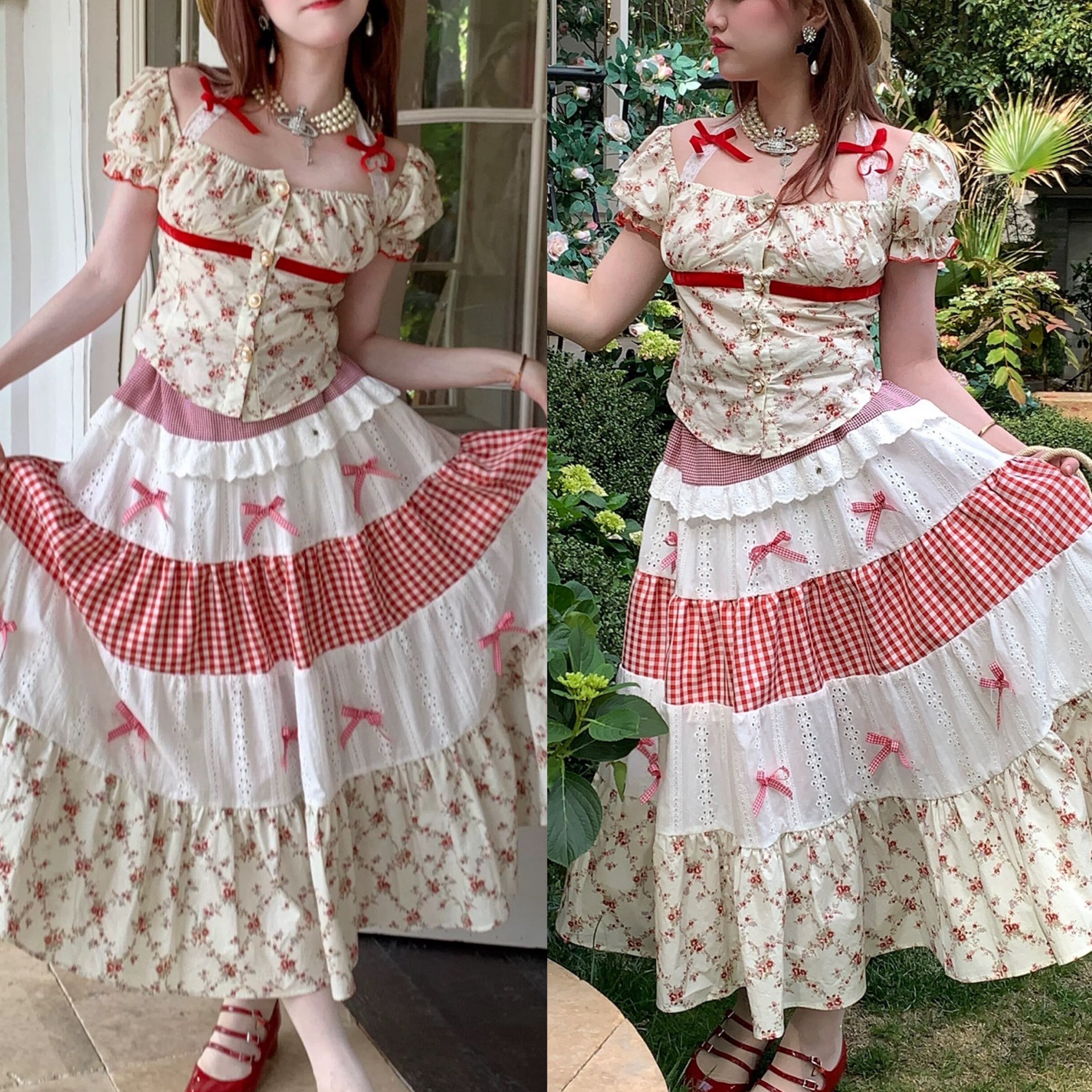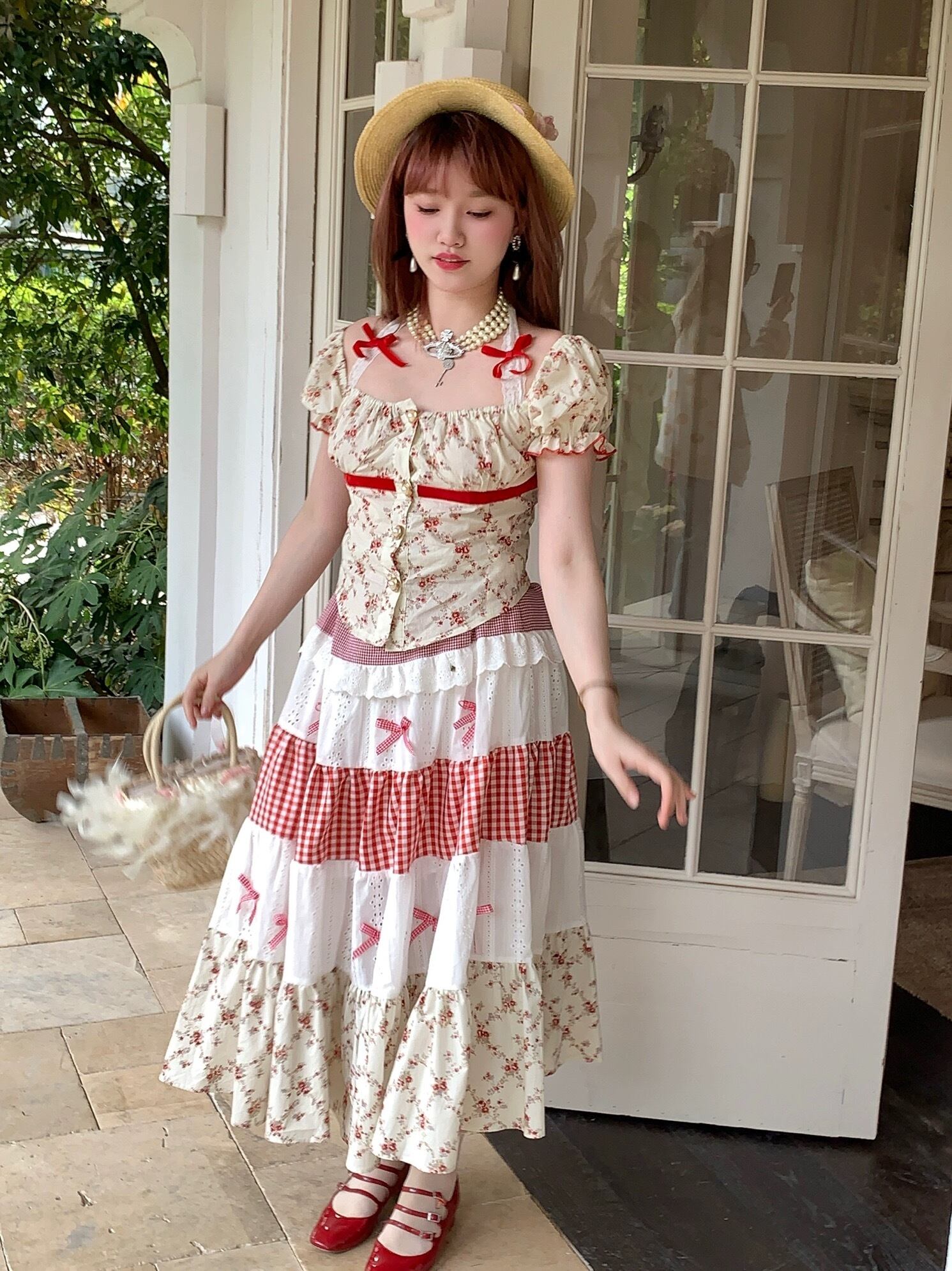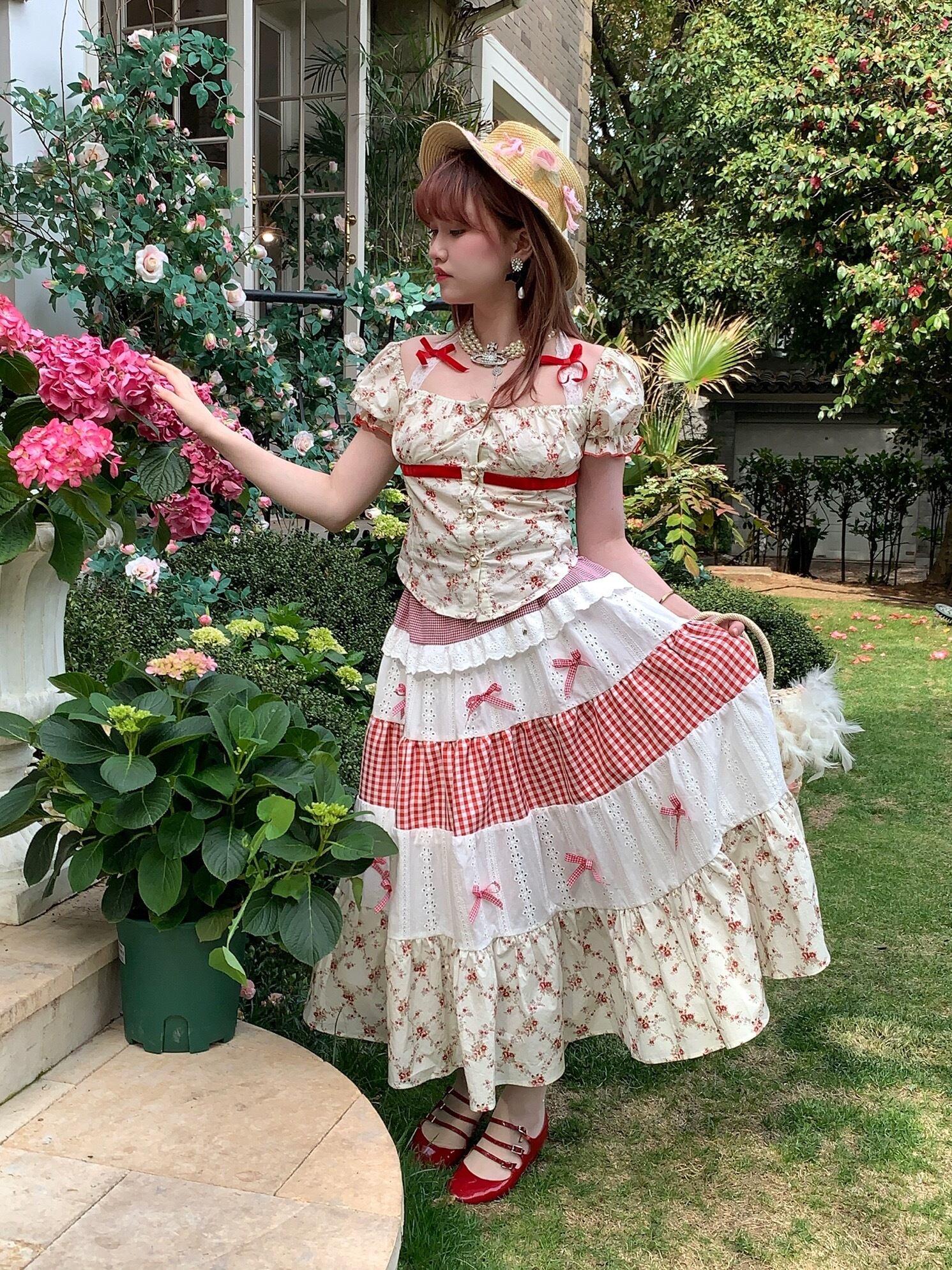 【セットアップ】赤 花柄 チェック スカート リボン ブラウス
