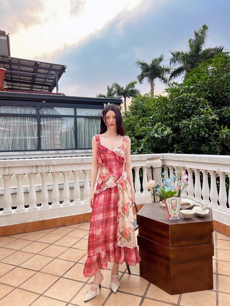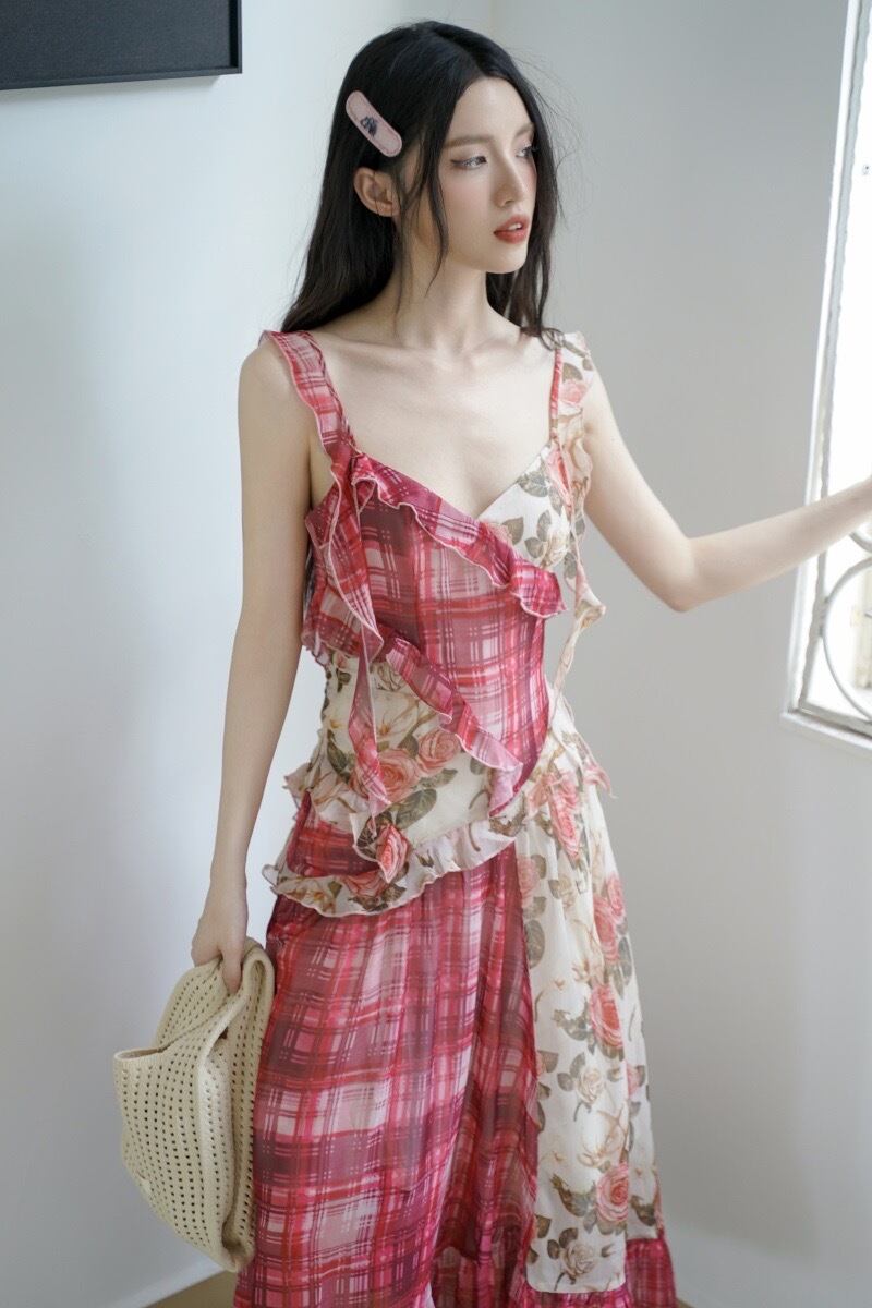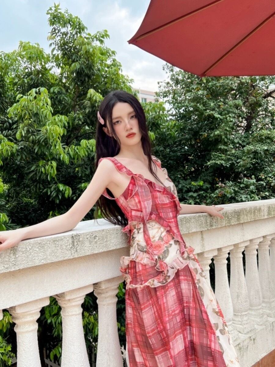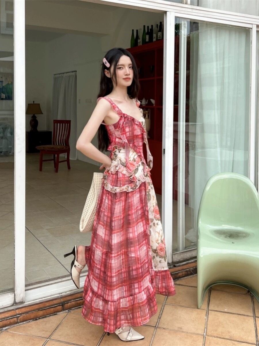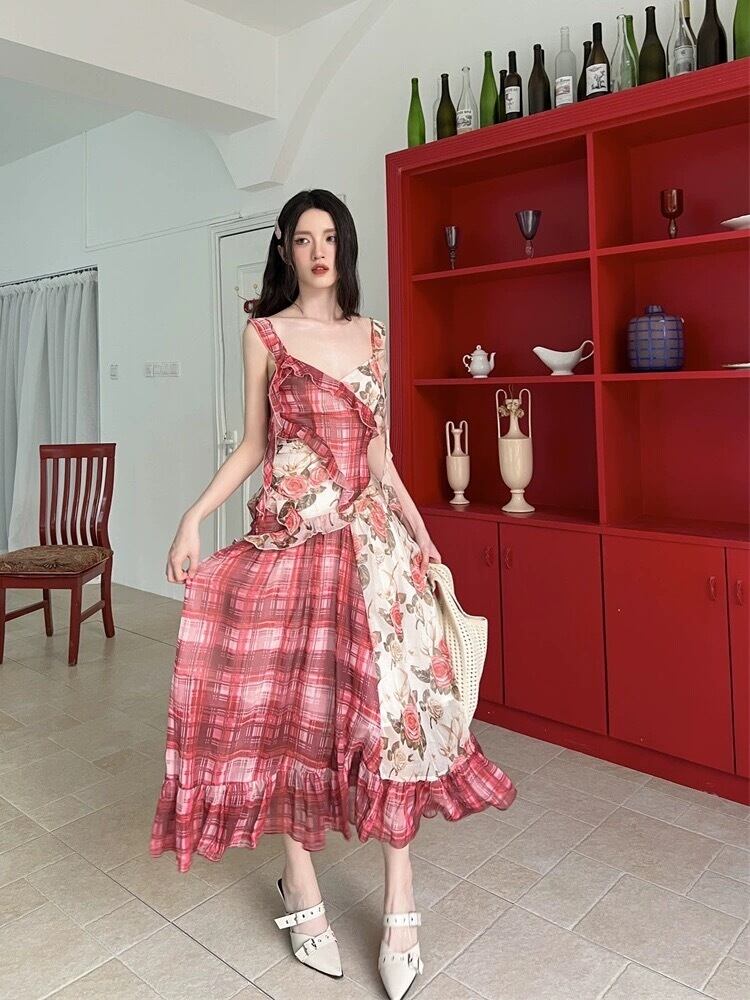 赤 チェック 花柄 ガーリー ピンク リボン ワンピース