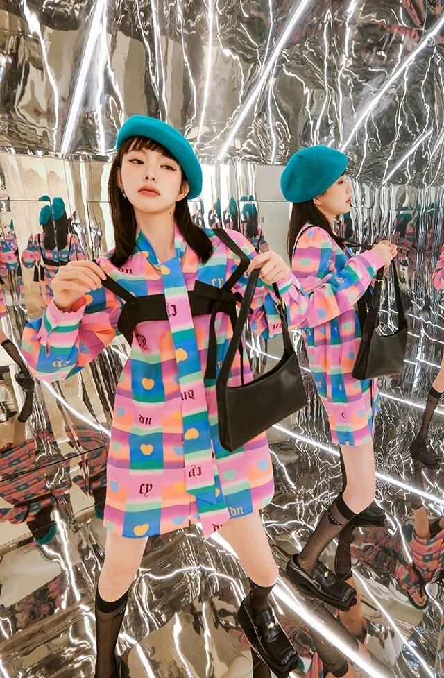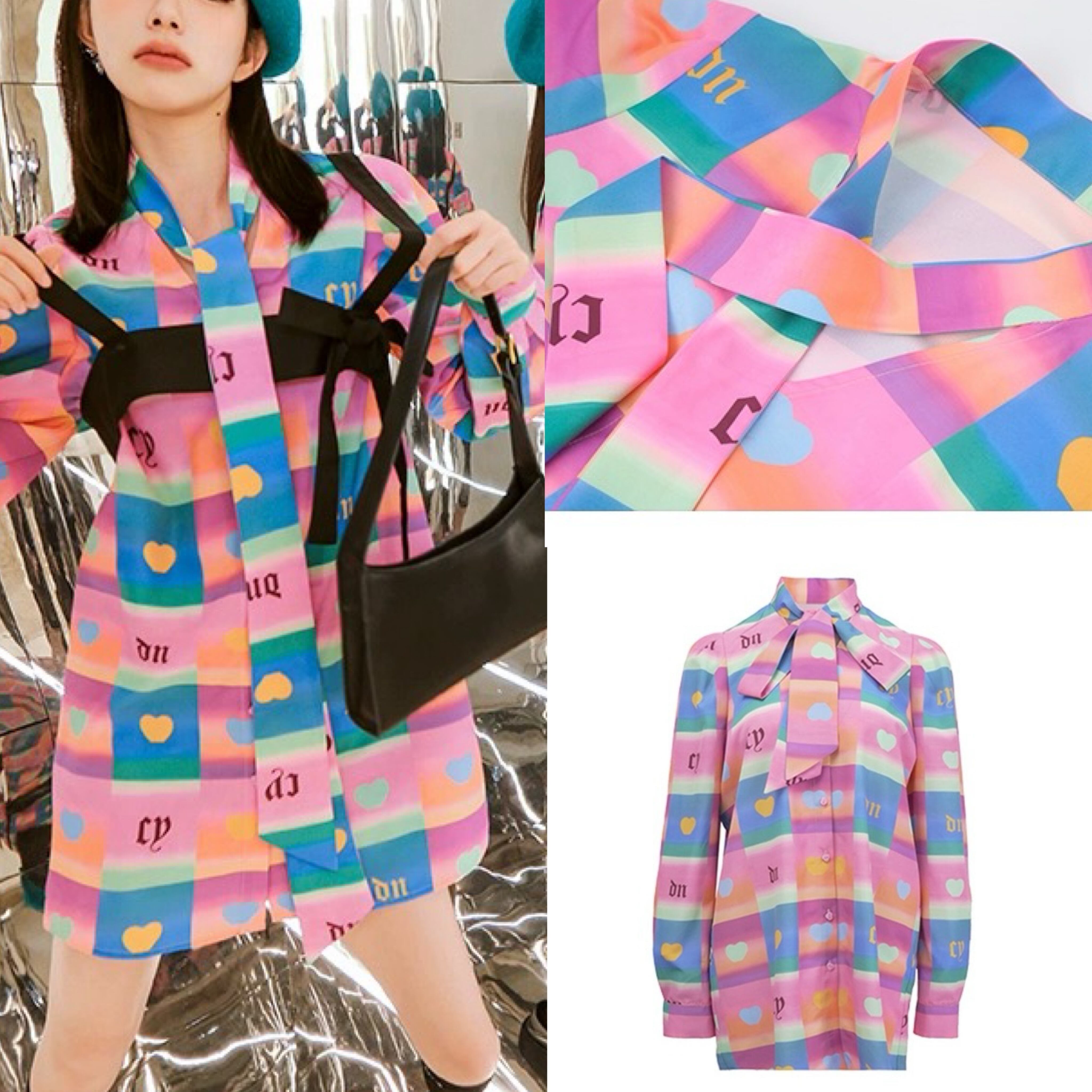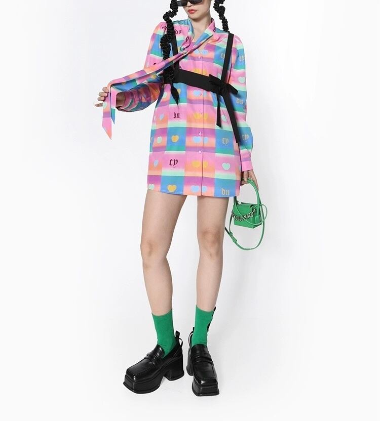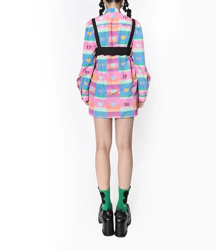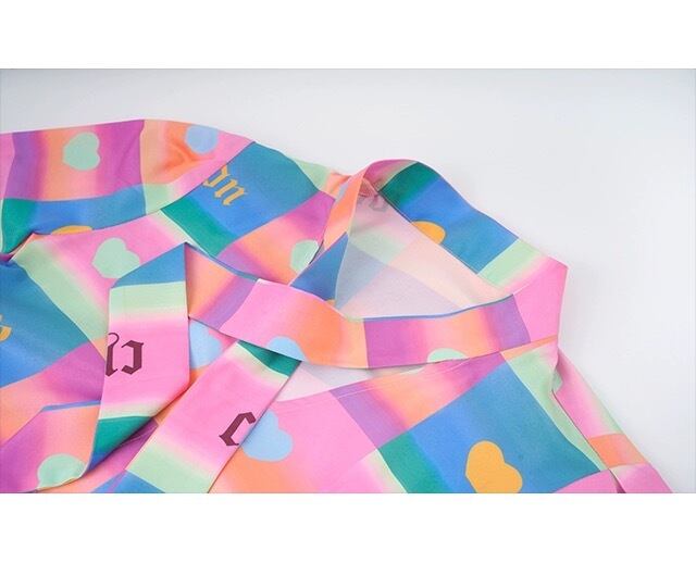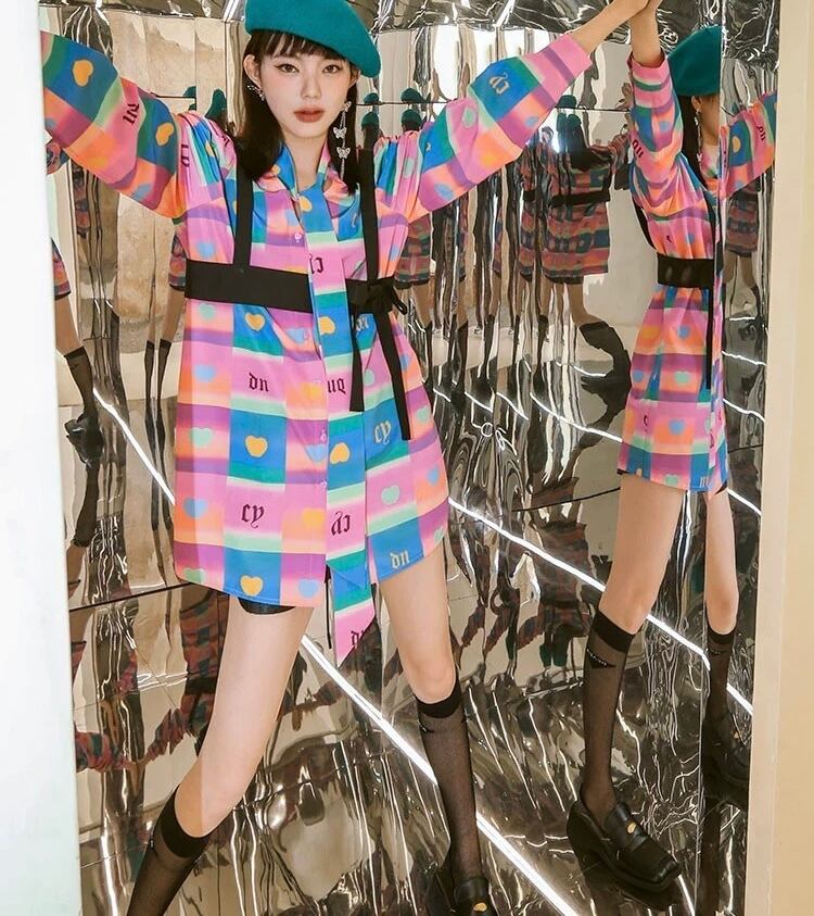 カラフル チェック ピンク オレンジ ハート カジュアル ブラウス
